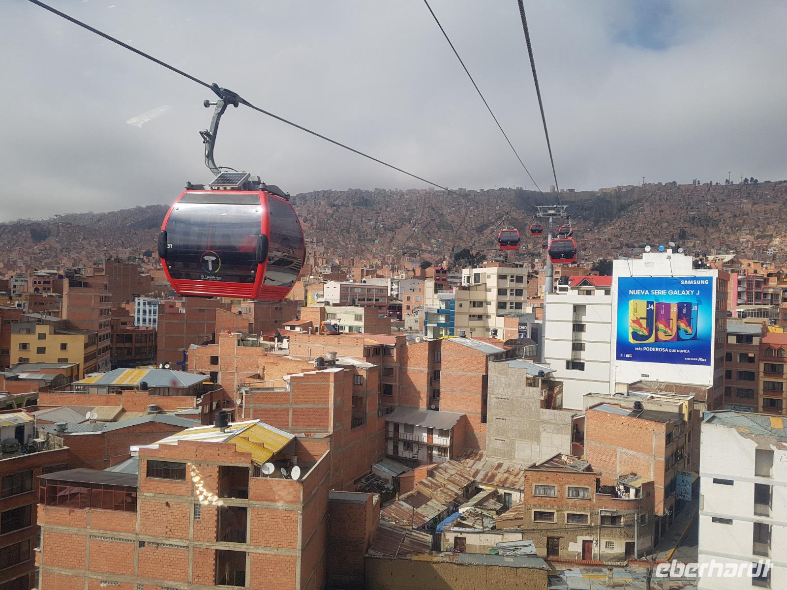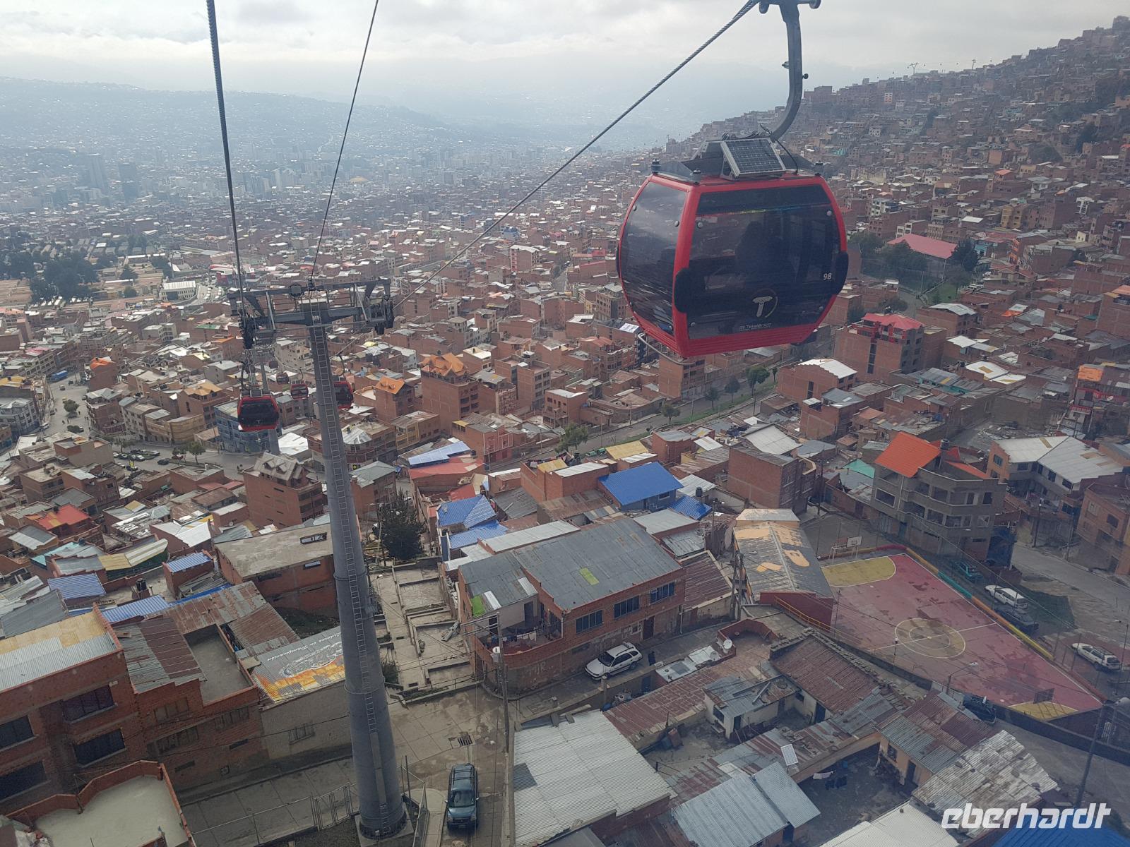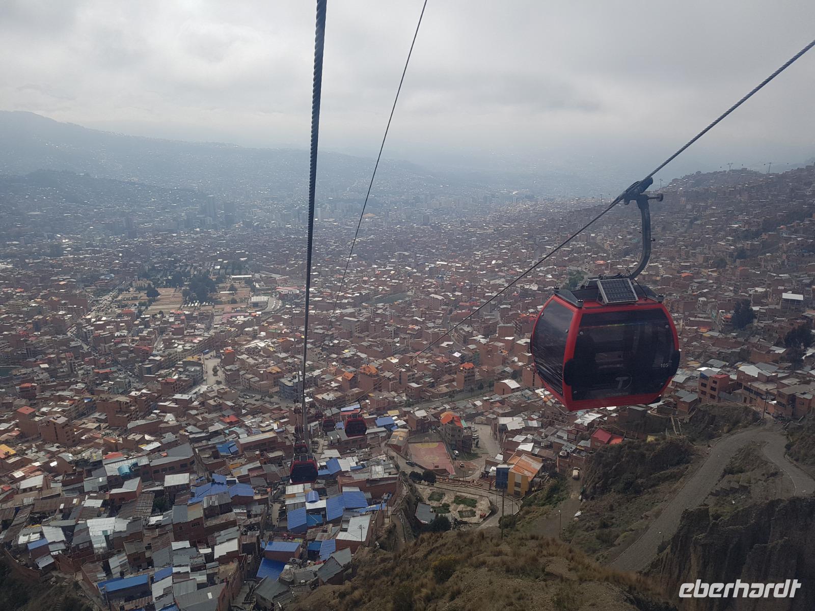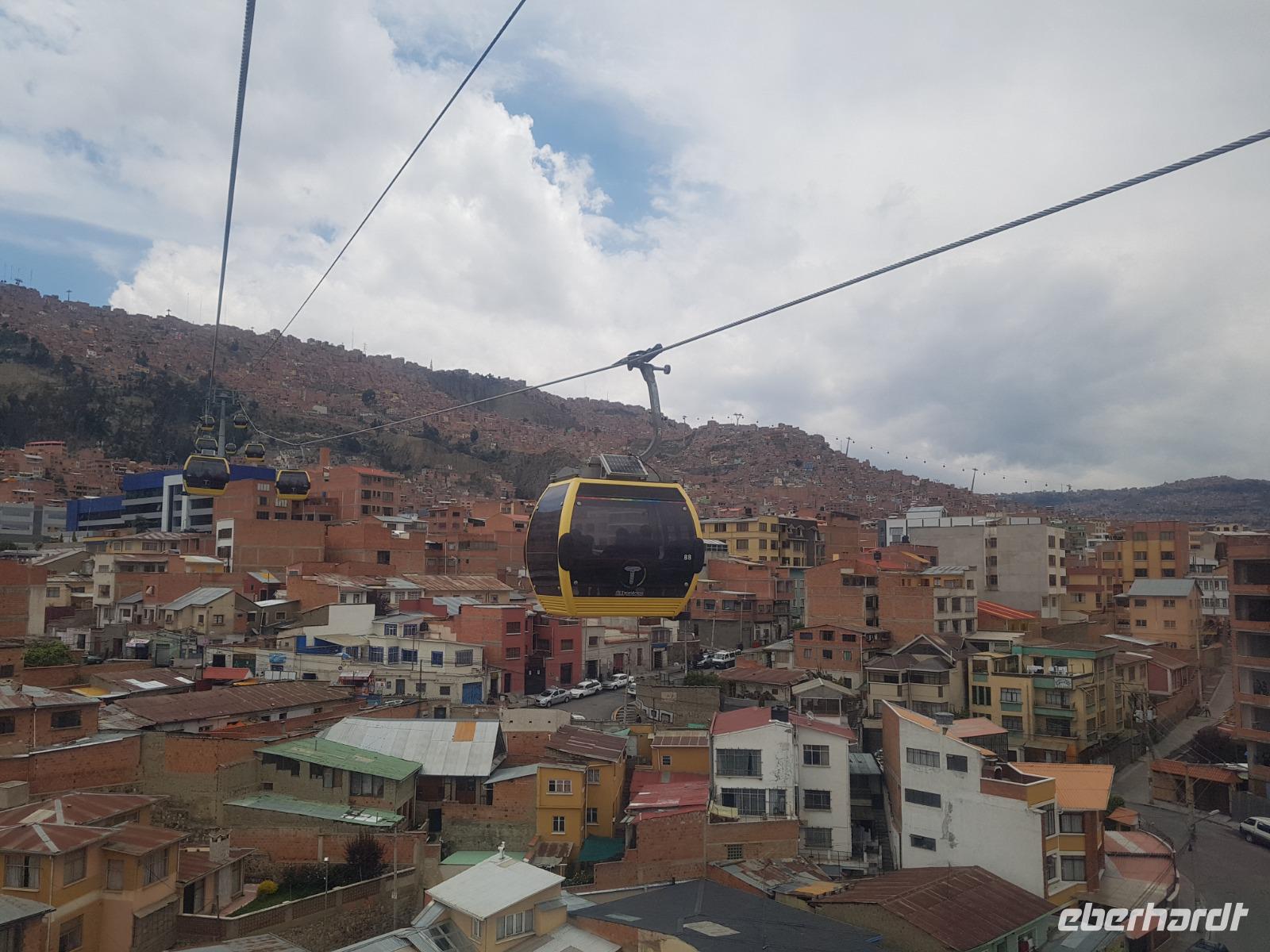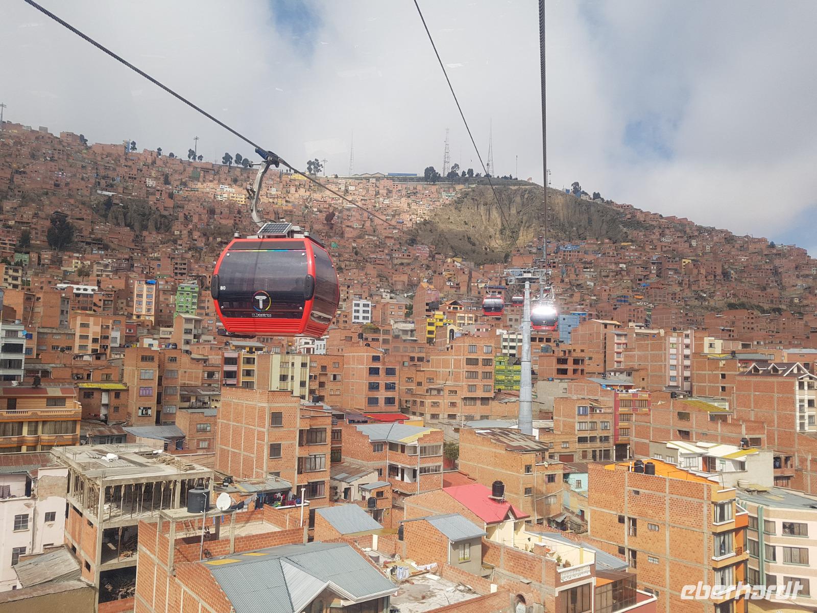 Wir können heute gut schlafen und gemütlich frühstücken, da wir erst um 8.30 Uhr zum Flughafen gebracht werden. Anschließend geht es mit dem Flugzeug nach La Paz. Wir verabschieden uns heute von Cesar und Gustavo, die zwei Jeep-Fahrer, die uns ganz toll und sicher über den Salzsee und die Wüste gefahren haben. Wir sagen DANKE. Nach diesen beeindruckenden Tagen im unberührten Andenhochland erreichen wir den Regierungssitz Boliviens, La Paz, das am Fuße des Berges Illimani gelegen ist. Wir fliegen wieder über den Salzsee und können es kaum glauben, dass wir selbst dort waren. Aus dem Flieger können wir die herrliche Landschaft unter uns betrachten. Mit einer Stunde Verspätung landen wir mittags am Flughafen in La Paz, der sich auf über 4000 Metern befindet. In La Paz angekommen, wartete gleich eine tolle Überraschung auf uns. Um von der Stadt einen guten Eindruck zu bekommen, fuhren wir mit der Seilbahn einmal quer über La Paz. Mit der gelben und grünen Seilbahnlinie ging es von einem der höchsten Punkte der Stadt nun nach unten ins Stadtzentrum. Unten angekommen wartete Moises auf uns, der für uns ein typisch bolivianisches Essen zubereitete. Wir aßen die leckeren gefüllten Teigtaschen und hatten dabei eine wunderschöne Aussicht auf das "Valle de la Luna" (oder Mondtal).