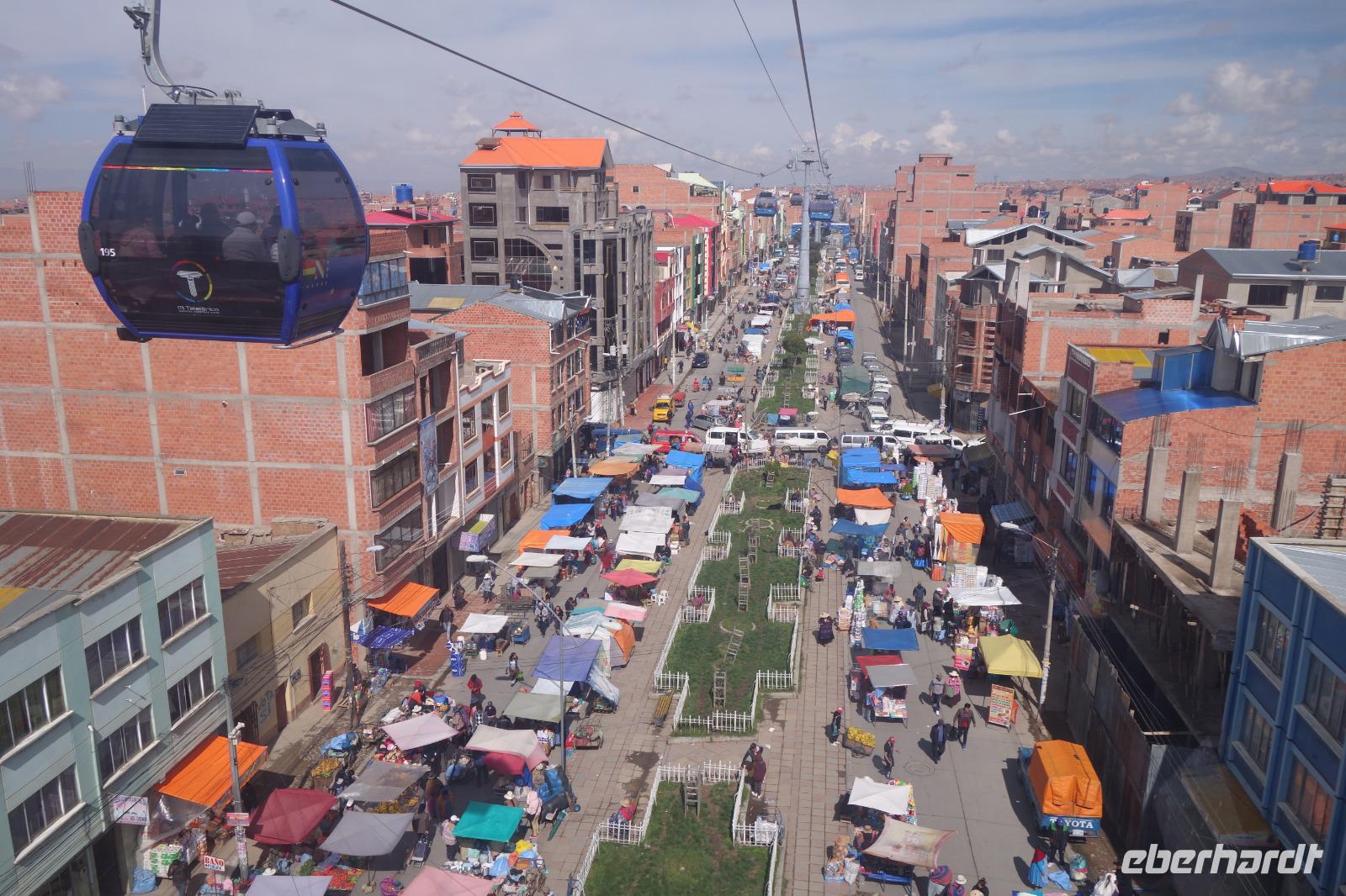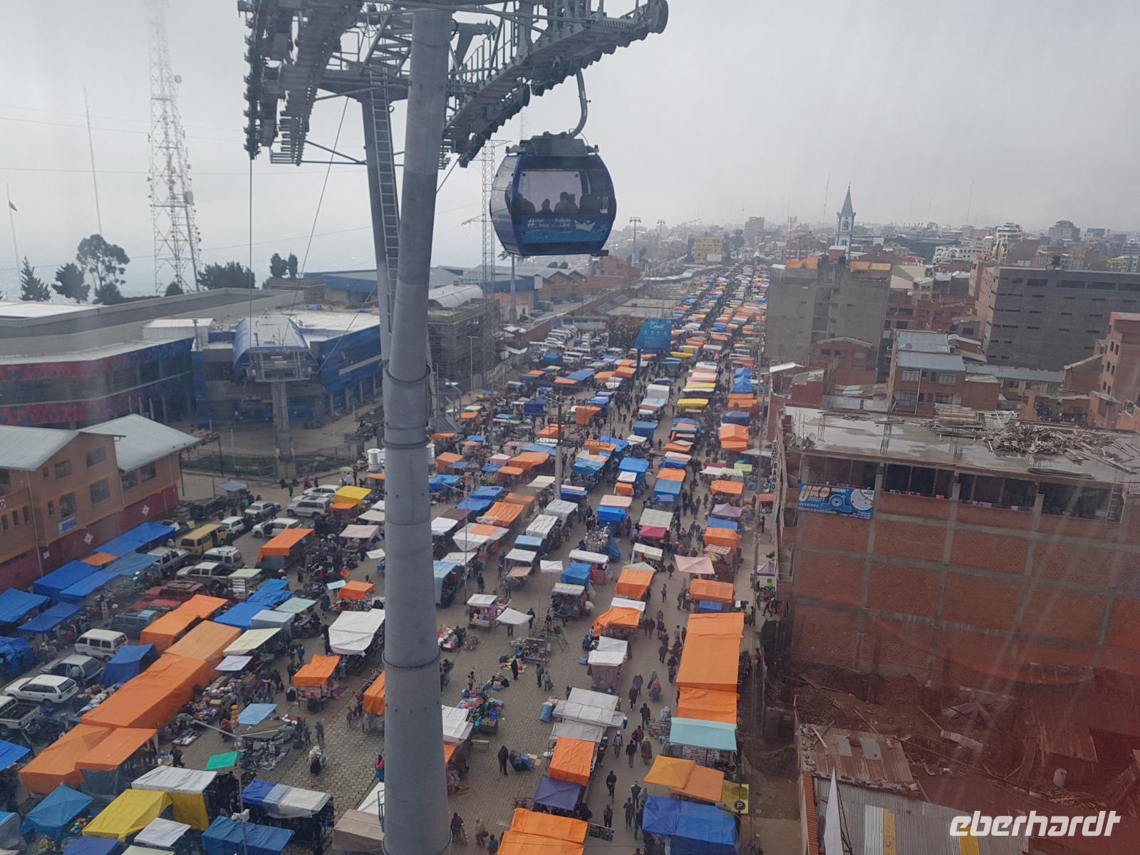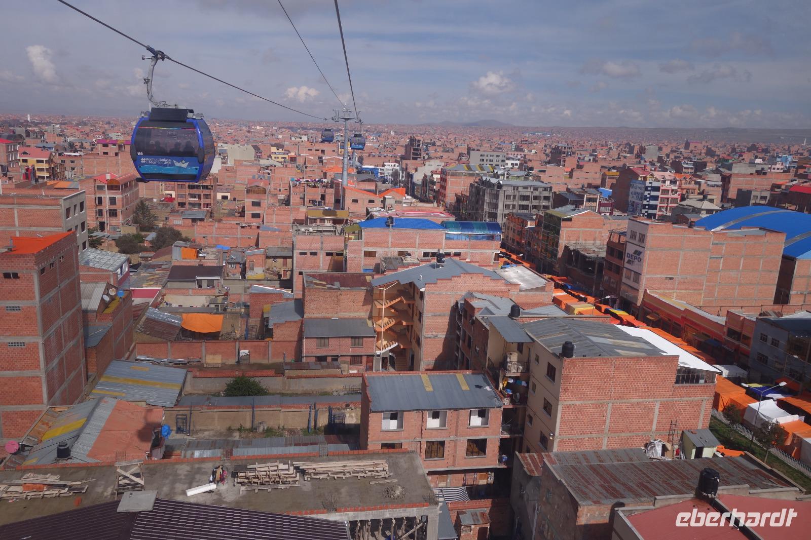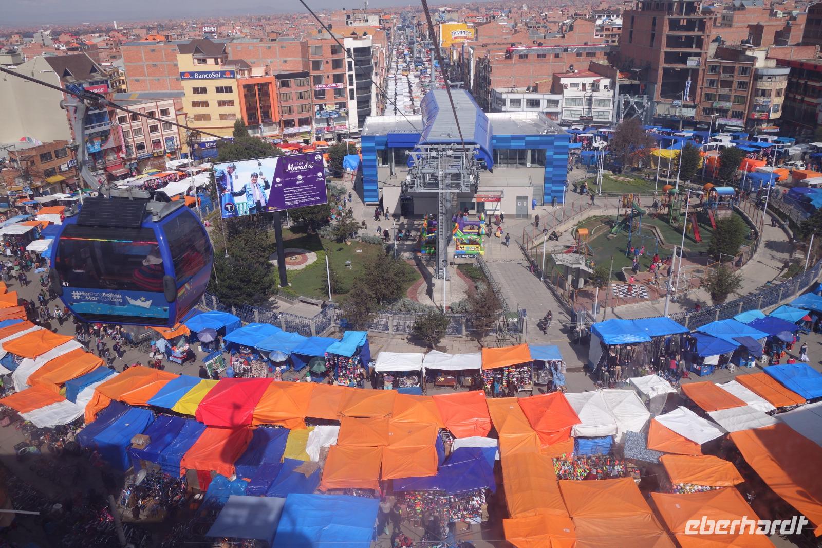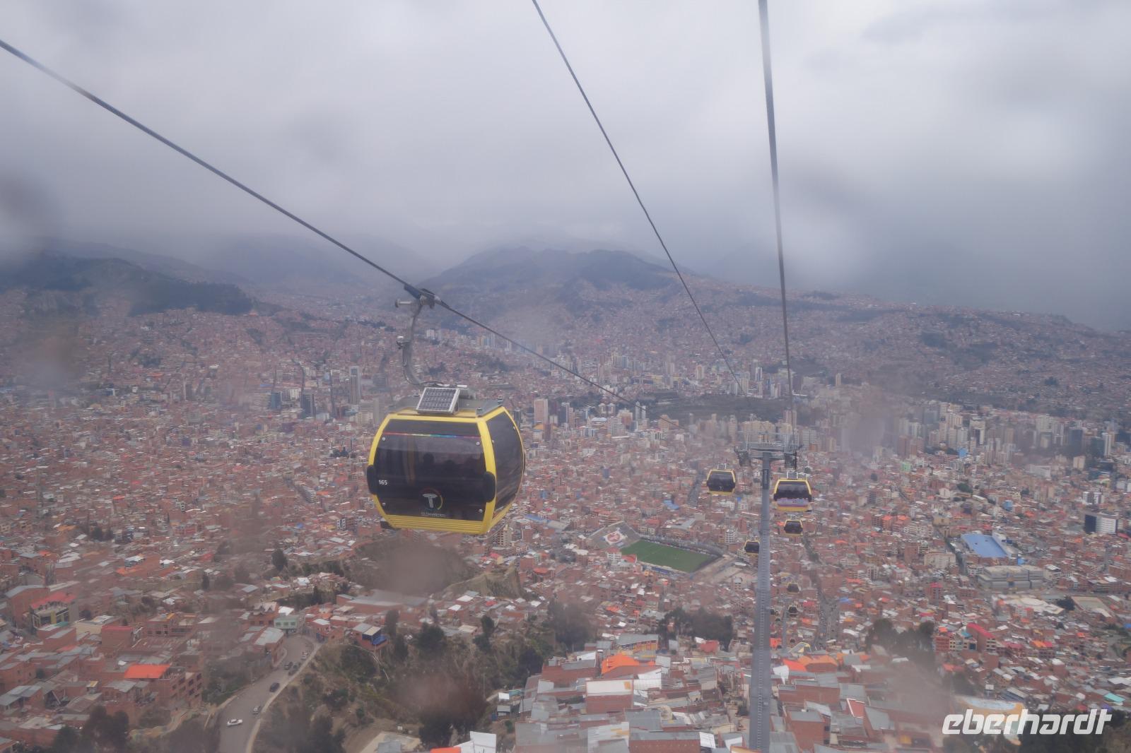 Wir können heute gut schlafen und gemütlich frühstücken, da wir erst um 8.30 Uhr zum Flughafen gebracht werden. Anschließend geht es mit dem Flugzeug nach La Paz. Wir verabschieden uns heute von Cesar und Gustavo, die zwei Jeep-Fahrer, die uns ganz toll und sicher über den Salzsee und die Wüste gefahren haben. Wir sagen DANKE. Nach diesen beeindruckenden Tagen im unberührten Andenhochland erreichen wir den Regierungssitz Boliviens, La Paz, das am Fuße des Berges Illimani gelegen ist. Wir fliegen wieder über den Salzsee und können es kaum glauben, dass wir selbst dort waren. Aus dem Flieger können wir die herrliche Landschaft unter uns betrachten. Mit einer Stunde Verspätung landen wir mittags am Flughafen in La Paz, der sich auf über 4000 Metern befindet. In La Paz angekommen, wartete gleich eine tolle Überraschung auf uns. Um von der Stadt einen guten Eindruck zu bekommen, fuhren wir mit der Seilbahn einmal quer über La Paz. Mit der gelben und grünen Seilbahnlinie ging es von einem der höchsten Punkte der Stadt nun nach unten ins Stadtzentrum. Unten angekommen wartete Moises auf uns, der für uns ein typisch bolivianisches Essen zubereitete. Wir aßen die leckeren gefüllten Teigtaschen und hatten dabei eine wunderschöne Aussicht auf das "Valle de la Luna" (oder Mondtal).