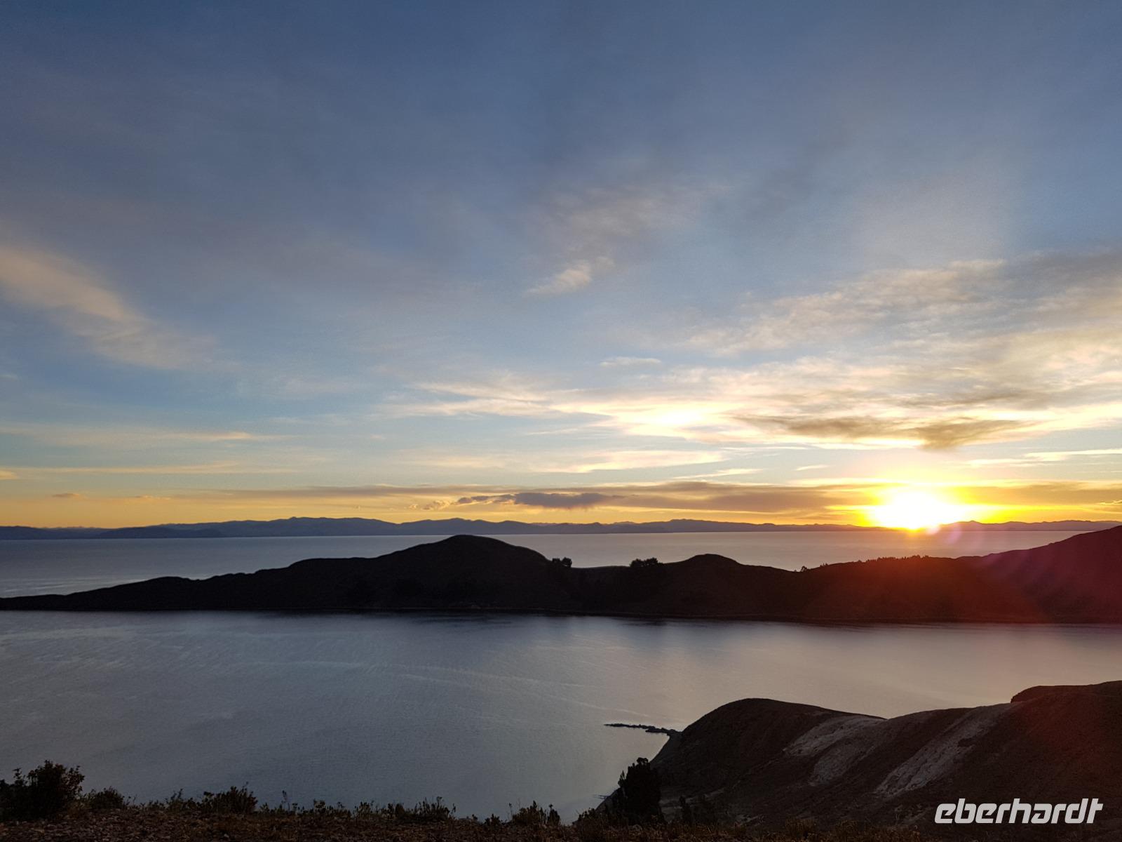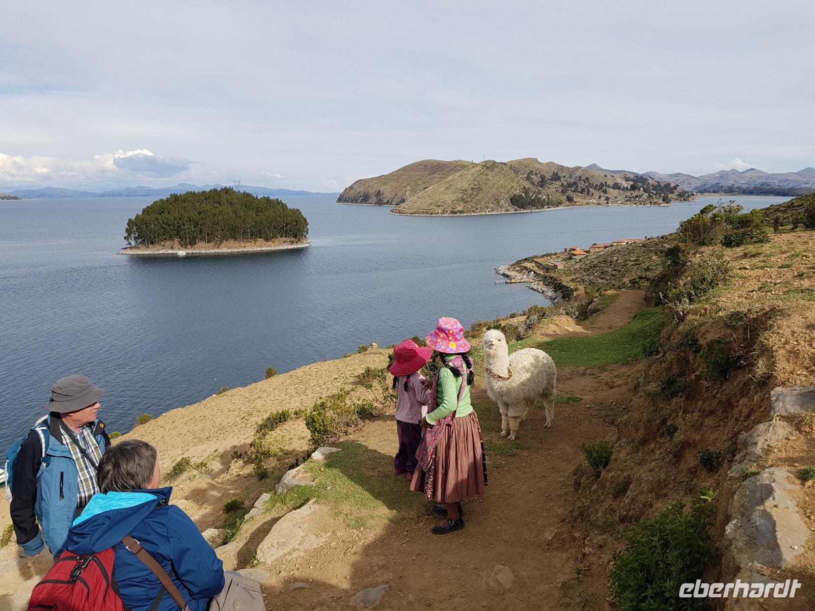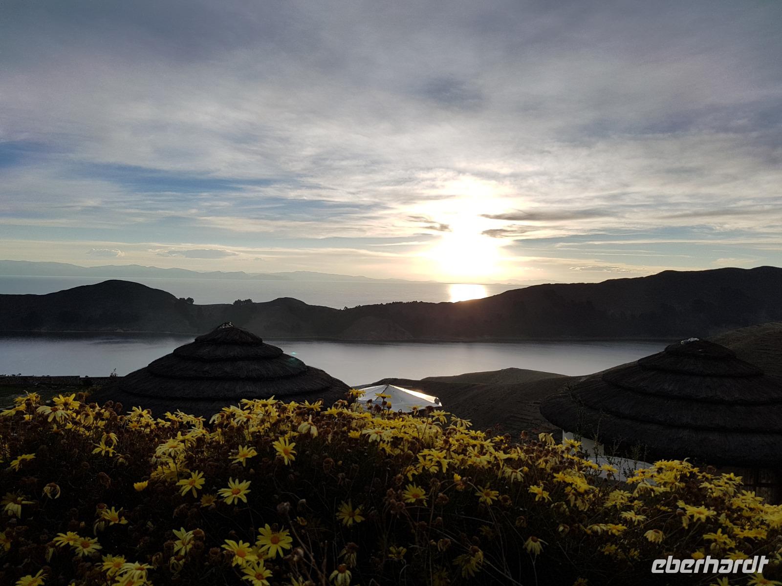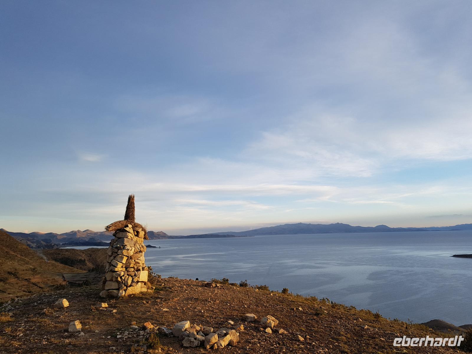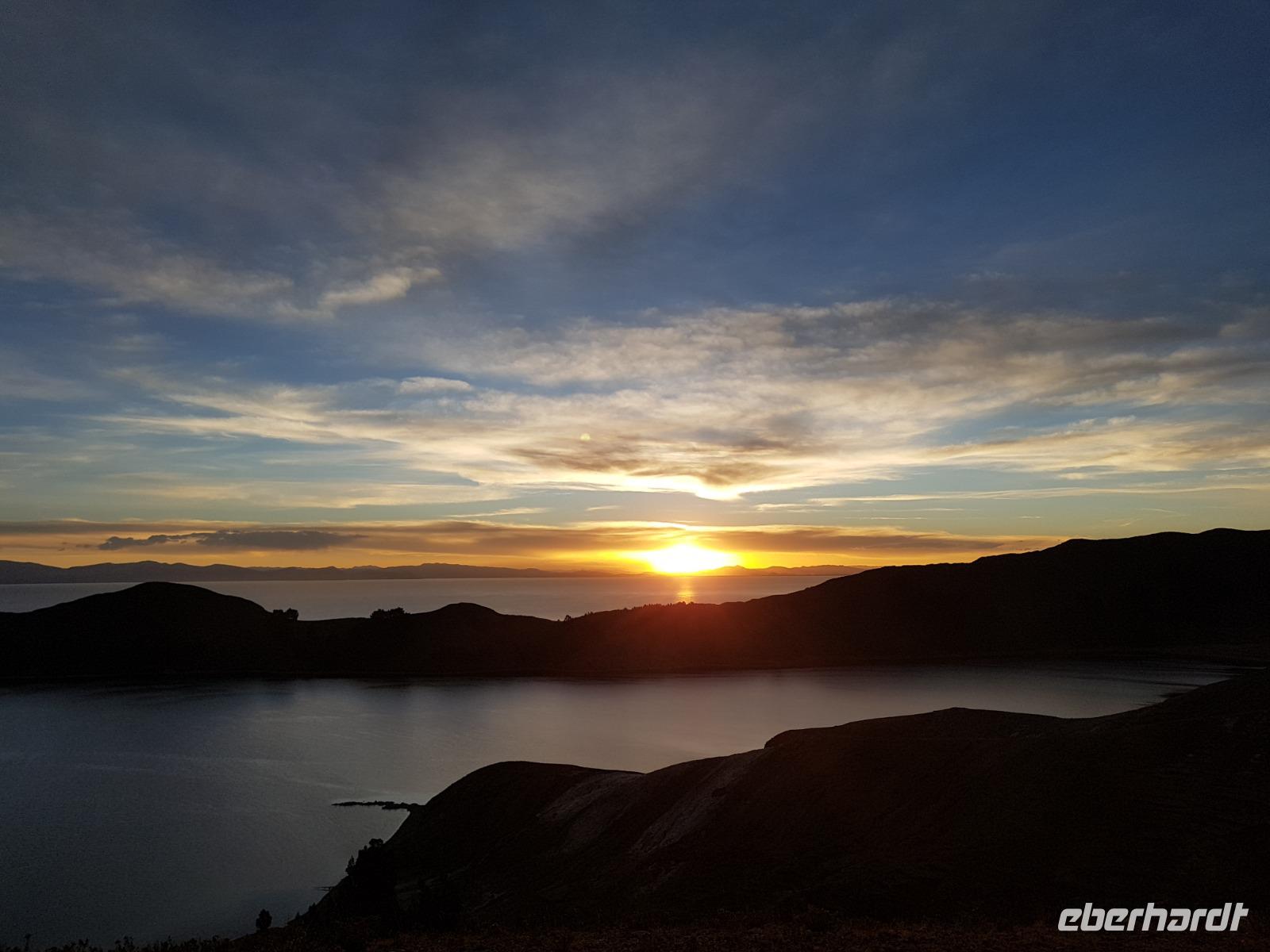 La Paz ist verkehrsmäßig betrachtet eine verrückte Stadt. So entscheiden wir uns La Paz wieder zu verlassen und fahren mit der roten und blauen Seilbahnlinie über "El Alto", wo uns Moises mit den Koffern empfängt. Heute ist Sonntag und Markt in "El Alto". Man kann es nicht in Worte fassen, wie beeindruckend der Blick von Seilbahn hier oben ist. Die riesige Stadt La Paz ist komplett eingekesselt. Die ebenfalls riesige Stadt El Alto ist heute voller Leute, denn auf den Straßen ist Markt. Ein einmaliges Erlebnis, das alles von der Seilbahn aus zu sehen. Wir reisen heute weiter zum nahegelegenen Titicaca-See. Auf der Fahrt machen wir ein Foto-Stopp, um die Cordillera Real Bergkette der bolivianischen Anden zu fotografieren. Wir sehen schneebedeckte Berggipfel, die über 6000 Meter hoch sind. Danach machen wir eine Pause am Rand des Titicaca Sees, wo uns gezeigt wird, wo und wie die berühmten Schilfboote erfunden wurden. Sehr interessant zu sehen, wie die kleinen Schiffe gebaut wurden und schließlich die Ozeane überquert haben. Wir fahren direkt zum Hafen des kleinen Ortes am Rande des Sees, Copacabana. Moises bringt in der Zwischenzeit unsere Koffer ins Hotel, indem wir die übernächste Nacht verbringen werden. Denn heute fahren wir noch über den Titicaca-See zur berühmten Sonneninsel "Isla de Sol". Daher können wir die Bootsfahrt bequem mit nur einer kleinen Tasche oder einem Rucksack für eine Übernachtung antreten. Unser lokaler Bootsführer Willi steuert die Isla de Sol (Sonneninsel) an, die legendäre Wiege des Inka-Imperiums. Zum Mittagessen geht es an einen tollen Ort mit Terrasse und traumhaften Blick auf die Mond Insel. Danach führt uns ein angenehmer Pfad an die Anlegestelle Pilco Kayma (Sonnentempel), vorbei am gleichnamigen Inka-Tempel und hinauf auf den Inselkamm. Wir laufen ganz gemütlich und mit kleinen Pausen schaffen wir den Weg innerhalb einer guten Stunde. Hier oben übernachten wir heute in der wunderschönen Eco Lodge Palla-Khasa mit tollen Ausblicken auf den See. Die besondere Lage unser Lodge macht eine Übernachtung auf der Insel zu einem Highlight unserer Bolivienreise. Wir treffen uns zum Sonnenuntergang um 18.30 Uhr und stellen wissenschaftlich gesehen fest: Die Sonne in Europa und auf der Nordhalbkugel geht von links nach rechts. Aber hier auf der Südhalbkugel geht die Sonne von rechts nach links. Mensch, sind wir klug heute. Der Sonnenuntergang hier oben war so was von traumhaft, mit tollem Blick auf den See und im Hintergrund die Berge Perus. Bevor wir ins Bett gehen, gibt es noch ein tolles Abendessen am Kamin. Danach können wir draußen den wunderschönen Sternenhimmel beobachten. Es ist einfach herrlich hier zu sein. Ein Besuch des Titicaca-Sees mit einer komfortablen Übernachtung auf der Sonneninsel lässt uns die Einmaligkeit und Mystik dieses Ortes spüren. Unvergesslich.