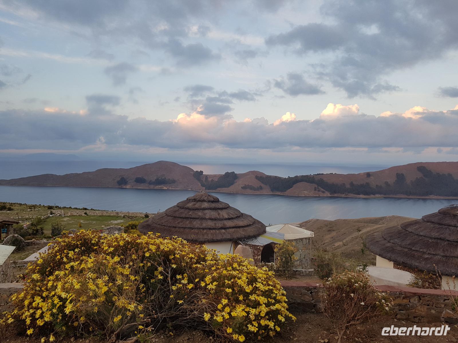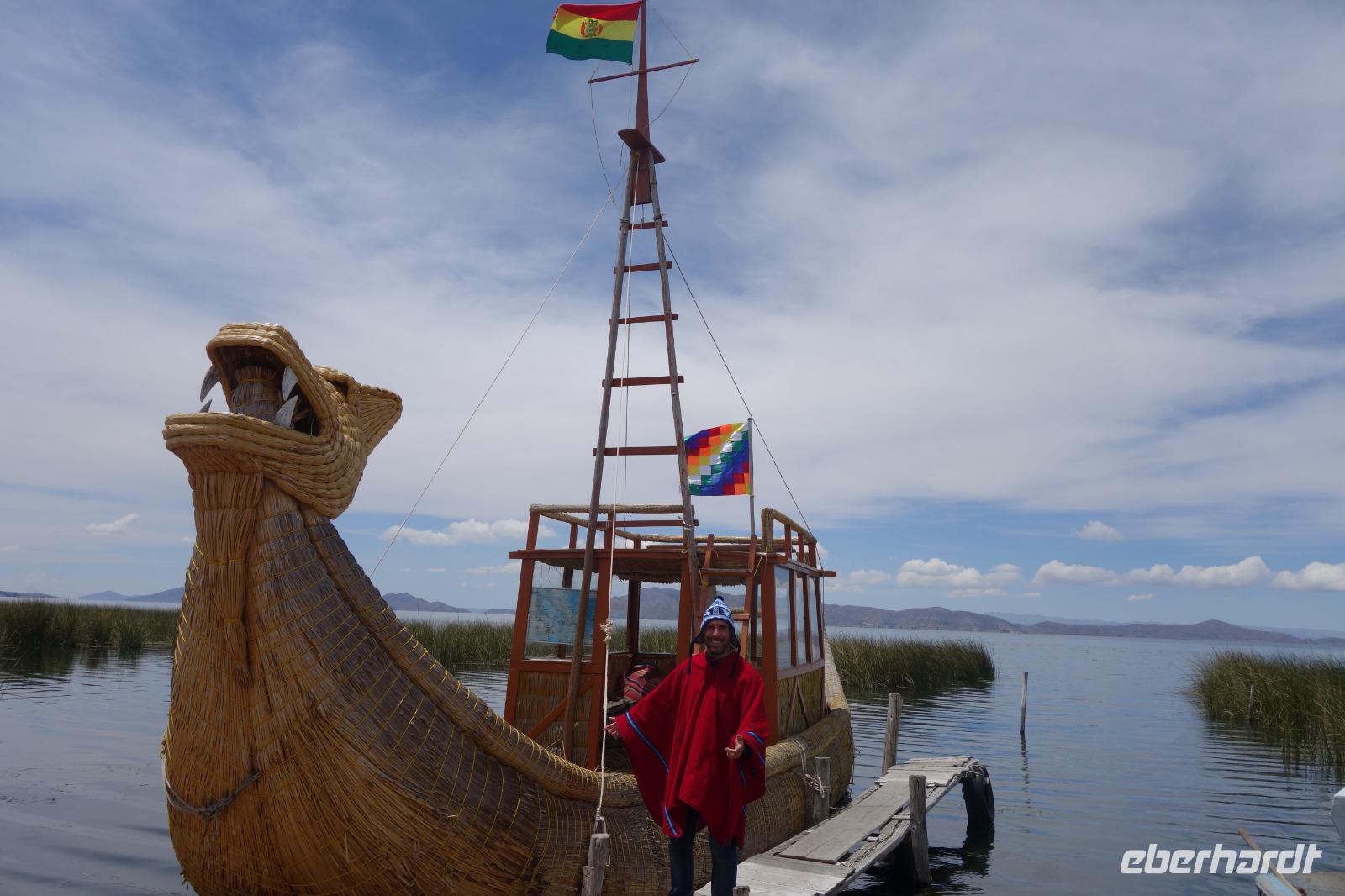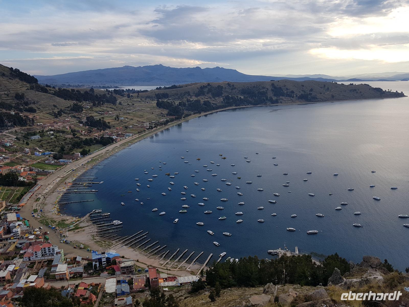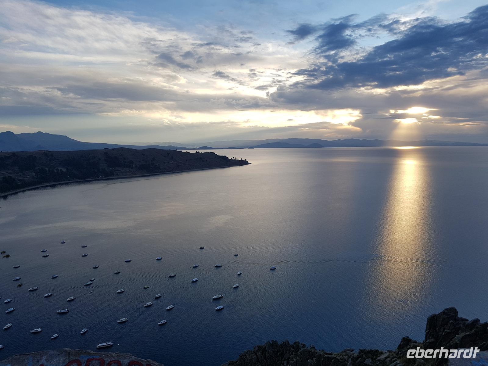 La Paz ist verkehrsmäßig betrachtet eine verrückte Stadt. So entscheiden wir uns La Paz wieder zu verlassen und fahren mit der roten und blauen Seilbahnlinie über "El Alto", wo uns Moises mit den Koffern empfängt. Heute ist Sonntag und Markt in "El Alto". Man kann es nicht in Worte fassen, wie beeindruckend der Blick von Seilbahn hier oben ist. Die riesige Stadt La Paz ist komplett eingekesselt. Die ebenfalls riesige Stadt El Alto ist heute voller Leute, denn auf den Straßen ist Markt. Ein einmaliges Erlebnis, das alles von der Seilbahn aus zu sehen. Wir reisen heute weiter zum nahegelegenen Titicaca-See. Auf der Fahrt machen wir ein Foto-Stopp, um die Cordillera Real Bergkette der bolivianischen Anden zu fotografieren. Wir sehen schneebedeckte Berggipfel, die über 6000 Meter hoch sind. Danach machen wir eine Pause am Rand des Titicaca Sees, wo uns gezeigt wird, wo und wie die berühmten Schilfboote erfunden wurden. Sehr interessant zu sehen, wie die kleinen Schiffe gebaut wurden und schließlich die Ozeane überquert haben. Wir fahren direkt zum Hafen des kleinen Ortes am Rande des Sees, Copacabana. Moises bringt in der Zwischenzeit unsere Koffer ins Hotel, indem wir die übernächste Nacht verbringen werden. Denn heute fahren wir noch über den Titicaca-See zur berühmten Sonneninsel "Isla de Sol". Daher können wir die Bootsfahrt bequem mit nur einer kleinen Tasche oder einem Rucksack für eine Übernachtung antreten. Unser lokaler Bootsführer Willi steuert die Isla de Sol (Sonneninsel) an, die legendäre Wiege des Inka-Imperiums. Zum Mittagessen geht es an einen tollen Ort mit Terrasse und traumhaften Blick auf die Mond Insel. Danach führt uns ein angenehmer Pfad an die Anlegestelle Pilco Kayma (Sonnentempel), vorbei am gleichnamigen Inka-Tempel und hinauf auf den Inselkamm. Wir laufen ganz gemütlich und mit kleinen Pausen schaffen wir den Weg innerhalb einer guten Stunde. Hier oben übernachten wir heute in der wunderschönen Eco Lodge Palla-Khasa mit tollen Ausblicken auf den See. Die besondere Lage unser Lodge macht eine Übernachtung auf der Insel zu einem Highlight unserer Bolivienreise. Wir treffen uns zum Sonnenuntergang um 18.30 Uhr und stellen wissenschaftlich gesehen fest: Die Sonne in Europa und auf der Nordhalbkugel geht von links nach rechts. Aber hier auf der Südhalbkugel geht die Sonne von rechts nach links. Mensch, sind wir klug heute. Der Sonnenuntergang hier oben war so was von traumhaft, mit tollem Blick auf den See und im Hintergrund die Berge Perus. Bevor wir ins Bett gehen, gibt es noch ein tolles Abendessen am Kamin. Danach können wir draußen den wunderschönen Sternenhimmel beobachten. Es ist einfach herrlich hier zu sein. Ein Besuch des Titicaca-Sees mit einer komfortablen Übernachtung auf der Sonneninsel lässt uns die Einmaligkeit und Mystik dieses Ortes spüren. Unvergesslich.