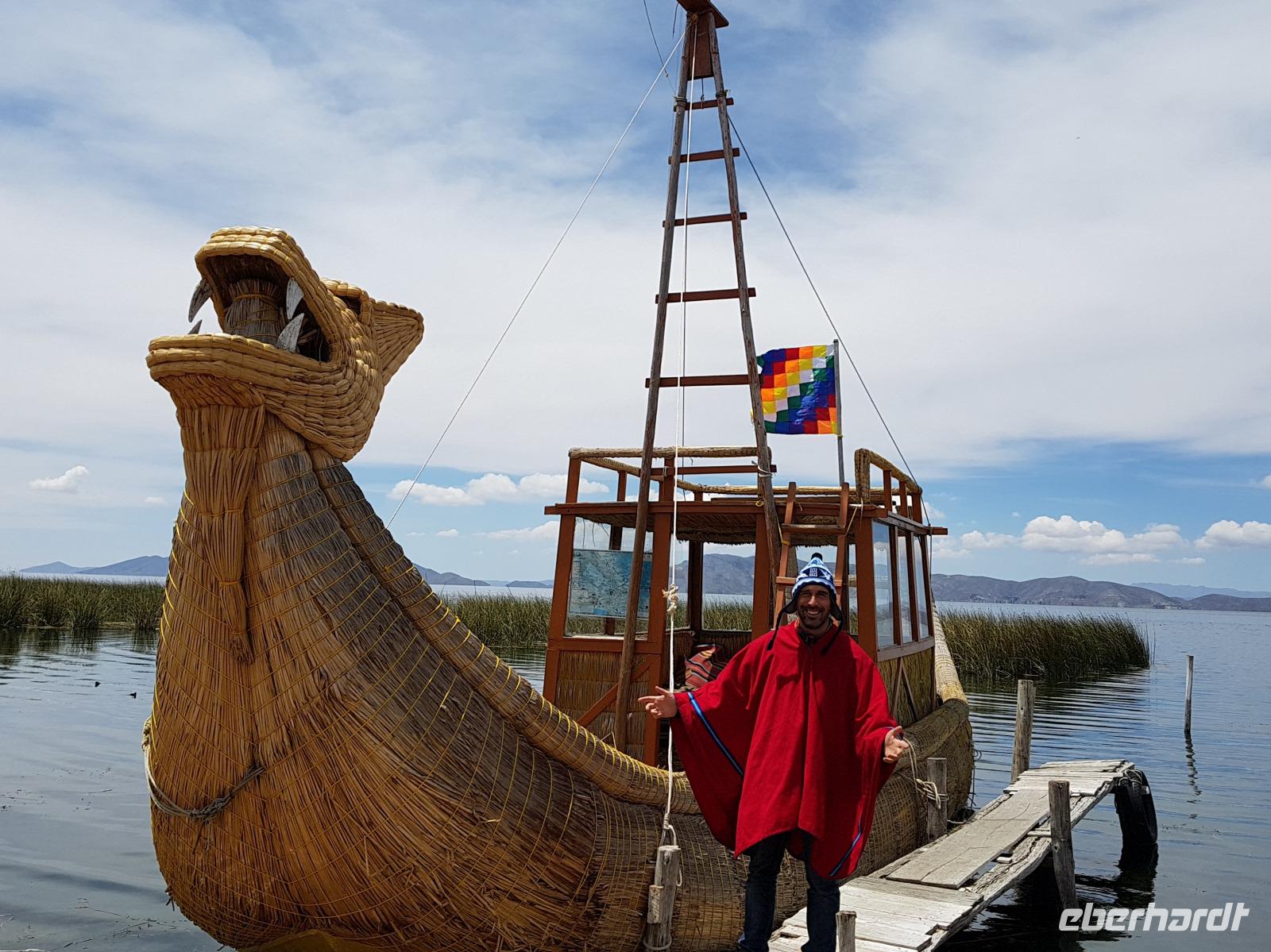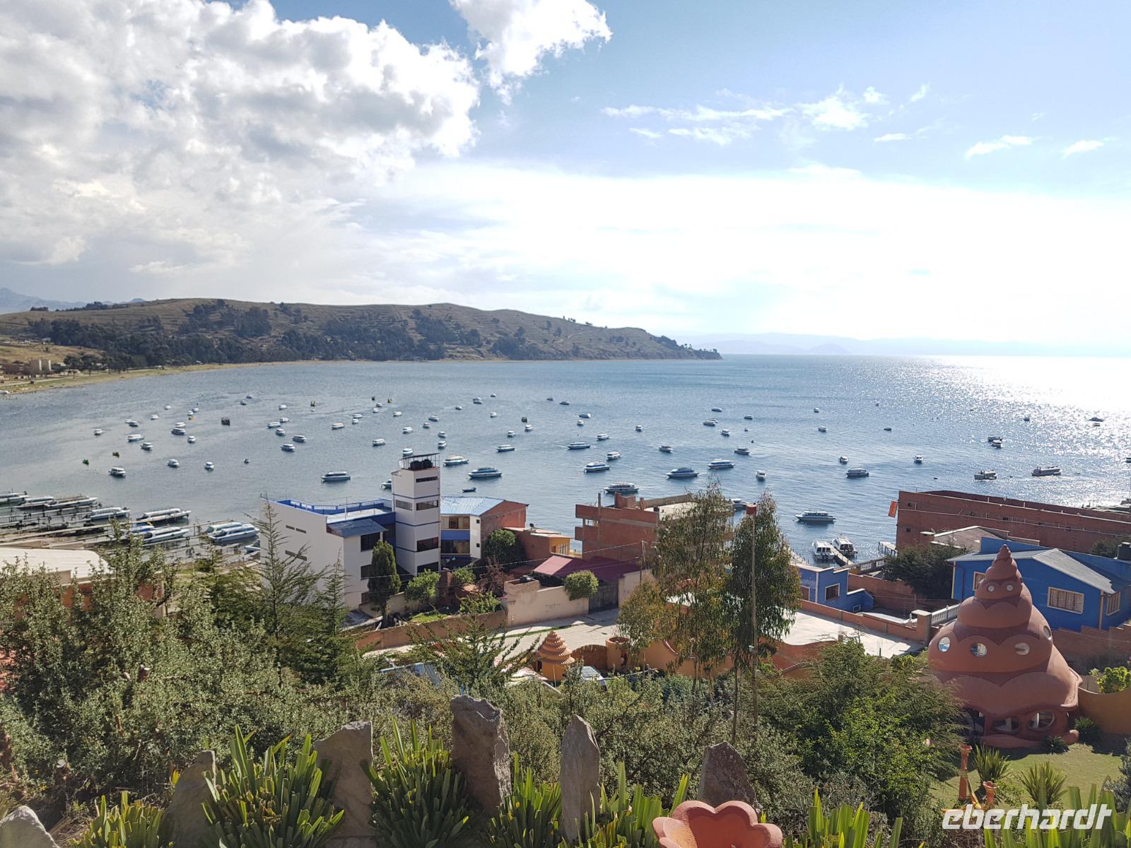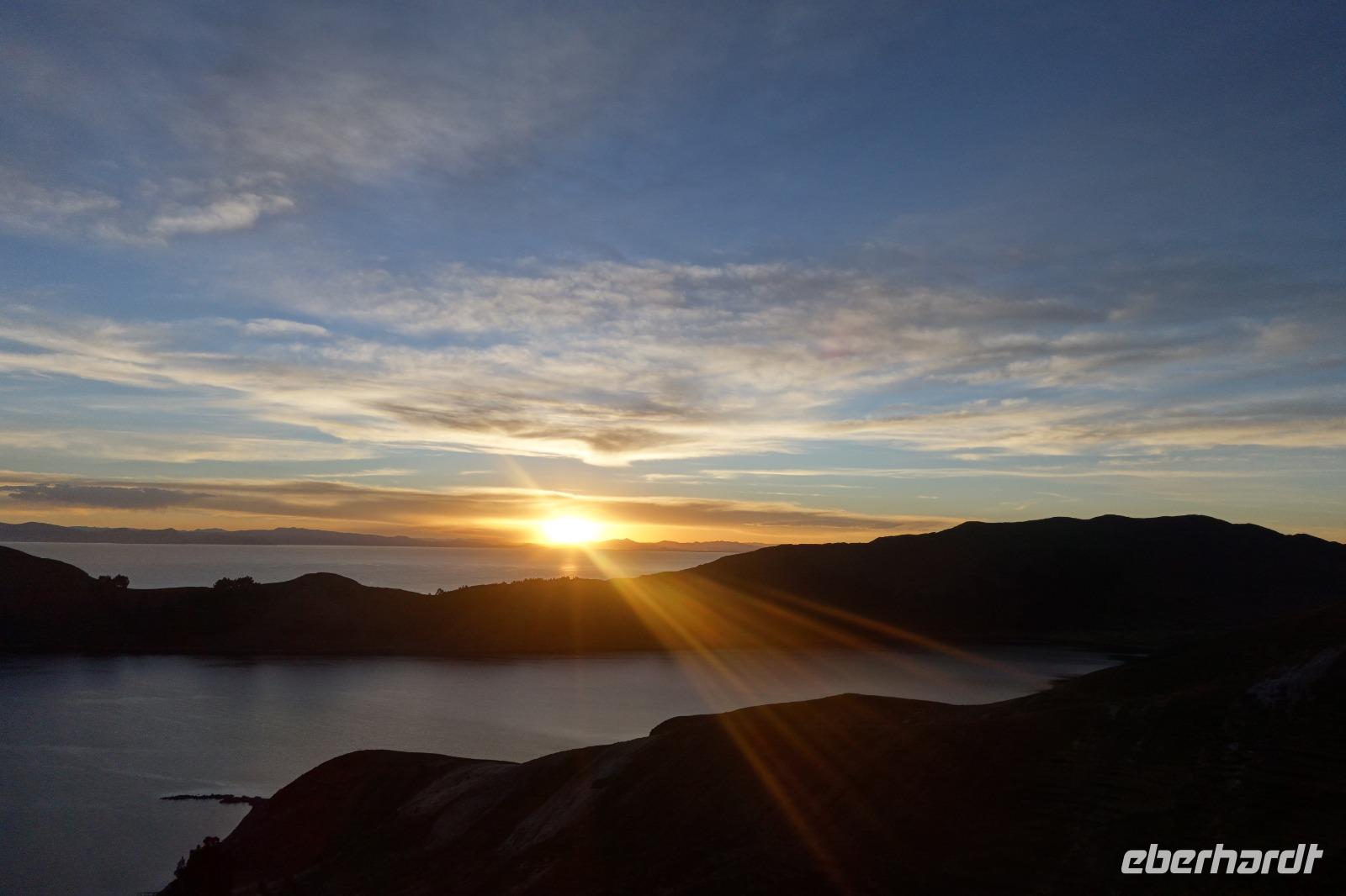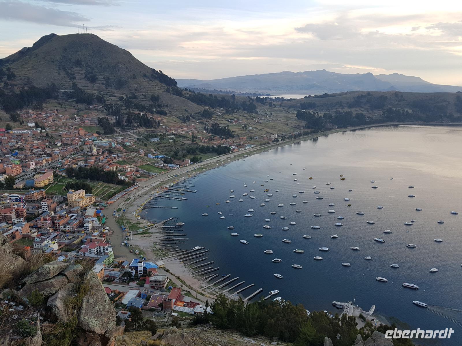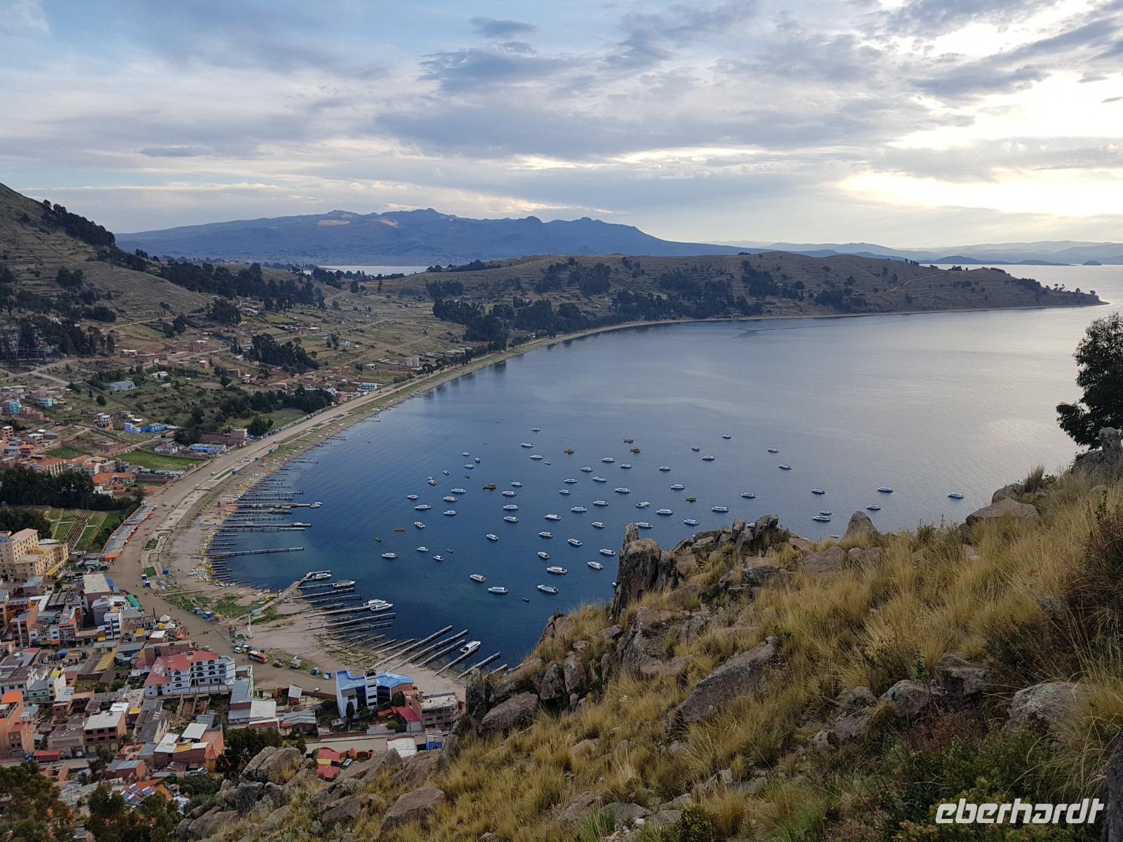 La Paz ist verkehrsmäßig betrachtet eine verrückte Stadt. So entscheiden wir uns La Paz wieder zu verlassen und fahren mit der roten und blauen Seilbahnlinie über "El Alto", wo uns Moises mit den Koffern empfängt. Heute ist Sonntag und Markt in "El Alto". Man kann es nicht in Worte fassen, wie beeindruckend der Blick von Seilbahn hier oben ist. Die riesige Stadt La Paz ist komplett eingekesselt. Die ebenfalls riesige Stadt El Alto ist heute voller Leute, denn auf den Straßen ist Markt. Ein einmaliges Erlebnis, das alles von der Seilbahn aus zu sehen. Wir reisen heute weiter zum nahegelegenen Titicaca-See. Auf der Fahrt machen wir ein Foto-Stopp, um die Cordillera Real Bergkette der bolivianischen Anden zu fotografieren. Wir sehen schneebedeckte Berggipfel, die über 6000 Meter hoch sind. Danach machen wir eine Pause am Rand des Titicaca Sees, wo uns gezeigt wird, wo und wie die berühmten Schilfboote erfunden wurden. Sehr interessant zu sehen, wie die kleinen Schiffe gebaut wurden und schließlich die Ozeane überquert haben. Wir fahren direkt zum Hafen des kleinen Ortes am Rande des Sees, Copacabana. Moises bringt in der Zwischenzeit unsere Koffer ins Hotel, indem wir die übernächste Nacht verbringen werden. Denn heute fahren wir noch über den Titicaca-See zur berühmten Sonneninsel "Isla de Sol". Daher können wir die Bootsfahrt bequem mit nur einer kleinen Tasche oder einem Rucksack für eine Übernachtung antreten. Unser lokaler Bootsführer Willi steuert die Isla de Sol (Sonneninsel) an, die legendäre Wiege des Inka-Imperiums. Zum Mittagessen geht es an einen tollen Ort mit Terrasse und traumhaften Blick auf die Mond Insel. Danach führt uns ein angenehmer Pfad an die Anlegestelle Pilco Kayma (Sonnentempel), vorbei am gleichnamigen Inka-Tempel und hinauf auf den Inselkamm. Wir laufen ganz gemütlich und mit kleinen Pausen schaffen wir den Weg innerhalb einer guten Stunde. Hier oben übernachten wir heute in der wunderschönen Eco Lodge Palla-Khasa mit tollen Ausblicken auf den See. Die besondere Lage unser Lodge macht eine Übernachtung auf der Insel zu einem Highlight unserer Bolivienreise. Wir treffen uns zum Sonnenuntergang um 18.30 Uhr und stellen wissenschaftlich gesehen fest: Die Sonne in Europa und auf der Nordhalbkugel geht von links nach rechts. Aber hier auf der Südhalbkugel geht die Sonne von rechts nach links. Mensch, sind wir klug heute. Der Sonnenuntergang hier oben war so was von traumhaft, mit tollem Blick auf den See und im Hintergrund die Berge Perus. Bevor wir ins Bett gehen, gibt es noch ein tolles Abendessen am Kamin. Danach können wir draußen den wunderschönen Sternenhimmel beobachten. Es ist einfach herrlich hier zu sein. Ein Besuch des Titicaca-Sees mit einer komfortablen Übernachtung auf der Sonneninsel lässt uns die Einmaligkeit und Mystik dieses Ortes spüren. Unvergesslich.
