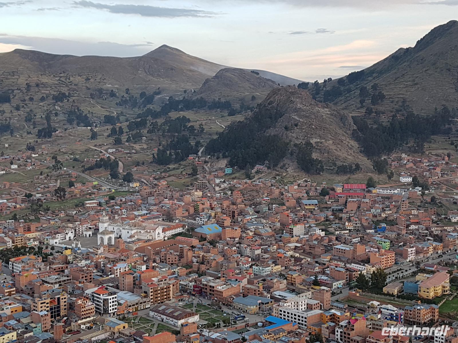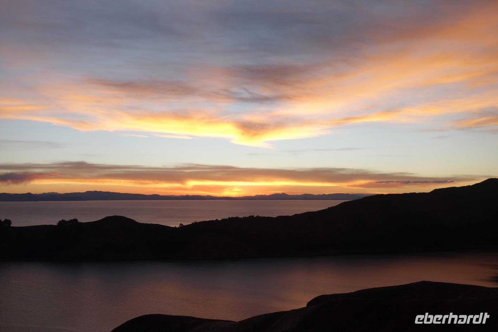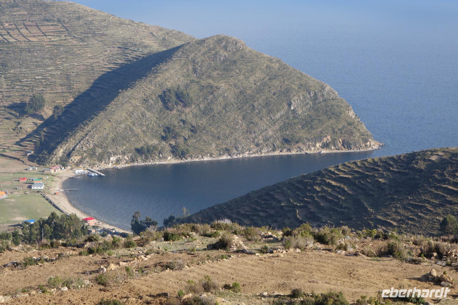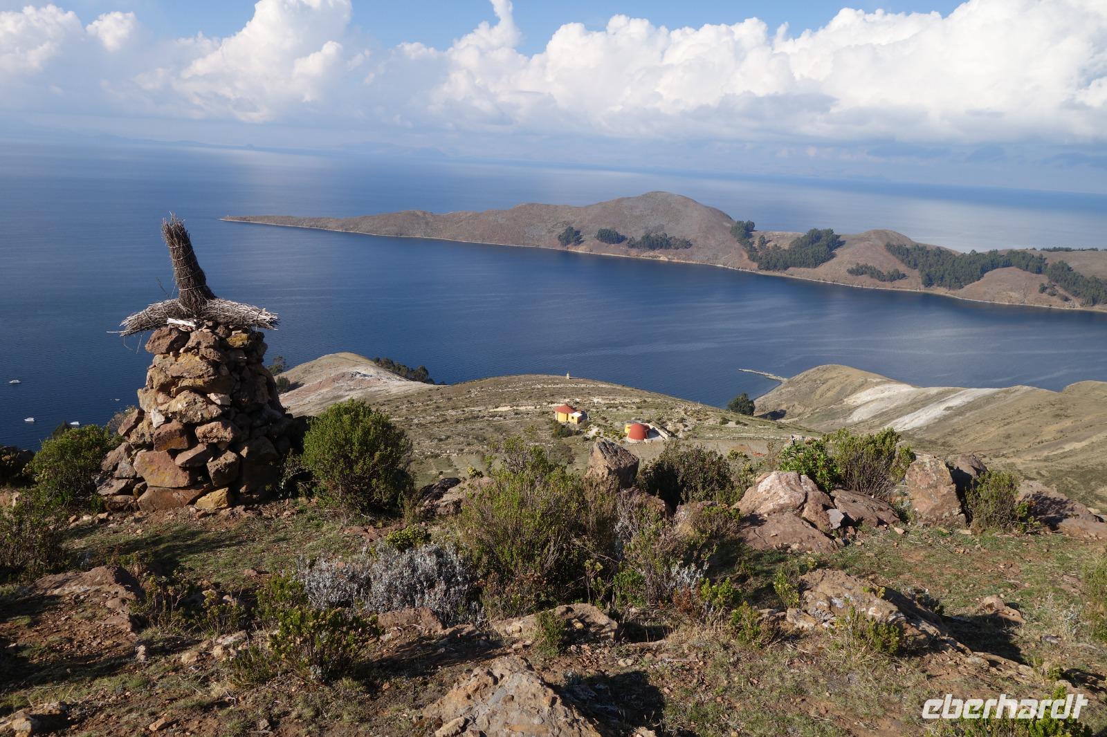La Paz ist verkehrsmäßig betrachtet eine verrückte Stadt. So entscheiden wir uns La Paz wieder zu verlassen und fahren mit der roten und blauen Seilbahnlinie über "El Alto", wo uns Moises mit den Koffern empfängt. Heute ist Sonntag und Markt in "El Alto". Man kann es nicht in Worte fassen, wie beeindruckend der Blick von Seilbahn hier oben ist. Die riesige Stadt La Paz ist komplett eingekesselt. Die ebenfalls riesige Stadt El Alto ist heute voller Leute, denn auf den Straßen ist Markt. Ein einmaliges Erlebnis, das alles von der Seilbahn aus zu sehen. Wir reisen heute weiter zum nahegelegenen Titicaca-See. Auf der Fahrt machen wir ein Foto-Stopp, um die Cordillera Real Bergkette der bolivianischen Anden zu fotografieren. Wir sehen schneebedeckte Berggipfel, die über 6000 Meter hoch sind. Danach machen wir eine Pause am Rand des Titicaca Sees, wo uns gezeigt wird, wo und wie die berühmten Schilfboote erfunden wurden. Sehr interessant zu sehen, wie die kleinen Schiffe gebaut wurden und schließlich die Ozeane überquert haben. Wir fahren direkt zum Hafen des kleinen Ortes am Rande des Sees, Copacabana. Moises bringt in der Zwischenzeit unsere Koffer ins Hotel, indem wir die übernächste Nacht verbringen werden. Denn heute fahren wir noch über den Titicaca-See zur berühmten Sonneninsel "Isla de Sol". Daher können wir die Bootsfahrt bequem mit nur einer kleinen Tasche oder einem Rucksack für eine Übernachtung antreten. Unser lokaler Bootsführer Willi steuert die Isla de Sol (Sonneninsel) an, die legendäre Wiege des Inka-Imperiums. Zum Mittagessen geht es an einen tollen Ort mit Terrasse und traumhaften Blick auf die Mond Insel. Danach führt uns ein angenehmer Pfad an die Anlegestelle Pilco Kayma (Sonnentempel), vorbei am gleichnamigen Inka-Tempel und hinauf auf den Inselkamm. Wir laufen ganz gemütlich und mit kleinen Pausen schaffen wir den Weg innerhalb einer guten Stunde. Hier oben übernachten wir heute in der wunderschönen Eco Lodge Palla-Khasa mit tollen Ausblicken auf den See. Die besondere Lage unser Lodge macht eine Übernachtung auf der Insel zu einem Highlight unserer Bolivienreise. Wir treffen uns zum Sonnenuntergang um 18.30 Uhr und stellen wissenschaftlich gesehen fest: Die Sonne in Europa und auf der Nordhalbkugel geht von links nach rechts. Aber hier auf der Südhalbkugel geht die Sonne von rechts nach links. Mensch, sind wir klug heute. Der Sonnenuntergang hier oben war so was von traumhaft, mit tollem Blick auf den See und im Hintergrund die Berge Perus. Bevor wir ins Bett gehen, gibt es noch ein tolles Abendessen am Kamin. Danach können wir draußen den wunderschönen Sternenhimmel beobachten. Es ist einfach herrlich hier zu sein. Ein Besuch des Titicaca-Sees mit einer komfortablen Übernachtung auf der Sonneninsel lässt uns die Einmaligkeit und Mystik dieses Ortes spüren. Unvergesslich.
