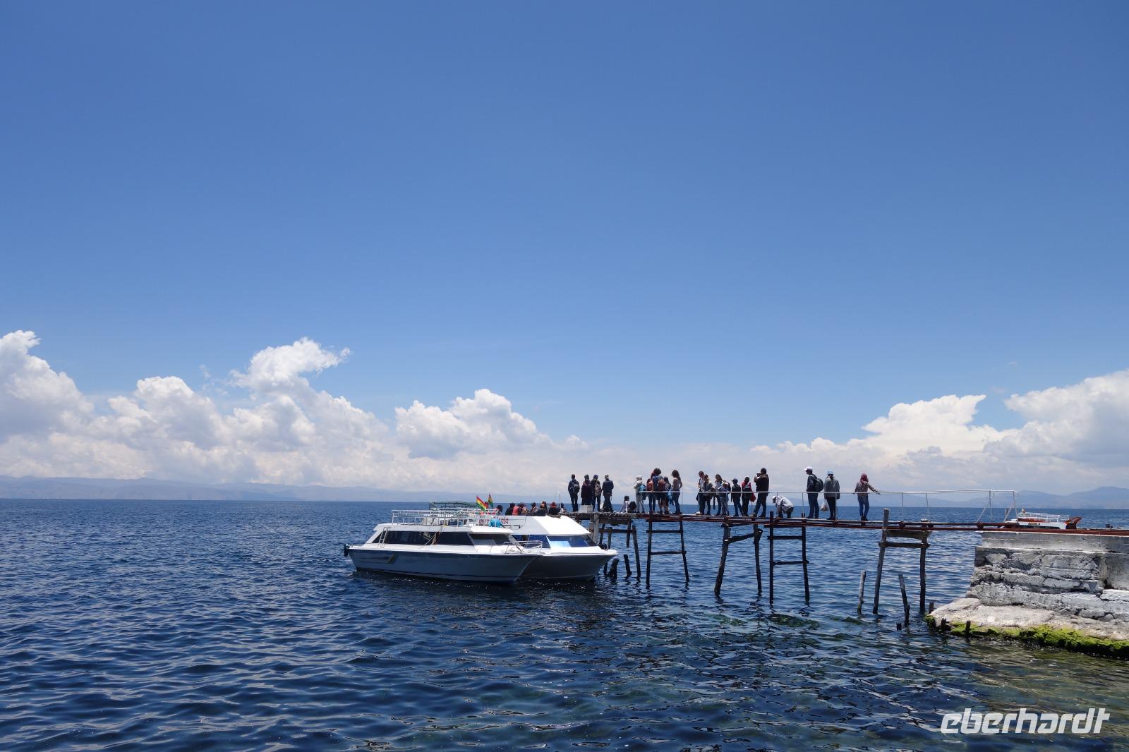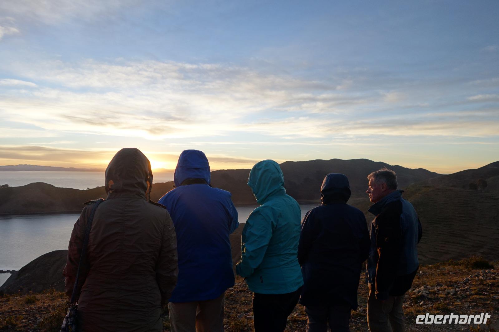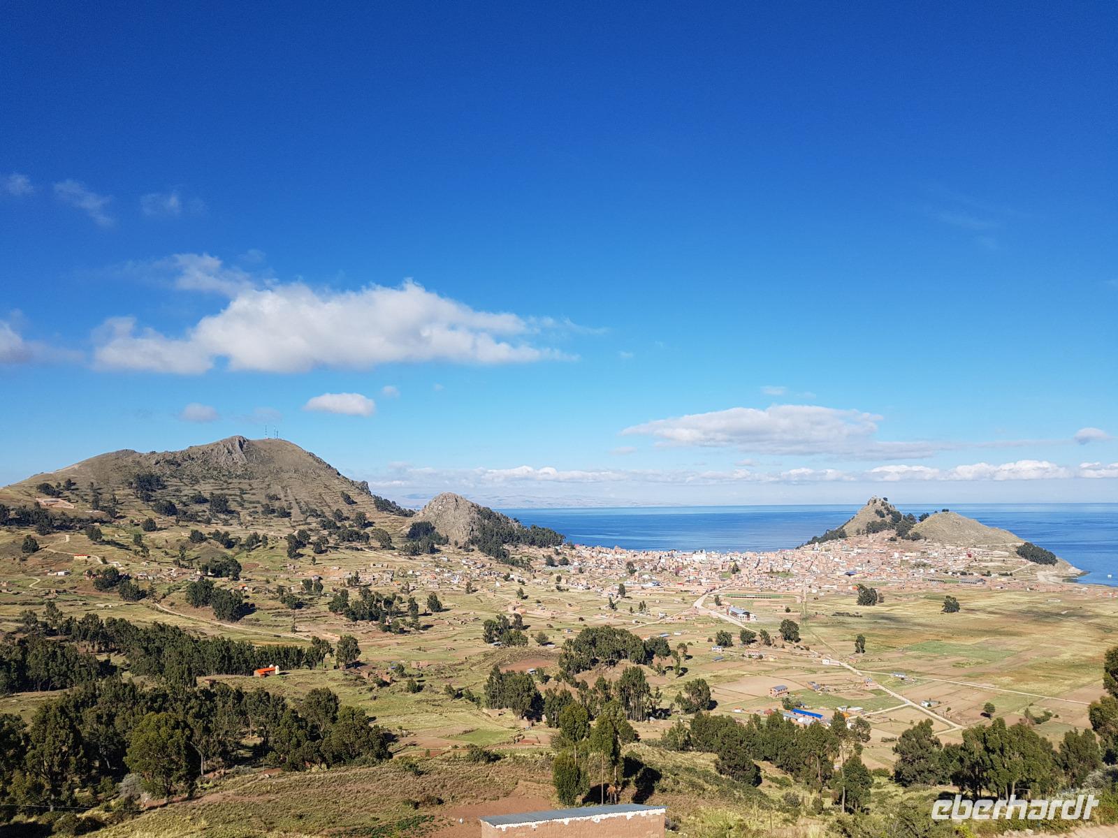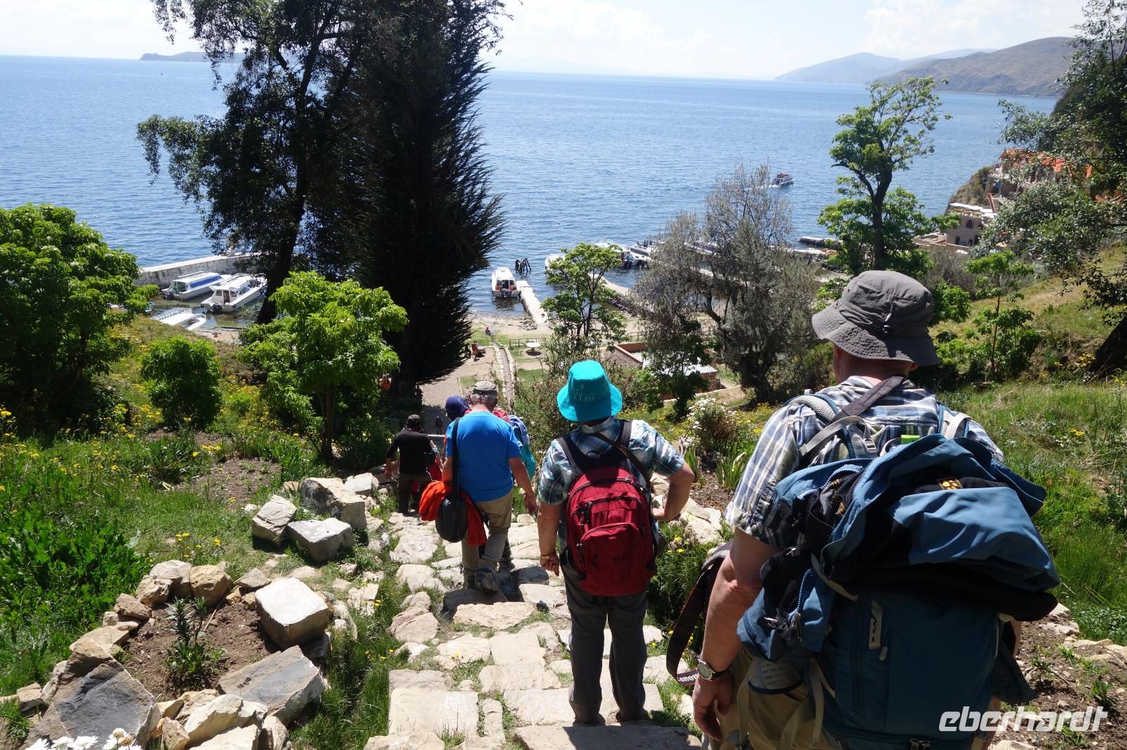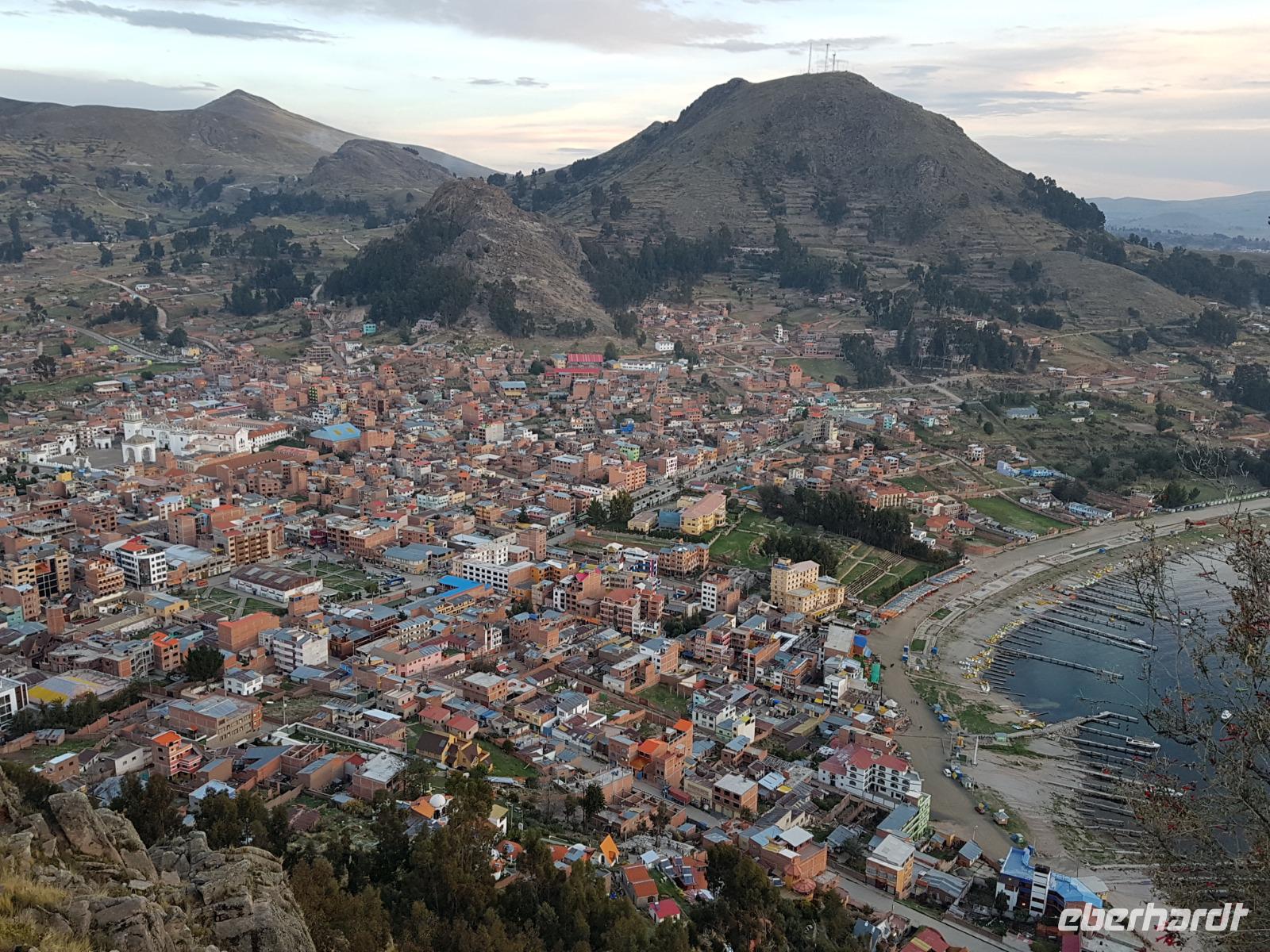 La Paz ist verkehrsmäßig betrachtet eine verrückte Stadt. So entscheiden wir uns La Paz wieder zu verlassen und fahren mit der roten und blauen Seilbahnlinie über "El Alto", wo uns Moises mit den Koffern empfängt. Heute ist Sonntag und Markt in "El Alto". Man kann es nicht in Worte fassen, wie beeindruckend der Blick von Seilbahn hier oben ist. Die riesige Stadt La Paz ist komplett eingekesselt. Die ebenfalls riesige Stadt El Alto ist heute voller Leute, denn auf den Straßen ist Markt. Ein einmaliges Erlebnis, das alles von der Seilbahn aus zu sehen. Wir reisen heute weiter zum nahegelegenen Titicaca-See. Auf der Fahrt machen wir ein Foto-Stopp, um die Cordillera Real Bergkette der bolivianischen Anden zu fotografieren. Wir sehen schneebedeckte Berggipfel, die über 6000 Meter hoch sind. Danach machen wir eine Pause am Rand des Titicaca Sees, wo uns gezeigt wird, wo und wie die berühmten Schilfboote erfunden wurden. Sehr interessant zu sehen, wie die kleinen Schiffe gebaut wurden und schließlich die Ozeane überquert haben. Wir fahren direkt zum Hafen des kleinen Ortes am Rande des Sees, Copacabana. Moises bringt in der Zwischenzeit unsere Koffer ins Hotel, indem wir die übernächste Nacht verbringen werden. Denn heute fahren wir noch über den Titicaca-See zur berühmten Sonneninsel "Isla de Sol". Daher können wir die Bootsfahrt bequem mit nur einer kleinen Tasche oder einem Rucksack für eine Übernachtung antreten. Unser lokaler Bootsführer Willi steuert die Isla de Sol (Sonneninsel) an, die legendäre Wiege des Inka-Imperiums. Zum Mittagessen geht es an einen tollen Ort mit Terrasse und traumhaften Blick auf die Mond Insel. Danach führt uns ein angenehmer Pfad an die Anlegestelle Pilco Kayma (Sonnentempel), vorbei am gleichnamigen Inka-Tempel und hinauf auf den Inselkamm. Wir laufen ganz gemütlich und mit kleinen Pausen schaffen wir den Weg innerhalb einer guten Stunde. Hier oben übernachten wir heute in der wunderschönen Eco Lodge Palla-Khasa mit tollen Ausblicken auf den See. Die besondere Lage unser Lodge macht eine Übernachtung auf der Insel zu einem Highlight unserer Bolivienreise. Wir treffen uns zum Sonnenuntergang um 18.30 Uhr und stellen wissenschaftlich gesehen fest: Die Sonne in Europa und auf der Nordhalbkugel geht von links nach rechts. Aber hier auf der Südhalbkugel geht die Sonne von rechts nach links. Mensch, sind wir klug heute. Der Sonnenuntergang hier oben war so was von traumhaft, mit tollem Blick auf den See und im Hintergrund die Berge Perus. Bevor wir ins Bett gehen, gibt es noch ein tolles Abendessen am Kamin. Danach können wir draußen den wunderschönen Sternenhimmel beobachten. Es ist einfach herrlich hier zu sein. Ein Besuch des Titicaca-Sees mit einer komfortablen Übernachtung auf der Sonneninsel lässt uns die Einmaligkeit und Mystik dieses Ortes spüren. Unvergesslich.
