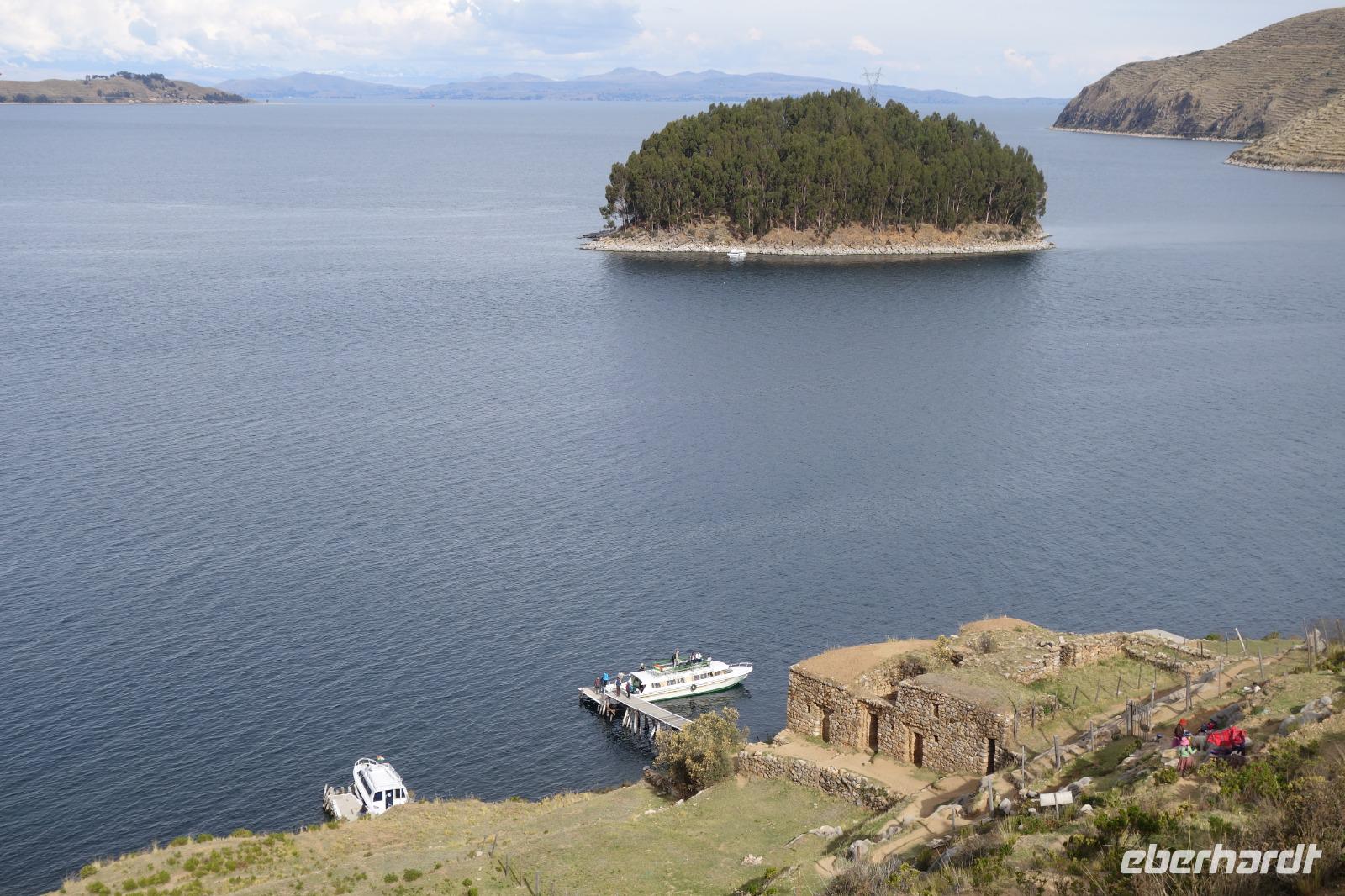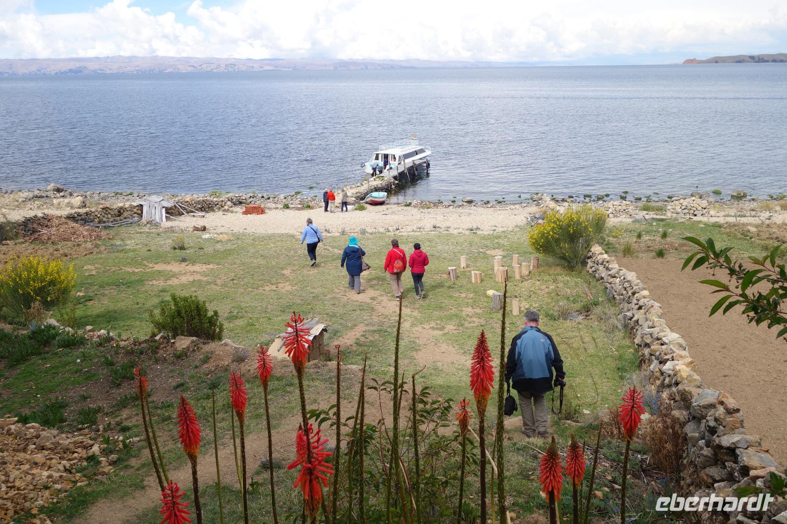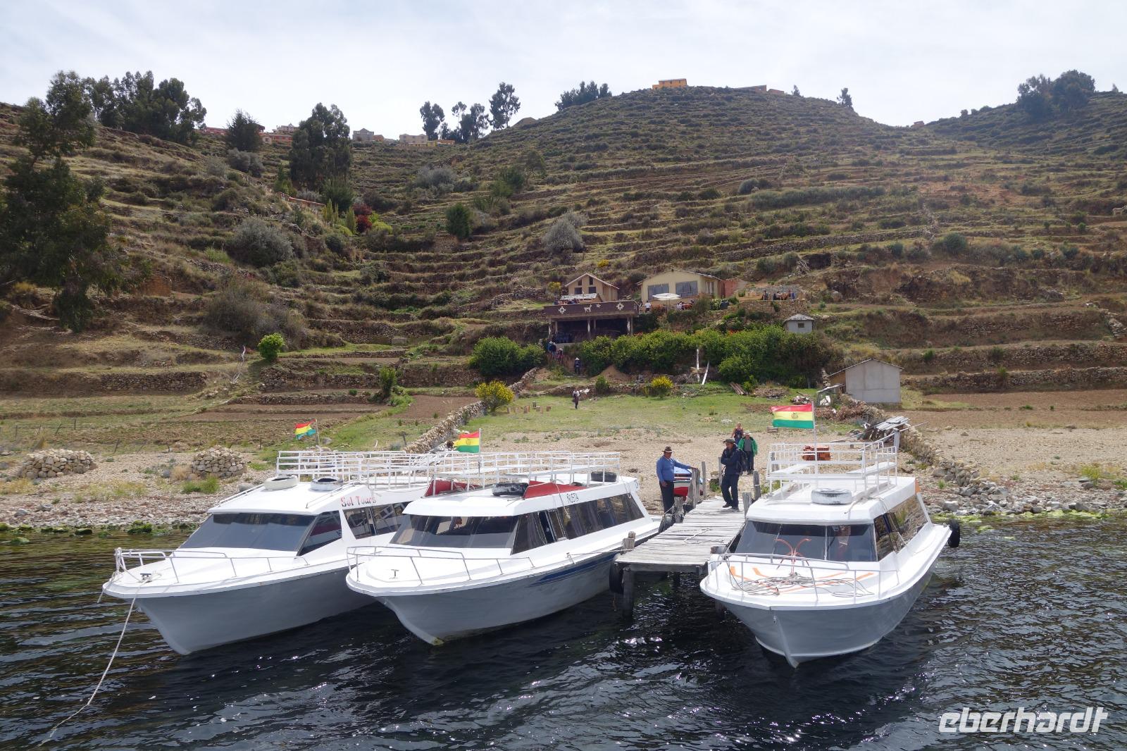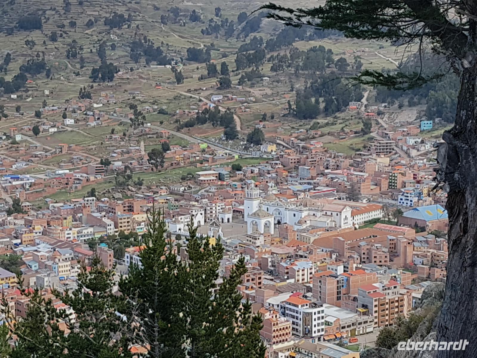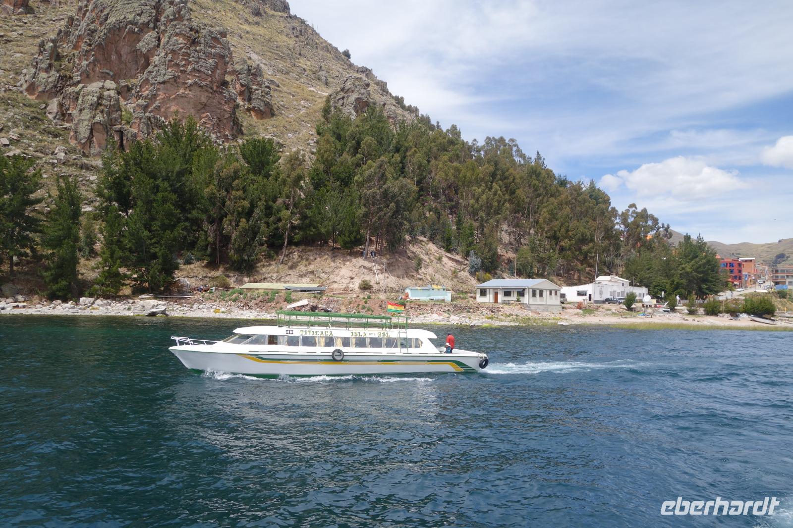 La Paz ist verkehrsmäßig betrachtet eine verrückte Stadt. So entscheiden wir uns La Paz wieder zu verlassen und fahren mit der roten und blauen Seilbahnlinie über "El Alto", wo uns Moises mit den Koffern empfängt. Heute ist Sonntag und Markt in "El Alto". Man kann es nicht in Worte fassen, wie beeindruckend der Blick von Seilbahn hier oben ist. Die riesige Stadt La Paz ist komplett eingekesselt. Die ebenfalls riesige Stadt El Alto ist heute voller Leute, denn auf den Straßen ist Markt. Ein einmaliges Erlebnis, das alles von der Seilbahn aus zu sehen. Wir reisen heute weiter zum nahegelegenen Titicaca-See. Auf der Fahrt machen wir ein Foto-Stopp, um die Cordillera Real Bergkette der bolivianischen Anden zu fotografieren. Wir sehen schneebedeckte Berggipfel, die über 6000 Meter hoch sind. Danach machen wir eine Pause am Rand des Titicaca Sees, wo uns gezeigt wird, wo und wie die berühmten Schilfboote erfunden wurden. Sehr interessant zu sehen, wie die kleinen Schiffe gebaut wurden und schließlich die Ozeane überquert haben. Wir fahren direkt zum Hafen des kleinen Ortes am Rande des Sees, Copacabana. Moises bringt in der Zwischenzeit unsere Koffer ins Hotel, indem wir die übernächste Nacht verbringen werden. Denn heute fahren wir noch über den Titicaca-See zur berühmten Sonneninsel "Isla de Sol". Daher können wir die Bootsfahrt bequem mit nur einer kleinen Tasche oder einem Rucksack für eine Übernachtung antreten. Unser lokaler Bootsführer Willi steuert die Isla de Sol (Sonneninsel) an, die legendäre Wiege des Inka-Imperiums. Zum Mittagessen geht es an einen tollen Ort mit Terrasse und traumhaften Blick auf die Mond Insel. Danach führt uns ein angenehmer Pfad an die Anlegestelle Pilco Kayma (Sonnentempel), vorbei am gleichnamigen Inka-Tempel und hinauf auf den Inselkamm. Wir laufen ganz gemütlich und mit kleinen Pausen schaffen wir den Weg innerhalb einer guten Stunde. Hier oben übernachten wir heute in der wunderschönen Eco Lodge Palla-Khasa mit tollen Ausblicken auf den See. Die besondere Lage unser Lodge macht eine Übernachtung auf der Insel zu einem Highlight unserer Bolivienreise. Wir treffen uns zum Sonnenuntergang um 18.30 Uhr und stellen wissenschaftlich gesehen fest: Die Sonne in Europa und auf der Nordhalbkugel geht von links nach rechts. Aber hier auf der Südhalbkugel geht die Sonne von rechts nach links. Mensch, sind wir klug heute. Der Sonnenuntergang hier oben war so was von traumhaft, mit tollem Blick auf den See und im Hintergrund die Berge Perus. Bevor wir ins Bett gehen, gibt es noch ein tolles Abendessen am Kamin. Danach können wir draußen den wunderschönen Sternenhimmel beobachten. Es ist einfach herrlich hier zu sein. Ein Besuch des Titicaca-Sees mit einer komfortablen Übernachtung auf der Sonneninsel lässt uns die Einmaligkeit und Mystik dieses Ortes spüren. Unvergesslich.