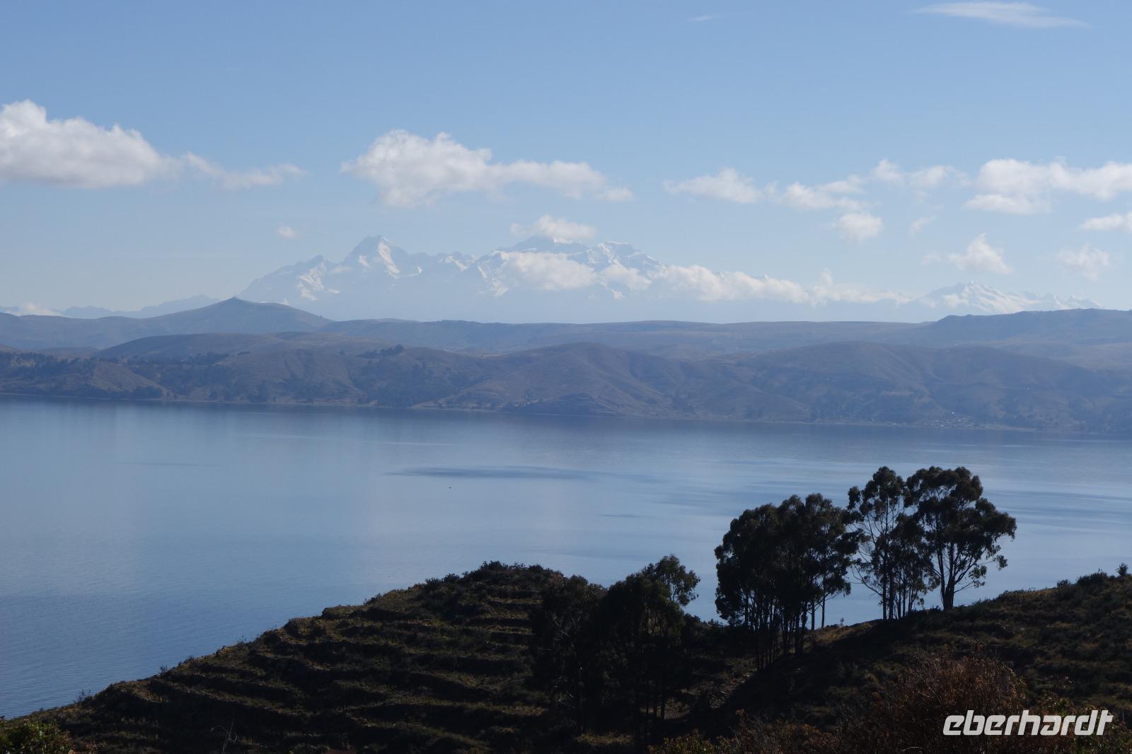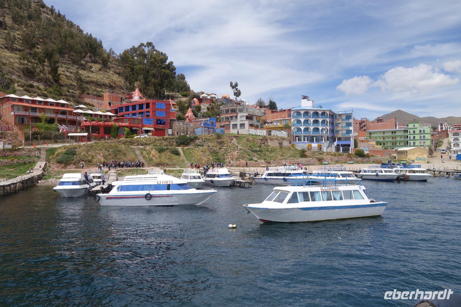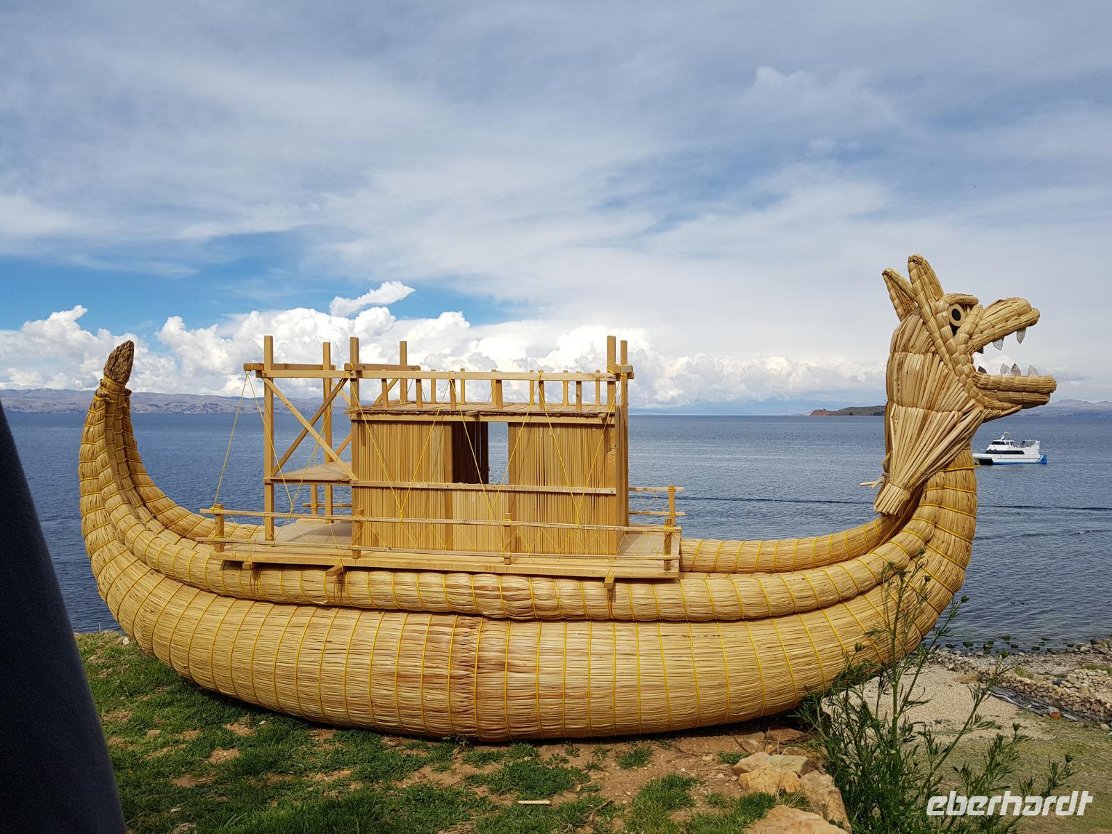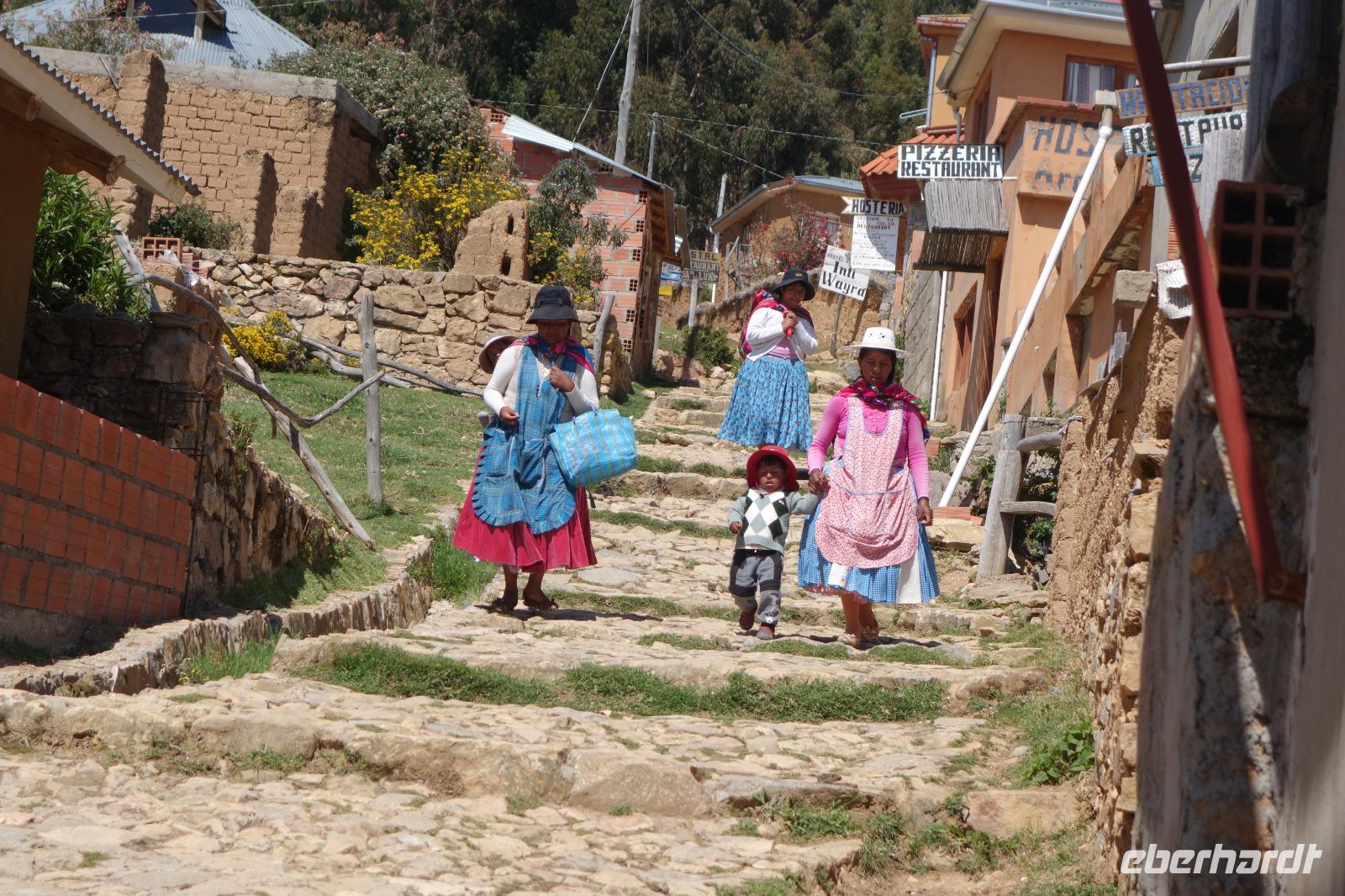 La Paz ist verkehrsmäßig betrachtet eine verrückte Stadt. So entscheiden wir uns La Paz wieder zu verlassen und fahren mit der roten und blauen Seilbahnlinie über "El Alto", wo uns Moises mit den Koffern empfängt. Heute ist Sonntag und Markt in "El Alto". Man kann es nicht in Worte fassen, wie beeindruckend der Blick von Seilbahn hier oben ist. Die riesige Stadt La Paz ist komplett eingekesselt. Die ebenfalls riesige Stadt El Alto ist heute voller Leute, denn auf den Straßen ist Markt. Ein einmaliges Erlebnis, das alles von der Seilbahn aus zu sehen. Wir reisen heute weiter zum nahegelegenen Titicaca-See. Auf der Fahrt machen wir ein Foto-Stopp, um die Cordillera Real Bergkette der bolivianischen Anden zu fotografieren. Wir sehen schneebedeckte Berggipfel, die über 6000 Meter hoch sind. Danach machen wir eine Pause am Rand des Titicaca Sees, wo uns gezeigt wird, wo und wie die berühmten Schilfboote erfunden wurden. Sehr interessant zu sehen, wie die kleinen Schiffe gebaut wurden und schließlich die Ozeane überquert haben. Wir fahren direkt zum Hafen des kleinen Ortes am Rande des Sees, Copacabana. Moises bringt in der Zwischenzeit unsere Koffer ins Hotel, indem wir die übernächste Nacht verbringen werden. Denn heute fahren wir noch über den Titicaca-See zur berühmten Sonneninsel "Isla de Sol". Daher können wir die Bootsfahrt bequem mit nur einer kleinen Tasche oder einem Rucksack für eine Übernachtung antreten. Unser lokaler Bootsführer Willi steuert die Isla de Sol (Sonneninsel) an, die legendäre Wiege des Inka-Imperiums. Zum Mittagessen geht es an einen tollen Ort mit Terrasse und traumhaften Blick auf die Mond Insel. Danach führt uns ein angenehmer Pfad an die Anlegestelle Pilco Kayma (Sonnentempel), vorbei am gleichnamigen Inka-Tempel und hinauf auf den Inselkamm. Wir laufen ganz gemütlich und mit kleinen Pausen schaffen wir den Weg innerhalb einer guten Stunde. Hier oben übernachten wir heute in der wunderschönen Eco Lodge Palla-Khasa mit tollen Ausblicken auf den See. Die besondere Lage unser Lodge macht eine Übernachtung auf der Insel zu einem Highlight unserer Bolivienreise. Wir treffen uns zum Sonnenuntergang um 18.30 Uhr und stellen wissenschaftlich gesehen fest: Die Sonne in Europa und auf der Nordhalbkugel geht von links nach rechts. Aber hier auf der Südhalbkugel geht die Sonne von rechts nach links. Mensch, sind wir klug heute. Der Sonnenuntergang hier oben war so was von traumhaft, mit tollem Blick auf den See und im Hintergrund die Berge Perus. Bevor wir ins Bett gehen, gibt es noch ein tolles Abendessen am Kamin. Danach können wir draußen den wunderschönen Sternenhimmel beobachten. Es ist einfach herrlich hier zu sein. Ein Besuch des Titicaca-Sees mit einer komfortablen Übernachtung auf der Sonneninsel lässt uns die Einmaligkeit und Mystik dieses Ortes spüren. Unvergesslich.
