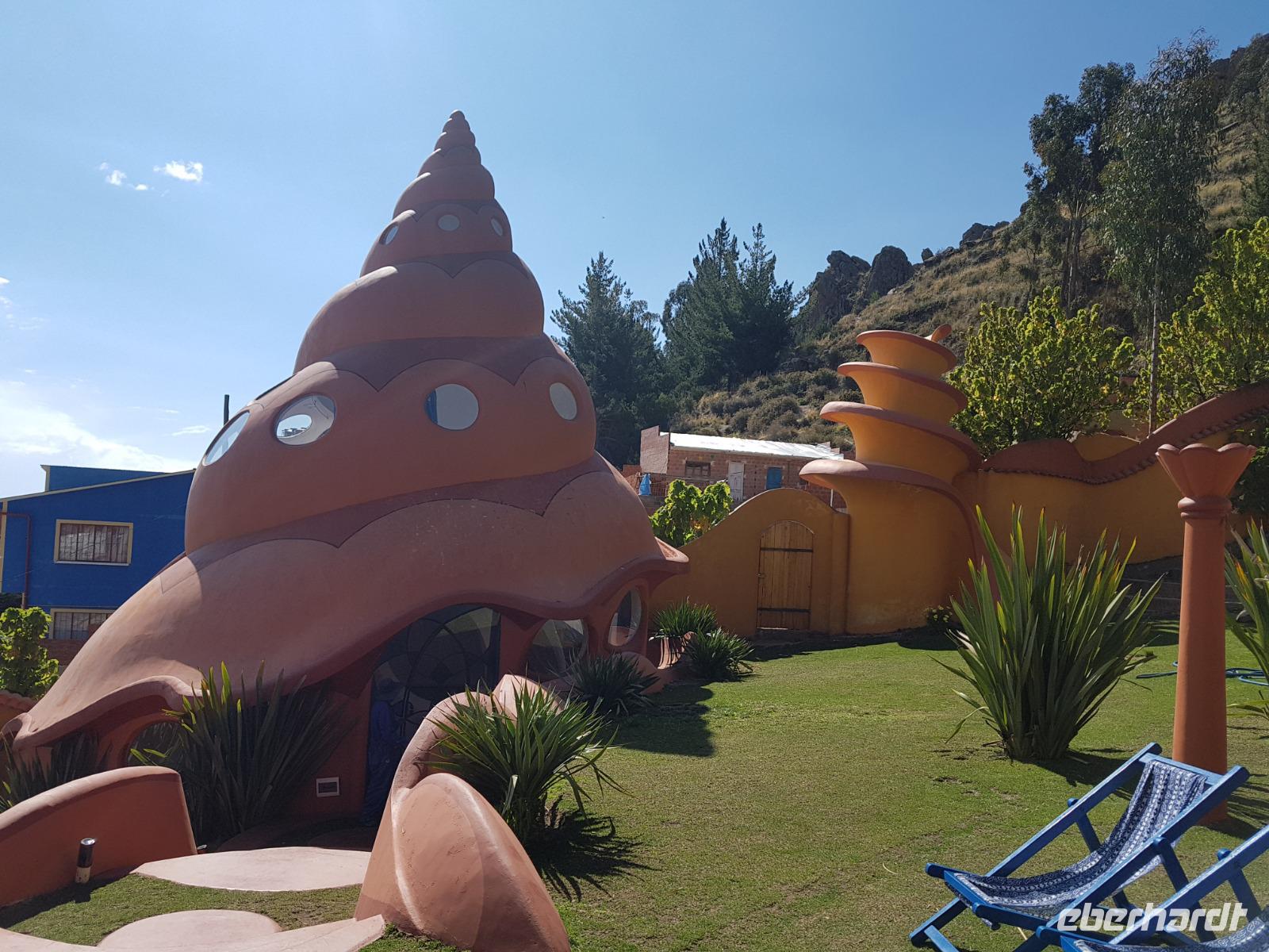 Die Übernachtung auf der Sonneninsel mitten im Titicaca-See war einmalig. Diese Ruhe. Wir genießen die Bevor wir ins Bett gehen gibt es noch ein tolles Abendessen am Kamin. Danach können wir draußen den wunderschönen Sternenhimmel beobachten. Es ist einfach herrlich hier zu sein. Ein Besuch des Titicaca-Sees mit einer komfortablen Übernachtung auf der Sonneninsel lässt uns die Einmaligkeit und Mystik dieses Ortes spüren. Unvergesslich. Nach Sonnenaufgang und einem guten Frühstück mit frisch gepresstem Orangensaft und frischem Obst besuchen wir erst mal die berühmte Inka-Treppe mit ihren Gärten und Quellen. Danach steigen wir zum Bootsanleger hinab. Ab und zu kommen an uns Einheimische mit voll beladenen Eseln vorbei. Mit dem Kleinboot von gestern fahren wir zum Mondinsel. Dort besuchen wir den Jungfrauen Tempel und erfahren Spannendes über seine Geschichte. Wir haben heute vom Hotel ein kleines Lunchpaket bekommen und wir wollen es mitten auf dem Titicaca-See auf dem Dach des Schiffes essen. Herrlich. Sonnig. Kein wind. Einmalig. Am Nachmittag erreichen wir wieder den kleinen Ort Copacabana, wo wir heute im tollen Hotel Las Olas übernachten werden. Bevor wir am Nachmittag etwas Freizeit haben, besuchen wir die Basilika der Madonna von Copacabana. Hier sang Benjamin ein paar Lieder. Rosie sagte mir, dass ich beim Singen eine Frau aus Bolivien zum Weinen brachte. Die Akustik in der Kirche war echt schön und uns geht es gut. Wir genießen unseren Aufenthalt in diesem tollen Hotel. Einige Gäste wollen hier sogar zwei Nächte bleiben. Hier gibt es Hängematten, Alpacas, grüne Wiesen, Sonne und einen wunderschönen Blick auf den Titicaca-See. Was will man mehr? Nach dem Abendessen freuen wir uns, unter dem Sternenhimmel schlafen zu können. Denn einige Zimmer haben sogar Fenster an den Decken, die einen tollen Blick auf Kassiopeia, die Milchstraße und Orion ermöglichen.