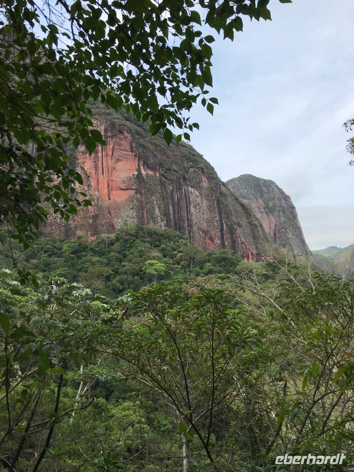 Nachdem wir heute Morgen schon etwas durch die schöne Anlage des Landhauses spaziert waren, erwartete uns wieder ein gutes Frühstück, diesmal sogar mit hausgemachtem Brot sowie hausgemachtem Lachsschinken. Gut gesättigt verließen wir Samaipata schließlich und fuhren zunächst einmal den Weg zurück, den wir gestern auch gekommen waren. Leider meinte es das Wetter zunächst nicht allzu gut mit uns, denn es begann schon bald etwas zu regnen. Doch davon ließen wir uns die Laune nicht verderben. Ein kleines Stück wanderten wir entlang der Straße und genossen die Aussicht auf die Umgebung. Nachdem wir die Hauptstraße schließlich verlassen hatten, erwartete uns ein etwas abenteuerlicher Streckenabschnitt, denn es ging recht steil aufwärts. Doch unser Busfahrer meisterte dies mit Bravur und brachte uns sicher zu den Jeeps, die uns bereits erwarteten. Mit unserem Gepäck stiegen wir um und fuhren das letzte Stück bis zum Refugio. Nach der Fahrt durch den dichten Regenwald kamen wir schließlich auf einer Lichtung an. Hier fanden wir uns inmitten des dichten Waldes, umgeben von malerisch rot gefärbten Felsen wieder. Einfach atemberaubend! Während wir zum Haupthaus spazierten, drang uns ein sehr angenehmer Geruch entgegen. Schon bald stellten wir fest, woher dieser kam: Im Ofen direkt vorm Restaurant wurde Kaffee frisch geröstet. Schließlich bezogen wir auch unsere gemütlich eingerichteten Zimmer und trafen uns wenig später zum gemeinsamen Mittagessen. Gut gestärkt und ausgerüstet mit dem zwingend notwendigen Mückenspray begaben wir uns schließlich auf eine ca. 3-stündige Wanderung durch den Regenwald. Unsere örtliche Reiseleiterin Santa, welche vom Refugio mitkam, zeigte uns einige Pflanzen, die Tiere wollten sich uns leider nicht zeigen. Trotzdem genossen wir die herrliche Landschaft und fotografierten nach Herzenslust. Wunderschöne Blumen sowie beeindruckende Bäume konnten wir bewundern, beispielsweise den Bibosi, welcher durch seine weniger liebevolle Umarmung andere Bäume zum Absterben brachte. Den einen oder anderen Anstieg gab es dabei zu bewältigen, aber alle meisterten dies bestens. Schließlich wurden wir mit einem herrlichen Ausblick vom Condor-Aussichtspunkt belohnt. Wir konnten auf die Lichtung des Refugios sowie auf den umliegenden Wald herabblicken, alles umgeben von malerischen Felsen. Nach einem letzten Abstieg kamen wir schließlich wieder am Refugio selbst an und freuten uns auf einen Kaffee. Direkt danach ging es weiter zu drei Wasserfällen in unmittelbarer Umgebung. Hier trauten sich auch einige Mutige ins Wasser und badeten unter zwei der drei Wasserfälle. Herrlich erfrischend! Im Anschluss blieb etwas Zeit zur Erholung in dieser wunderschönen Umgebung. Wir genossen die Ruhe hier und konnten dabei den Geräuschen des Regenwaldes um uns herum lauschen. Schließlich trafen wir uns wieder zum gemeinsamen Abendessen und ließen den Abend inmitten des Regenwaldes gemütlich ausklingen.
