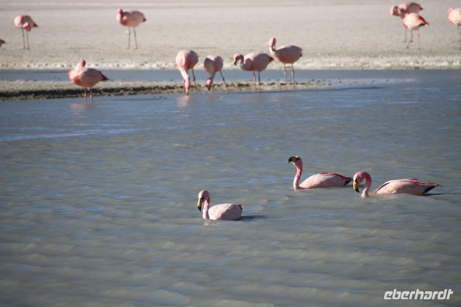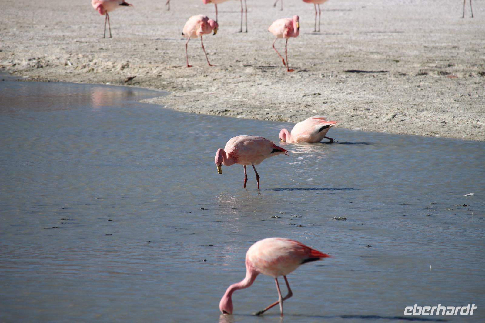 Der heutige Tag begann etwas früher als zuvor. Bereits 06.00 Uhr trafen wir uns zum gemeinsamen Frühstück, um dann auch schon 06.30 Uhr eingepackt in warme Sachen das Hotel zu verlassen. Nach einer kurzen Fahrt erreichten wir schließlich den bekannten Arbol de Piedra, welchen wir bereits auf zahlreichen Fotografien, beispielsweise in unserem Hotel in Uyuni, bewundert hatten. Nun konnten wir ihn sowie auch andere beeindruckende Steinformationen in der herrlichen Morgensonne fotografieren. Was für ein traumhafter Anblick! Anschließend fuhren wir zur Laguna Colorada, welche durch den recht hohen Mineralstoffgehalt eine entsprechende Färbung aufweist. Dazu konnten wir kleine, weiße Borax-Inseln erkennen, welche das Farbenspiel perfekt machten. Unser Reiseleiter erzählte uns, dass die Fläche dieser Lagune in den letzten Jahren bereits von 64 km2 auf ca. 35 km2 zurückgegangen war. Auch hier konnten wir wieder zahlreiche Flamingos beobachten, denn diese fühlten sich hier offensichtlich äußerst wohl. Zur Brutzeit kann man hier wohl ca. 60.000 Flamingos beobachten. Diese Zahl erreichten wir heute nicht, es war aber dennoch beeindruckend. Wir genossen die absolute Stille, in welcher nur die Laute der Flamingos zu hören waren. Einfach traumhaft, dieses Naturschauspiel!