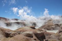 Nach einer weiteren Stunde Fahrt erreichten wir schließlich das ca. 2 km2 große Geysirfeld Sol de Manana, welches jedoch hauptsächlich aus Fumerolen besteht und nur einen wirklichen Geysir vorzuweisen hat. Dennoch war es dadurch nicht weniger beeindruckend. Hier befanden wir uns nun in ca. 5.000 Metern Höhe - dem höchsten Punkt während unserer Reise durch Bolivien. Entsprechend vorsichtig begaben wir uns auf einen Spaziergang, um die Fumerolen aus nächster Nähe bestaunen zu können. Langsam begaben wir uns auf den Rundweg und merkten dennoch, dass wir verhältnismäßig schnell außer Atem kamen. Mit vielen tollen Fotos im Gepäck setzten wir unsere Fahrt fort.