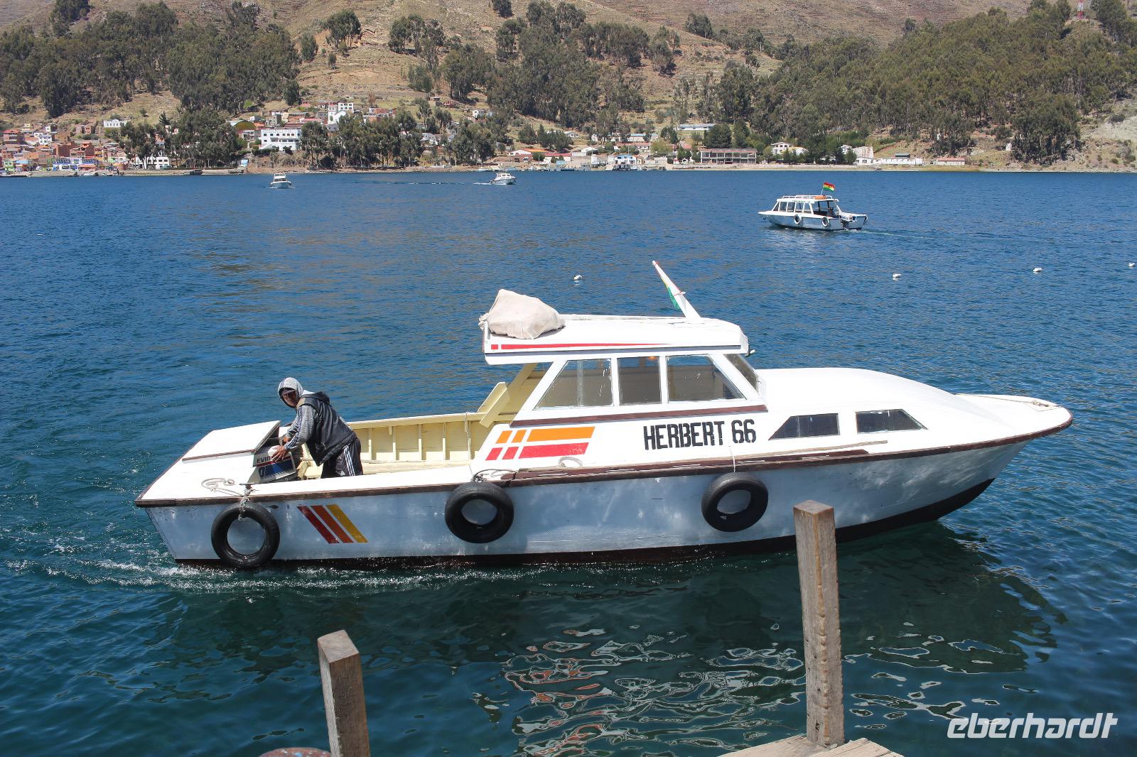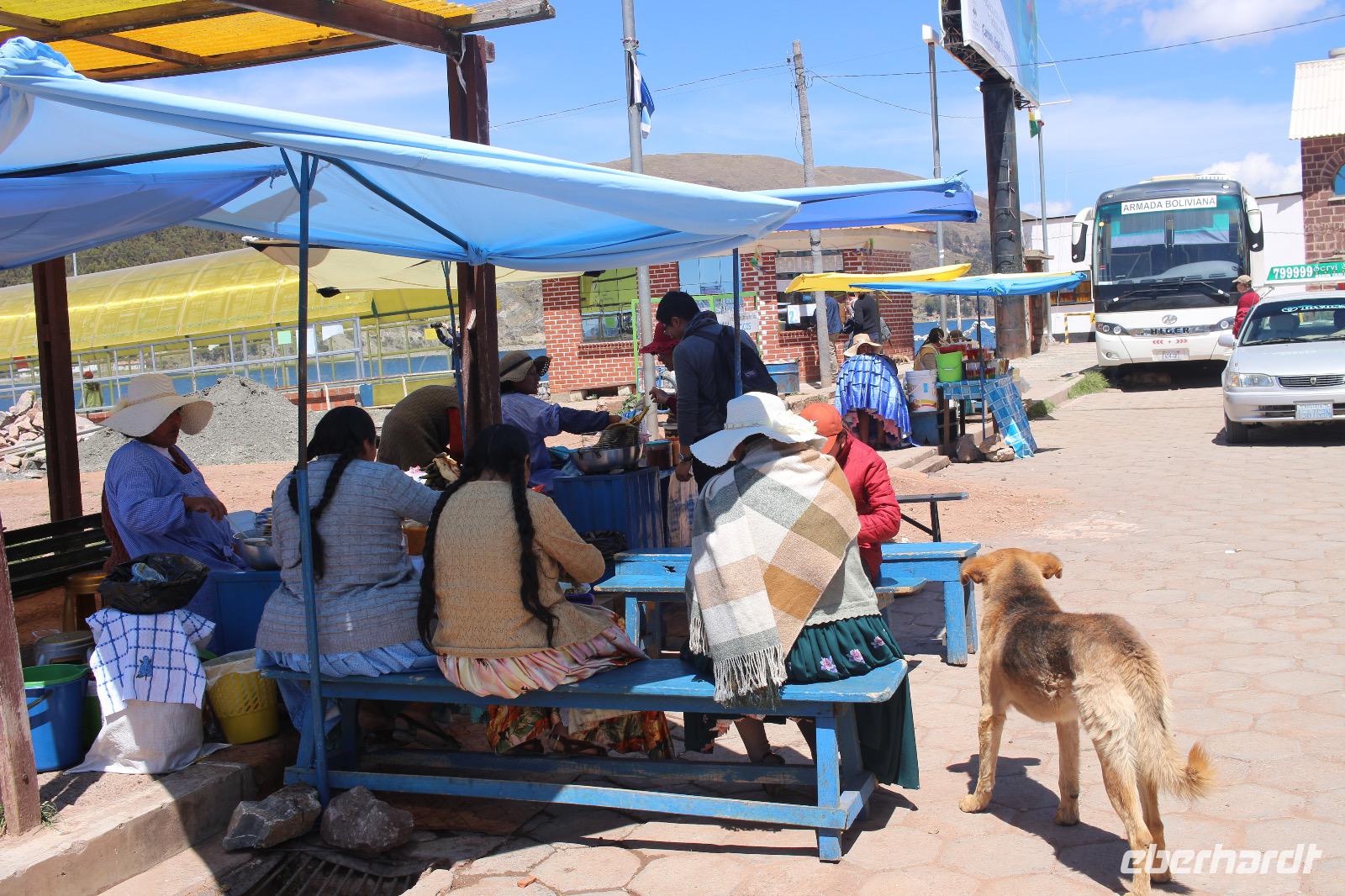 Am Morgen verließen wir die Stadt La Paz wieder in Richtung El Alto. Unterwegs hatten wir noch einen traumhaften Blick auf die umliegenden 6.000-er Berge, wie beispielsweise den Huayna Potosí. Als wir durch El Alto fuhren, konnten wir beobachten, wie bereits der Markt aufgebaut wurde, denn sonntags und donnerstags findet hier der größte Freiluftmarkt Südamerikas statt, auf welchem vom Schokobonbon bis zum Auto wirklich alles erstanden werden kann. Wir erhaschten zahlreiche Blicke auf das beginnende bunte Treiben und fotografierten aus dem Bus heraus. Als wir die Stadt dann hinter uns gelassen hatten, bemerkten wir sobald eine Veränderung in der Landschaft. Nach einiger Zeit zeigte sich uns dann schließlich der Titicacasee, der höchste beschiffbare See der Welt. Wir fuhren an dessen Ufer ein Stück entlang und besuchten einen Aussichtspunkt, um die herrliche Landschaft zu fotografieren. Am Dorf Tequina mussten wir kurz umsteigen und die schmalste Stelle des Sees mit einem kleinen Boot überqueren. Unser Bus wurde mit einer Fähre, bzw. einem Gefährt, was hierzulande als solche bezeichnet wird, ebenfalls übergesetzt. Anschließend lag noch etwas Fahrt durch die bergige Landschaft vor uns, wobei wir auch knapp an Peru vorbeikamen, bevor wir schließlich das Örtchen Copacabana auf ca. 3.800 Höhenmetern erreichten. Unser Bus brachte uns bis zum Hauptplatz, wo wir eine besondere Zeremonie beobachten konnten: die Segnung der Autos. Wer hier ein neues Auto gekauft hatte, kam wochenends nach Copacabana, um das Auto hier segnen zu lassen. Dabei erhielt dieses einen üppigen Blumenschmuck und es gab Bier und Sekt - sowohl für das Auto als auch für die Besitzer. Nach diesen Eindrücken besuchten wir noch die imposante Kathedrale. In dieser fand gerade eine Messe statt, welcher wir kurze Zeit beiwohnten - wirklich sehr interessant! Anschließend besuchten wir einige Nebenräume, indem wir uns die Heiligen Jungfrauen aus aller Welt anschauten sowie anhand einer Bildergeschichte mehr über die Heilige Jungfrau von Copacabana erfuhren. Anschließend bummelten wir vom Stadtzentrum bis hinunter zum Hafen. Nun stand jedem erstmal etwas Zeit zur freien Verfügung, welche die meisten nutzen, um eine Kleinigkeit zu essen oder zu trinken.