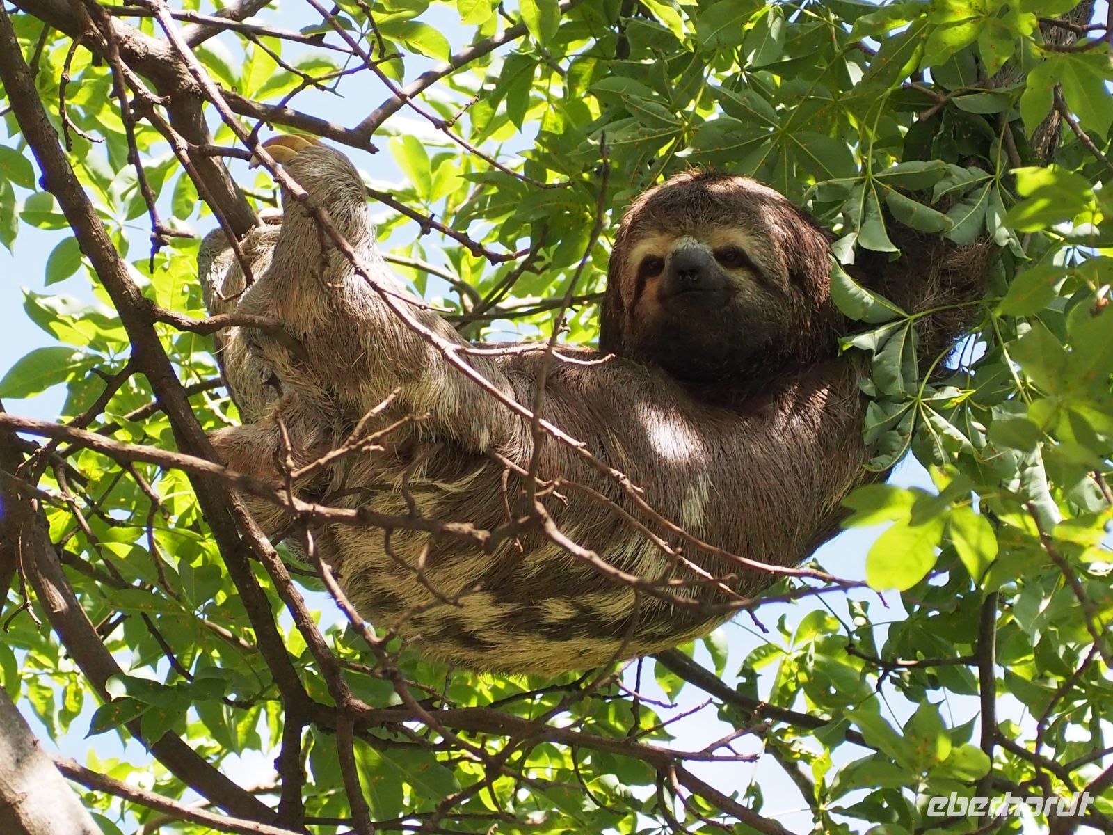 Nach etwa einer Stunde erreichen wir das Dorf El Torno. Um den begrünten Hauptplatz herrscht geschäftiges Treiben und die Bewohner nutzen den schattigen Ort als Treffpunkt zum morgendlichen Plausch. Es soll hier aber auch noch andere, sehr niedliche, Bewohner geben, wie uns Omar erklärt, nämlich Faultiere. Aufgeregt steigen wir aus dem Bus aus und schauen automatisch nach oben in die Bäume. Aber wonach schauen wir eigentlich? Die meisten von uns haben noch nie ein Faultier in Echt gesehen und wenn, dann im Zoo. Die langsamen Tiere sind tatsächlich ziemlich gut getarnt und in den Baumkronen schwer zu entdecken. Omar fragt einige Einwohner, die jedoch nur mit den Köpfen schütteln. Nach einigen intensiver Suche finden wir dann schließlich doch noch eins - und was für eins. Das große männliche Dreifingerfaultier zieht für uns eine filmreife Faultiershow ab und lässt sich bereitwillig von allen Seiten fotografieren. So viel Glück hat man definitiv nicht oft.