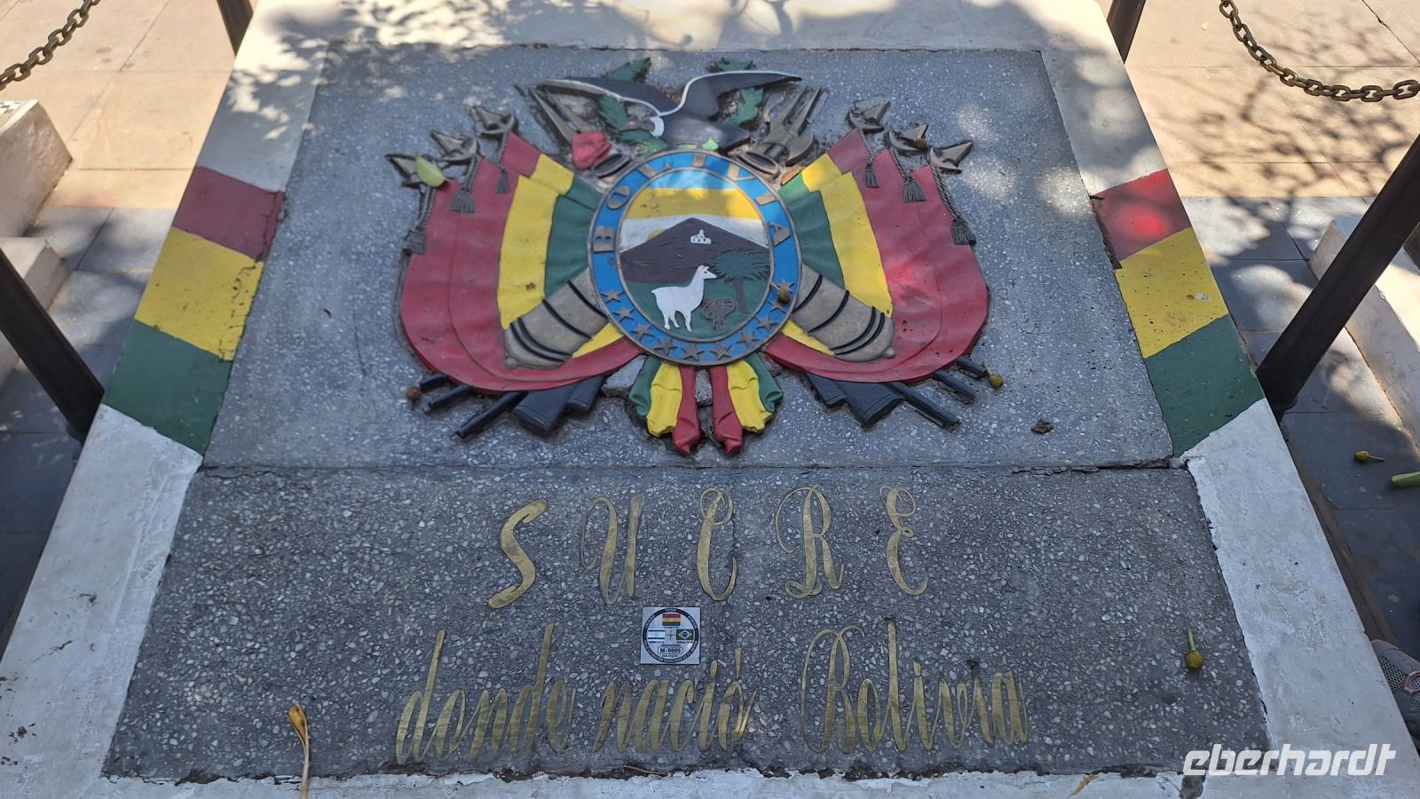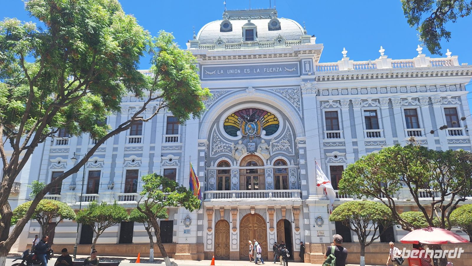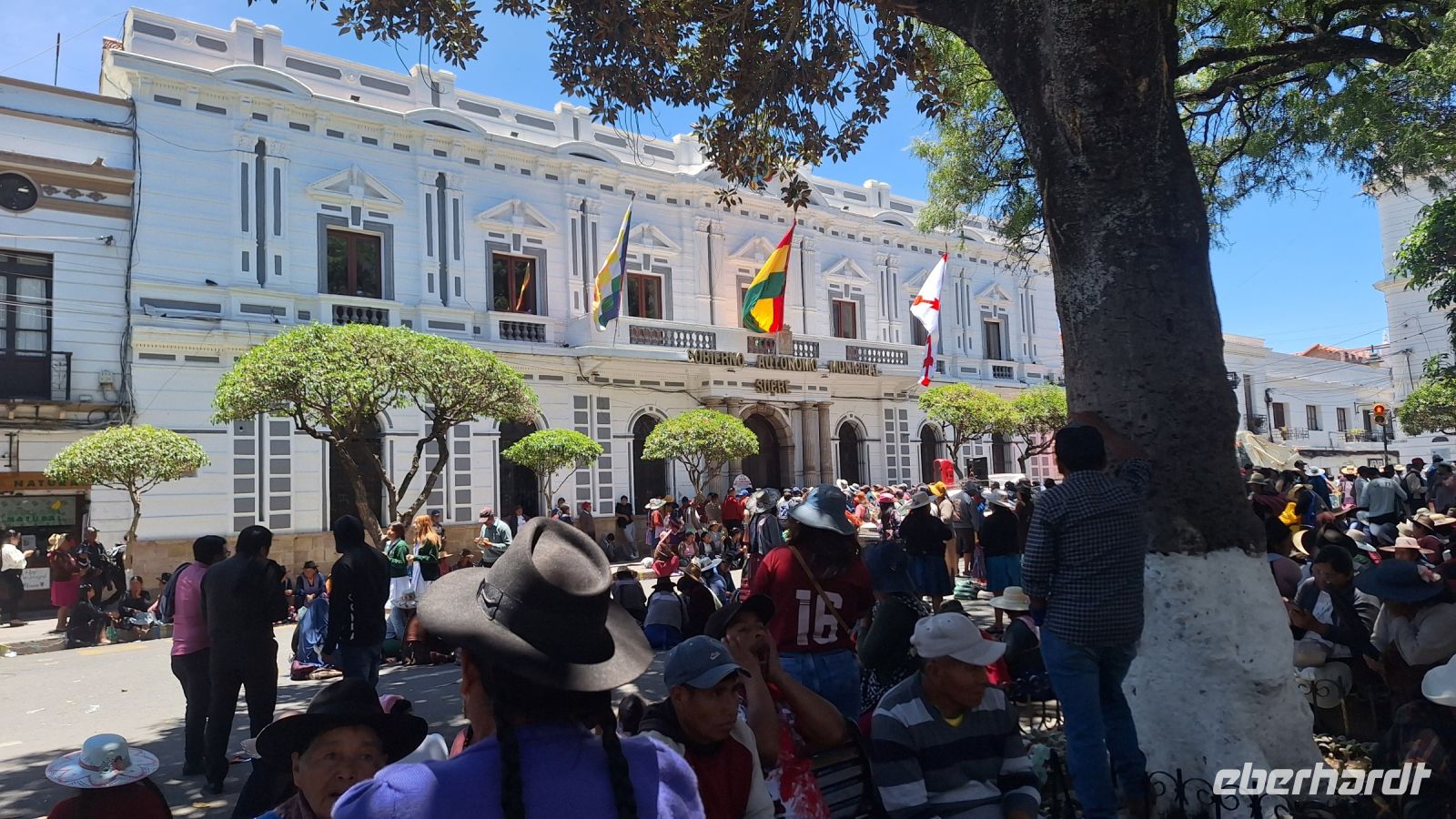 Mit dem Bus fahren wir ins lebhafte Zentrum der Kolonialstadt, die auch oftmals die "weiße Stadt" genannt wird. Wir haben Glück und können schon in unser Hotel in einer alten Stadtvilla einchecken bevor wir zur Stadtbesichtigung aufbrechen. Wir spazieren wenige Querstraßen weiter in Richtung des Hauptplatzes, den Plaza 25 de Mayo. Zu unserer Freude findet hier gerade ein friedlicher Protest der lokalen Bevölkerung statt und alle Zufahrtsstraßen sind blockiert. So profitieren wir von freien Straßen und zusätzlich von einer Vielfalt von traditionell gekleideten Frauen jeden Alters, die sich über unsere neugierigen Blicke sogar zu freuen scheinen. Neben dem Rathaus, wo sich der Protest abspielt, dann der Platz aber auch mit seinen zahlreichen anderen imposanten Gebäuden beeindrucken. Wir werfen einen Blick in die Casa de la Libertad, einst ein Franziskanerkloster, in dem 1822 die Unabhängigkeit Boliviens besiegelt wurde.