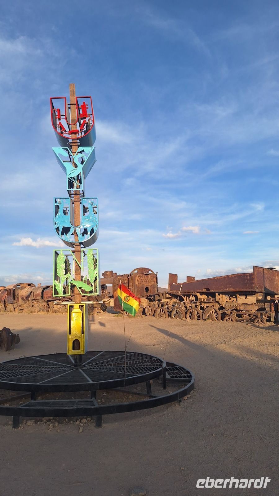 Wenig später erreichen wir das erste Salzhotel, welches heute als kleines Museum fungiert. In dessen Umgebung fotografieren wir zunächst das große Dakar-Denkmal, welches an die durch den Salzsee verlaufenden Dakar-Rallys erinnert und von dem mittlerweile zahlreiche kleine Kopien existieren. Dann erfolgt das obligatorische Foto an den Stehlen, an denen Reisende schon seit vielen Jahrzehnten ihre Flaggen anbringen können - eine deutsche begrüßt uns dort selbstverständlich schon.