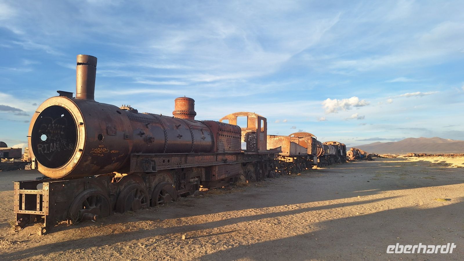 Am frühen Abend taucht dann am Horizont das gleißende Weiß der Uyuni Salzwüste auf und weckt die Vorfreude auf den nächsten Tag. Wenig später erreichen wir die Stadt Uyuni und machen uns direkt auf den Weg zum berühmten Eisenbahnfriedhof. Ende des 19. Jahrhunderts richtete man eine Bahnstrecke zwischen dem chilenischen Hafen Antofagasta und dem bolivianischen Altiplano ein, um Mineralien und Erze zu transportieren. Uyuni wurde zum wichtigen Verkehrsknotenpunkt und Bolivien zu dem südamerikanischen Land mit dem besten Eisenbahnnetz - bis in den 1940er Jahren alles zusammenbrach. Heute befinden sich über 100 Lokomotiven und Eisenbahnwagons abgestellt am Stadtrand und dienen nunmehr als Touristenattraktion und Fotomotiv. Kurz vor Sonnenuntergang haben wir diese beeindruckende Kulisse ganz für uns alleine.