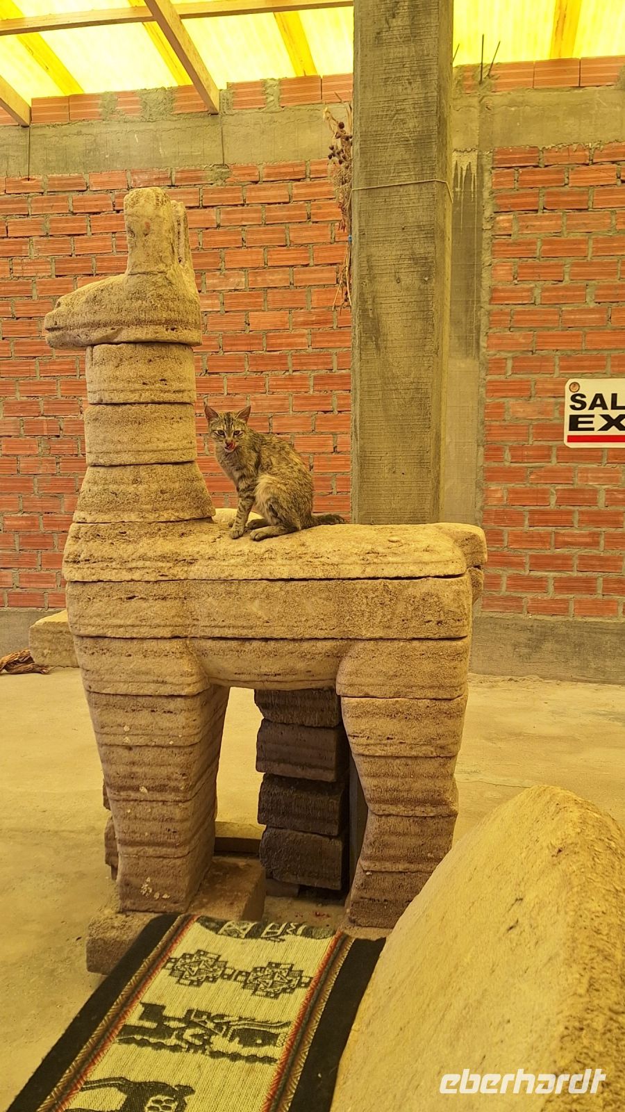 Wir verlassen den Titicacasee heute wieder in Richtung La Paz, jedoch natürlich nicht, ohne die wichtigste archäologische Stätte Boliviens zu besichtigen. Zunächst einmal müssen wir den gleichen Weg nehmen, wie auf der Hinfahrt. Gegen Mittag erreichen wir die Kleinstadt Laja, wo uns Moises und Omar als Proviant das örtliche Fladenbrot besorgen, dann geht es weiter nach Tiwanaku. Neben dem heutigen Dorf befindet sich die Ruinenstätte aus Prä-Inka-Zeiten, welche wir besichtigten. Die Kultur der Tiwanakus, welche hier von ca. 1.500 v. Chr. bis 1.200 n. Chr. siedelten und eine äußerst fortschrittliche Kultur sowie ein Zentrum für Kultur und Religion darstellten, gilt als die älteste und wichtigste Kultur des Andenhochlandes. Neben zahlreichen Keramikgegenständen zeugen heute auch noch die Überreste architektonischer Meisterleitungen von der einstigen Blüte. Wir beginnen unsere Besichtigung mit dem Keramikmuseum und da es währenddessen beginn zu gewittern, besuchen wir gleich im Anschluss das sogenannte Monolithen-Museum. Das Herzstück ist der Bennett-Monolith, welcher 1923 vom gleichnamigen US-amerikanischen Archäologen gefunden wurde. Die Stele aus Sandstein ist 7,3 Meter hoch und zeigt eine reichverzierte menschliche Figur. Die Stele wurde als Zeichen des Patriotismus gut sichtbar für alle Bewohner im Stadtzentrum von La Paz aufgestellt und später in ein Freilichtmuseum umgesiedelt. Erst 2002 kam sie zurück nach Tiwanaku.