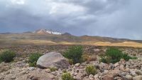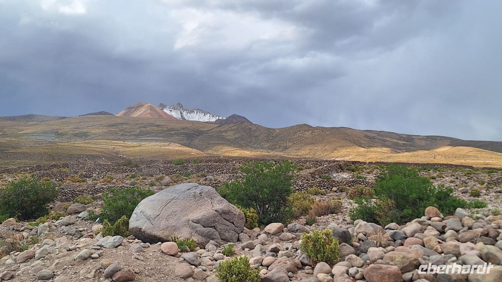 Wir fahren nun auf den Vulkan Thunupa zu. Mit seinen 5.432 Metern Höhe ragt er majestätisch aus der Landschaft empor. Am Fuße des gewaltigen Bergs machen wir einen Stopp, um die dort weidende Lama-Herde zu fotografieren. Ein schönes Bild. Dann geht es eine Serpentinenpiste hinauf. Etwa auf halber Höhe des Vulkans angekommen, haben wir eine tolle Aussicht auf die Salzpfanne. Von hier aus führt ein Weg durch eine herrliche Landschaft hindurch zu einer Höhle. Dort befinden sich einige Mumien, welche noch sehr gut erhalten waren und Zeugen längst vergangener Zeiten sind. Anschließend besuchen wir im Dorf am Fuße des Vulkans gemeinsam eine Art Heimatmuseum. Unser Reiseleiter erzählt uns einiges zu den ausgestellten Gegenständen, welches hauptsächlich Gebrauchsgegenstände aus der Region sein. Anschließend bummeln wir noch etwas durch den dazugehörigen Steingarten, bevor wir unsere Fahrt fortsetzten und wieder auf den Salzsee fahren. Während wir auf den Sonnenuntergang warten und die Zwischenzeit zu verschiedensten Fotos nutzen, bereiten unsere Fahrer eine kleine Überraschung für uns vor: uns erwartet ein kleiner „Sundowner" mit Rotwein und verschiedenen Knabbereien. Wir stoßen auf den wunderbaren Tag an. Der Sonnenuntergang scheint zwar zeitweilig in Frage zu stehen, da sich direkt neben uns ein Unwetter zusammenbraut, aber dieses Zusammenspiel verschiedener Wetterlagen zaubert eine fast mystische Atmosphäre über dem glitzernden weißen Salz. Das einzige was jetzt noch fehlt ist eigentlich ein Regenbogen. Kaum ausgesprochen wird unser Wunsch erhört - einfach magisch!