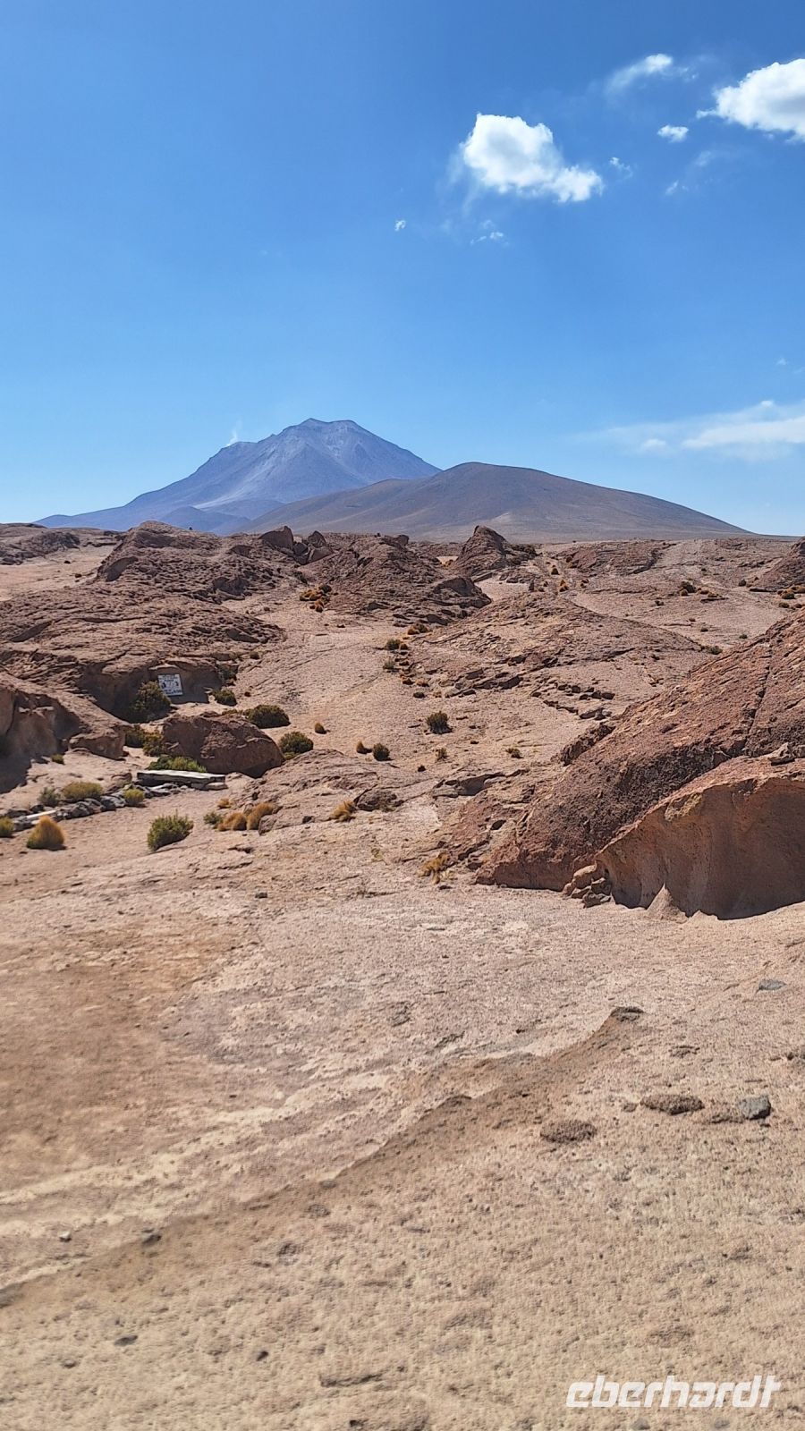 Nach einer etwas längeren Fahrt erreichen wir eine Silizium-Gewinnungsanlage und schließlich auch wieder "Festland". Wir fahren nach San Pedro de Quemes, wo wir in einem Gasthaus Mittagessen. Das Dorf blickt auf eine lange Geschichte zurück. Hier herrschte früher Krieg zwischen Bolivien und dem Nachbarland Chile. Streitpunkt war der Seezugang Boliviens, doch der internationale Gerichtshof entschied, dass Chile rechtlich nicht verpflichtet ist, über diesen Zugang zum Pazifik zu verhandeln. Daher bleibt Bolivien der Zugang bis heute verwehrt, auch wenn viele Bolivianer glauben, dass das letzte Wort in diesem Streit noch nicht gesprochen ist. Trotz des Konflikt gibt es natürlich Handelsbeziehungen zum Nachbarland und so erreichen wir bei unserer Weiterfahrt durch die Wüste Bahnschienen, auf welchen drei Mal die Woche Rohstoffe über die Grenze transportiert werden. Wir befinden uns nun nur wenige Kilometer von der Grenze entfernt, auf welcher sich auch der 5.870 Meter hohe Vulkan Ollagüe befindet, der zumindest ein wenig Dampf für uns ausspuckt.