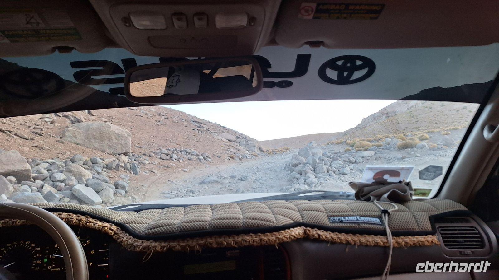 Nächster Tagesordnungspunkt ist ein Stopp mitten auf dem Salzsee. Hier können wir nun aufgrund der enorm weißen Fläche die bekannten Salzsee-Spaßfotos machen. Unser Reiseleiter Omar sowie auch unsere Fahrer hatten zahlreiche Ideen, die wir mit ihrer Hilfe gern umsetzten. So entstehen tolle Fotos, wie wir aus einem Hut herausschauen, vor einem Dino flüchten oder fast von unserer Reisebegleitung zertreten werden.
