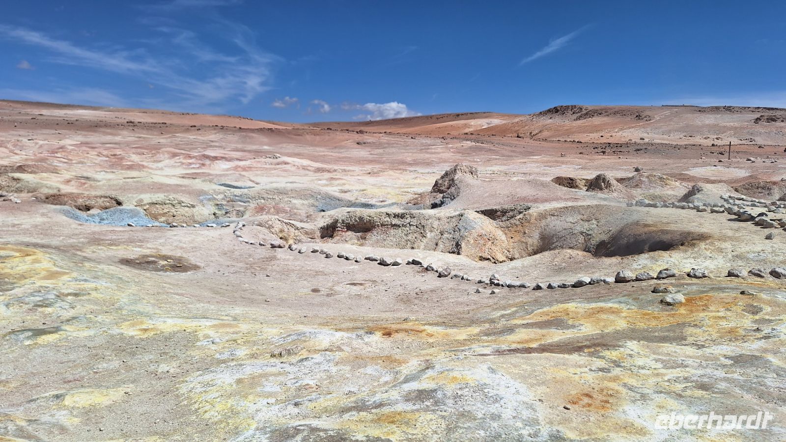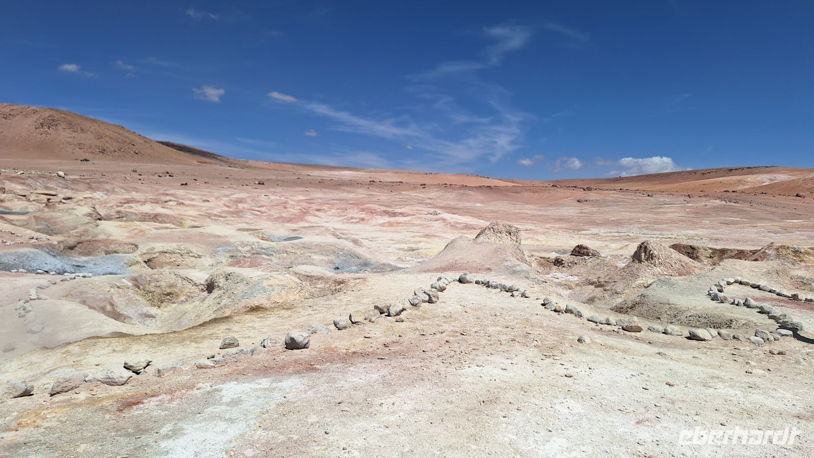 Auf fast 5.000 Metern Höhe befinden sich die Geysire und Fumaloren von Sol de Mañana. Hier beobachten wir geotektonischen Aktivitäten, denn hier brodelt es förmlich unter der Erde. Überall sind riesige und mehrfarbige blubbernde Erdlöcher und dampfende Fontänen. Der Schwefelgeruch gepaart mit der Höhe machen uns jedoch ein wenig zu schaffen und so sind wir froh, dass es nun zumindest wieder ein paar weniger Meter nach unten geht. Unterwegs legen wir weitere Fotostopps ein, wie beispielsweise in der Dalí Wüste, benannt nach dem Werk "Die verlorene Zeit" des katalanischen Malers, wo wir unter anderem den Vulkan Nelly fotografieren. Ein absolutes Highlight ist auch die Laguna Verde, welche wir gegen Mittag erreichten. Direkt an dem malerischen Vulkan Licancabur gelegen, bietet sie uns ein perfektes Fotomotiv. Ihre auffällige Farbe erhält die Lagune durch den hohen Mineralstoffgehalt, insbesondere an Magnesium, Calciumcarbonat, Blei und Arsen. Wir hatten Glück und es ging ein relativ starker Wind, sodass wir die Farbe in ihrer vollen Pracht bewundern konnten, unsere Fahrer erzählen uns allerdings, dass die Farbe vor vielen Jahren noch viel grüner gewesen sei. Aufgrund der Durchmischung mit der benachbarten Laguna Blanca und der Inaktivität des Vulkans habe der Arsengehalt im Wasser jedoch stark abgenommen. Schließlich fahren wir wieder ein Stück zurück zur Laguna Salada, wo sich auch Thermalquellen befinden. Unser Koch hat hier unterdessen ein hervorragendes Mittagessen gezaubert, welches wir uns jetzt schmecken lassen.