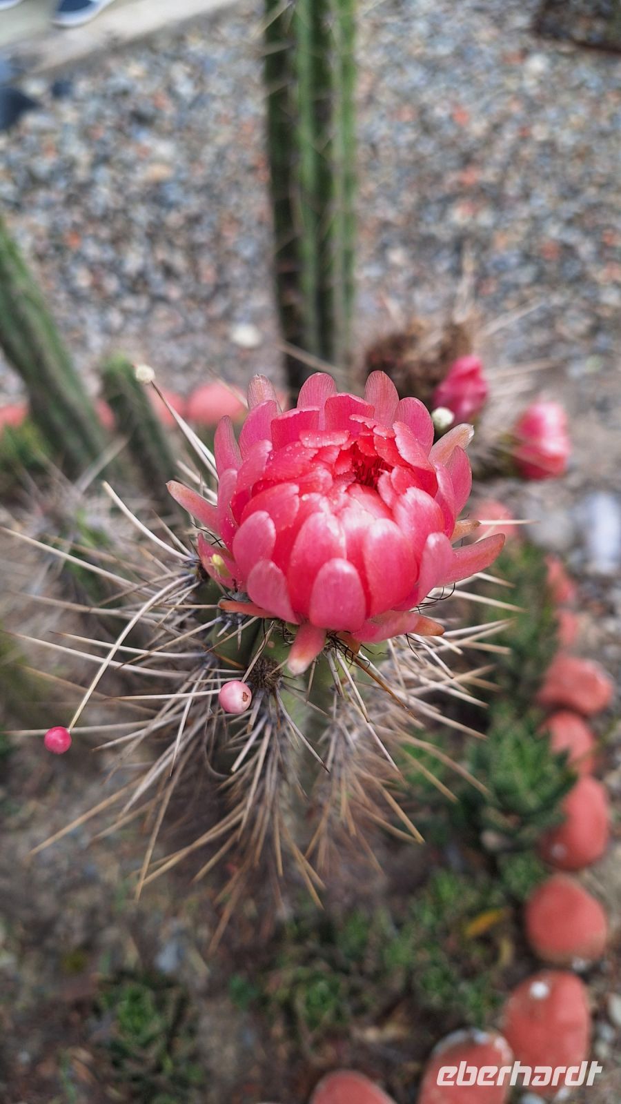 Frisch gestärkt wandern wir anschließend über die Korallenfelsen entlang eines Rundwegs hinauf bis zum höchsten Punkt der Insel, von wo aus man eine fantastische Rundumsicht genießen kann. Wir können uns kaum satt sehen an den blühenden Kakteen und schießen duzende Fotos, bevor wir zu den Jeeps zurückkehren.