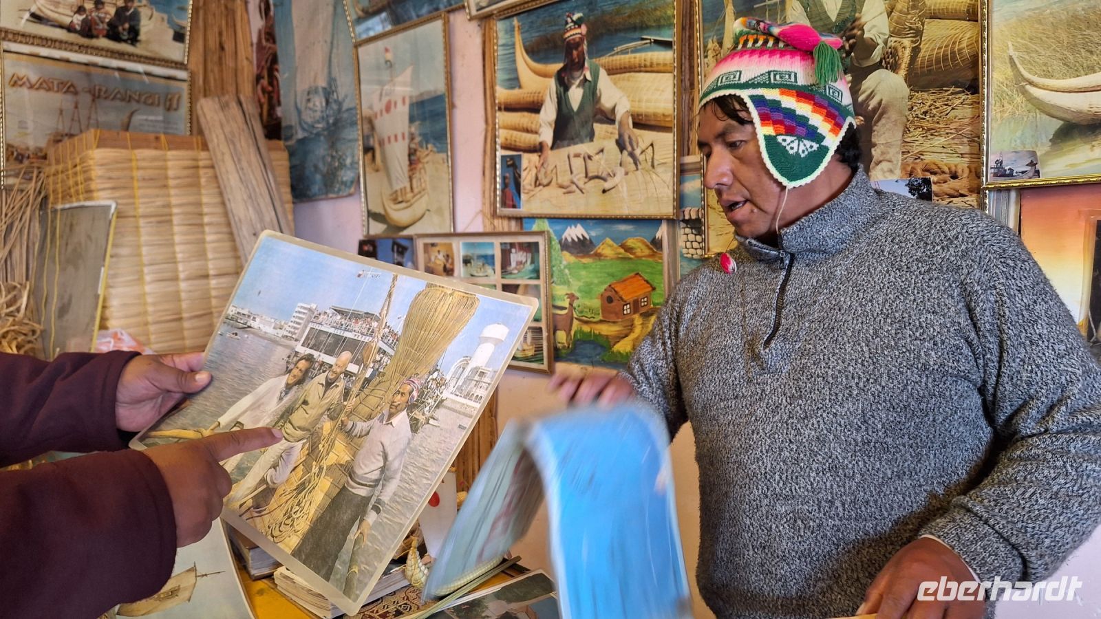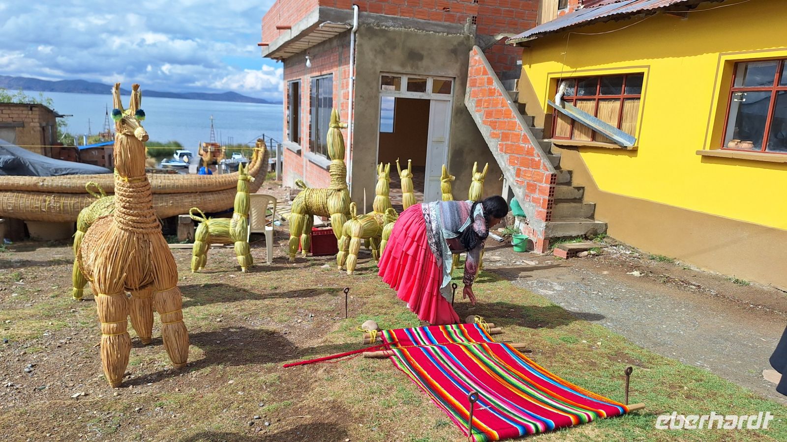 Bald schon können wir zum ersten Mal das Ufer des höchstgelegenen Sees der Welt sehen. Mit einer Fläche von 8.372 km² ist der Titicacasee 15,5 mal so groß wie der Bodensee und der größte Süßwassersee Südamerikas. Heute verläuft die Grenze zwischen Bolivien und Peru durch den See, kulturell gesehen sind sich die Menschen hier aber sehr ähnlich. Wir machen Halt in einem kleinen Dorf, wo wir Paulino Esteban und seine Familie Kennenlernen. Sie gehören zu den traditionellen Schilfbootbauern des Titicacasees und haben unter anderem dem norwegischen Abenteurer Thor Heyerdal beim Bau seiner Expeditionsschiffe geholfen. Paulino erzählt uns von den verschiedenen Booten, die vor allem sein Vater gebaut hat, er jedoch als Kind schon mithelfen durfte. Noch heute werden die Boote auf traditionelle Art und Weise gebaut und wer möchte, kann sich ein kleines für zu Hause mitnehmen.