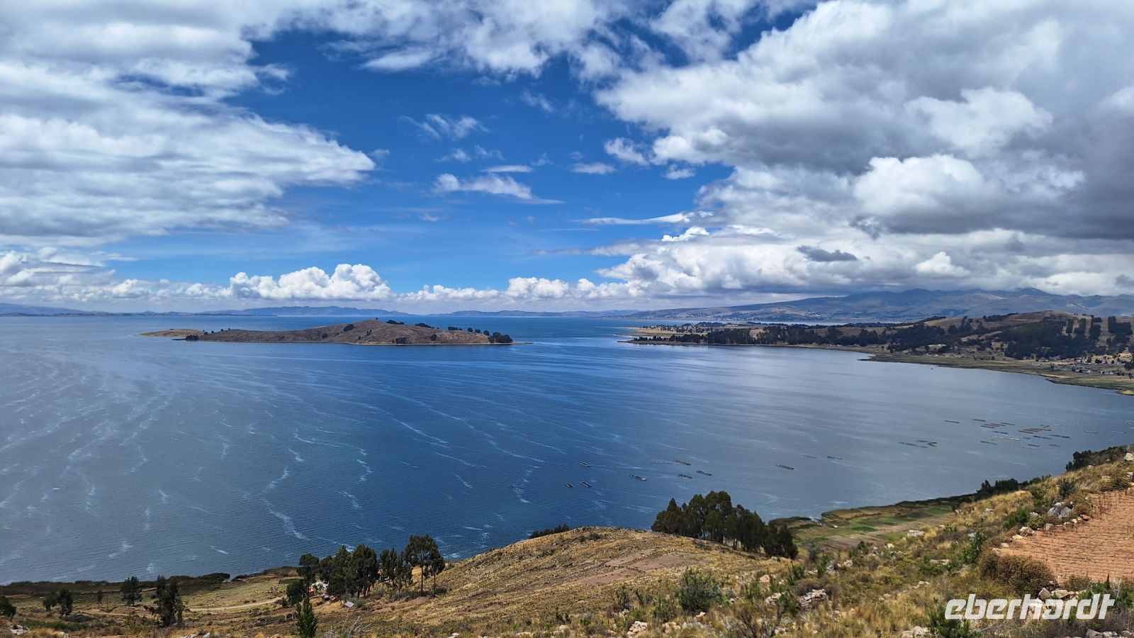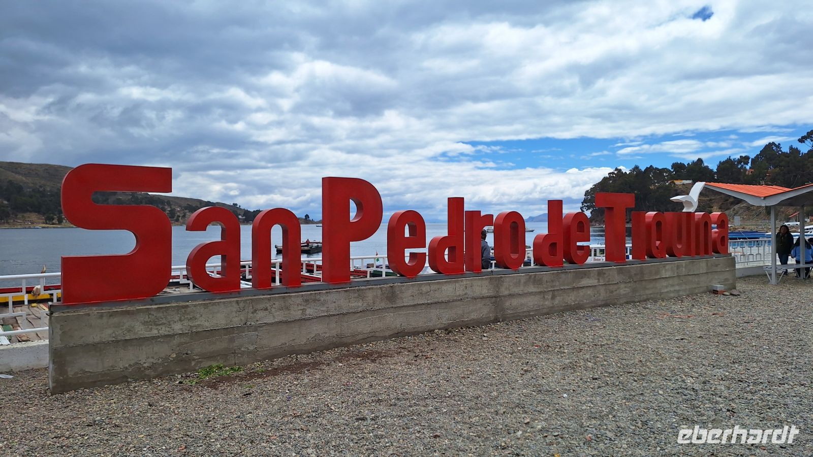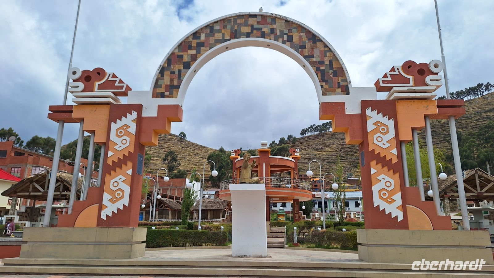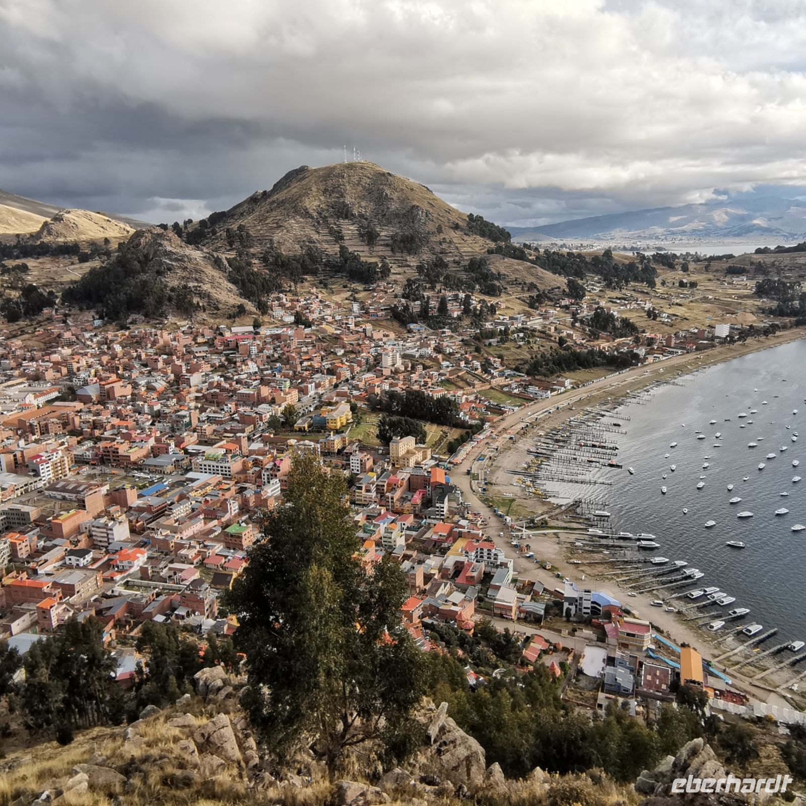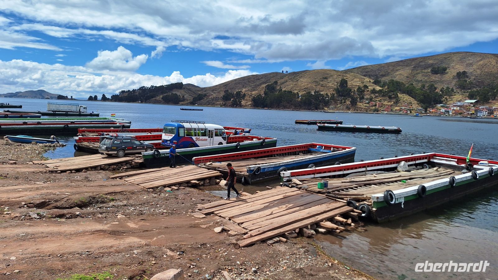 Später fahren wir weiter nach Tiquina, dort müssen wir die engste Stelle des Sees mit dem Boot überqueren. Unterdessen wird unser Bus auf einem Floß transportiert - sehr abenteuerlich. Wir sind sehr froh als unser Vehikel heil die andere Seite erreicht. Anschließend liegt noch etwas Fahrt durch die bergige Landschaft vor uns, bevor wir schließlich das Örtchen Copacabana auf ca. 3.800 Höhenmetern erreichen. Zunächst beziehen wir unsere Zimmer im wunderbar gelegenen Hotel Rosario und anschließend bleibt Zeit für eine Mittagspause. Der Fisch, den man direkt an der Uferpromenade probieren kann, ist wirklich vorzüglich.