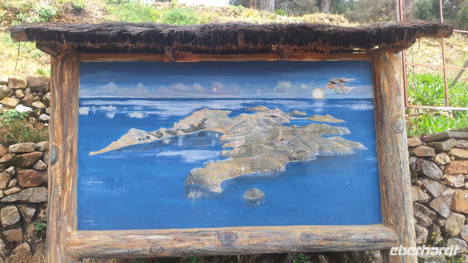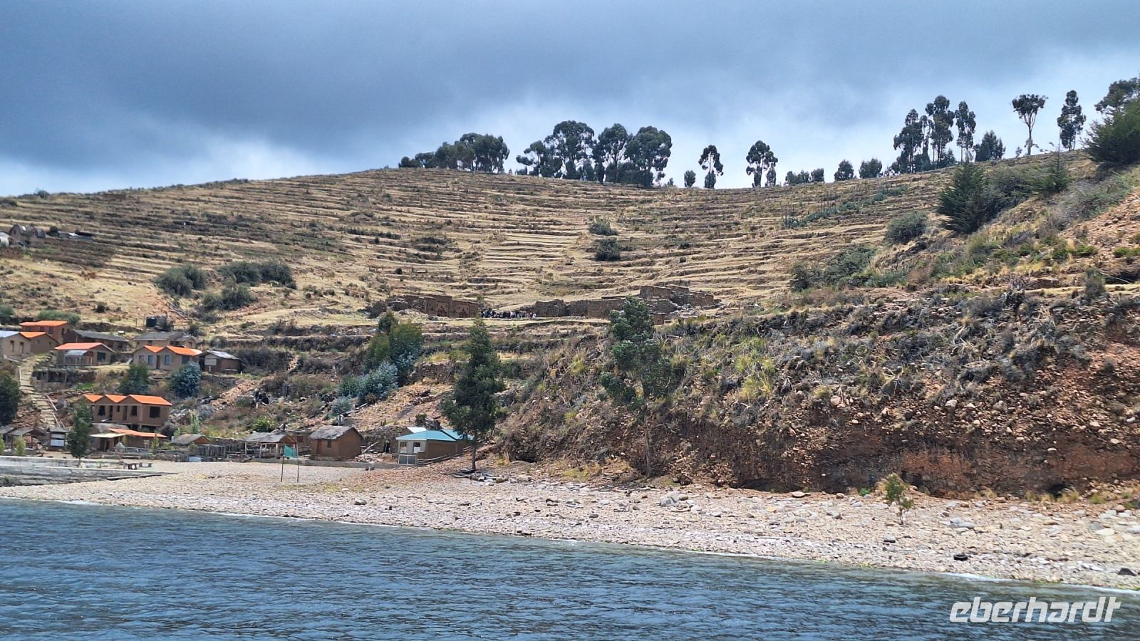 Als wir alle wieder vereint sind, treten wir dann die Überfahrt zur benachbarten Mondinsel an. Die meisten von uns sind nun so schlau gleich von Anfang an auf das "Sonnendeck" (das Dach des Boots, das nur über eine Hühnerleiter an der Seite des Boots zu erreichen ist) zu klettern, um den Stunt während der Fahrt zu vermeiden. Die Isla de la Luna ist wenig touristisch erschlossen und so müssen wir nach der Ankunft erst einmal einen recht mühsamen Pfad hinaufsteigen, um zu unserem Mittagessen zu gelangen. Uns erwartet ein traditionelles Apthapi, welches von einer lokalen Familie für uns zubereitet worden ist. Neben verschiedenen Kartoffelsorten, Mais und Bohnen werden uns Quinoa-Bratlinge, hart gekochte Eier, sowie Lachsforelle serviert.