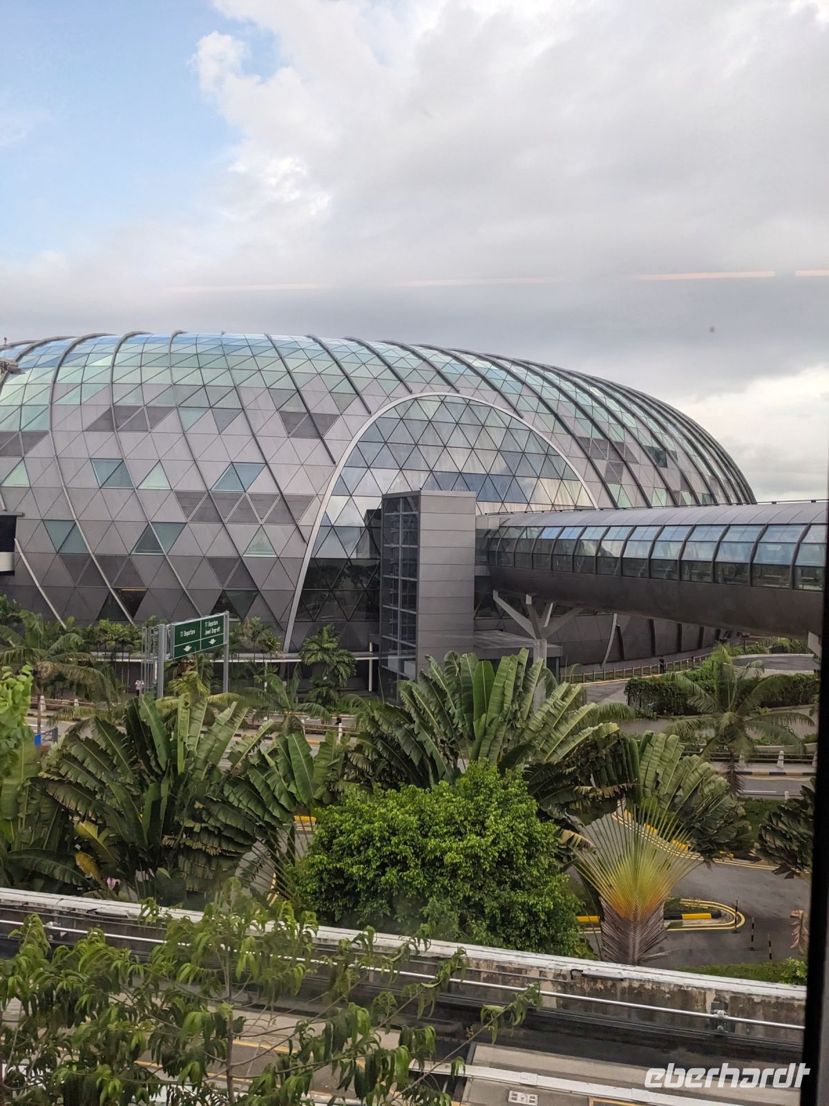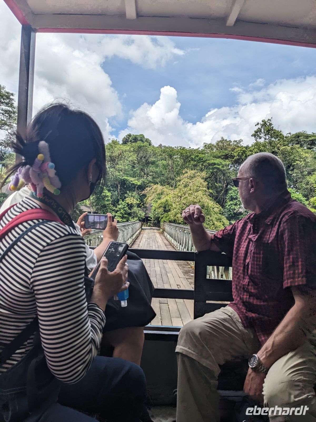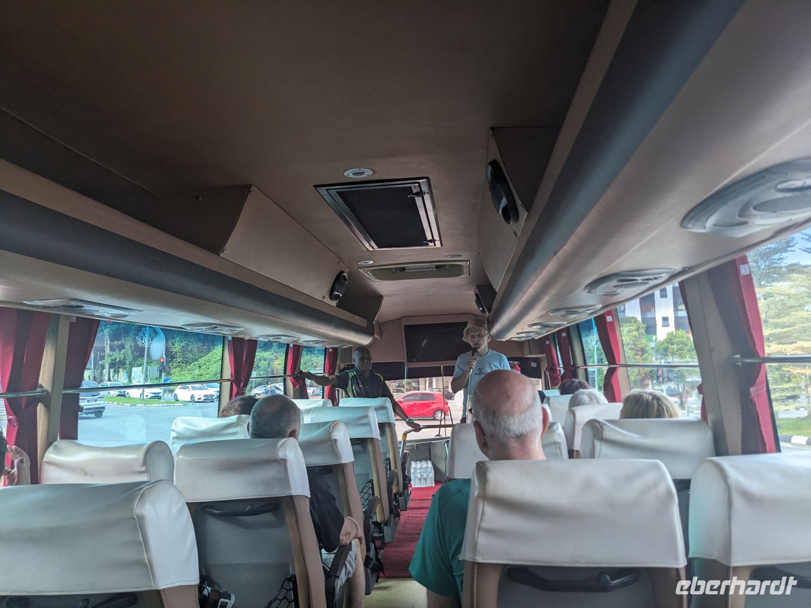 Mit den Skytrams, die die Terminals in Singapur miteinander verbinden, fuhren wir mehrmals durch den riesigen Dome, welcher mit seinem gewaltigen Wasserfall sehr eindrucksvoll ist. Anschließend flogen wir von Singapur weiter nach Kuching, wo uns unser lokaler Reiseleiter Tino sowie unser temporärer Guide für Kuching, Selvam, in Empfang nahmen. Leider hatte es ein Koffer nicht mit ans Ziel geschafft. Zum Glück wurde hier gut gepackt und die zwei waren erstmal mit dem Nötigsten versorgt. Ob wir wohl Glück haben und der Koffer rechtzeitig wieder auftaucht?