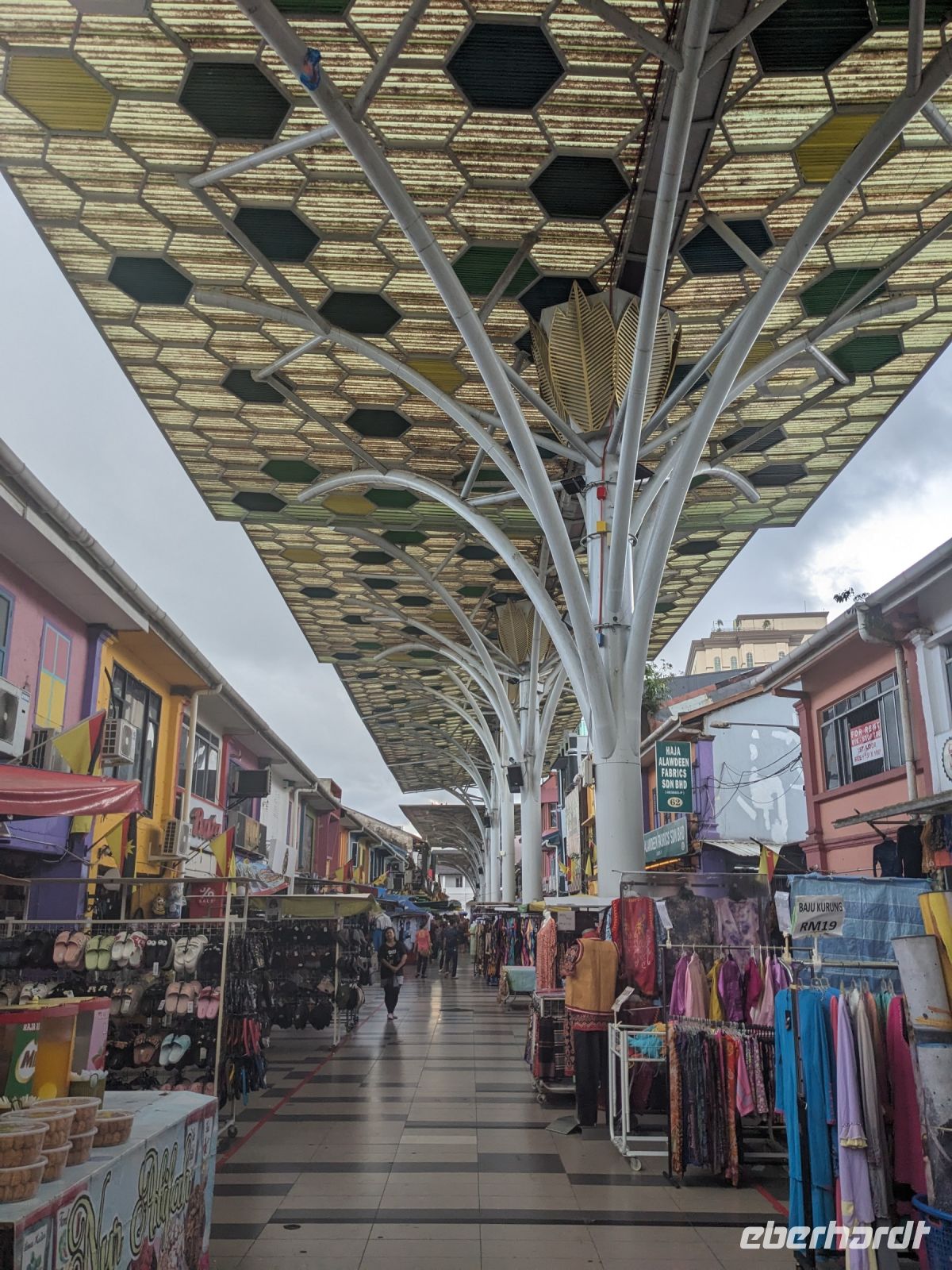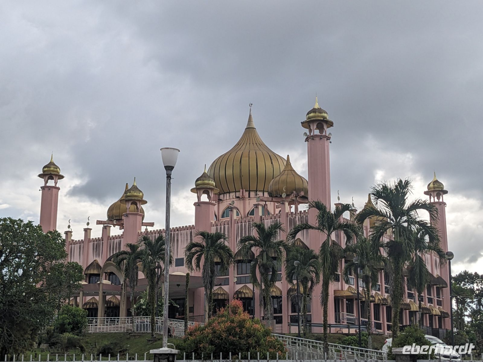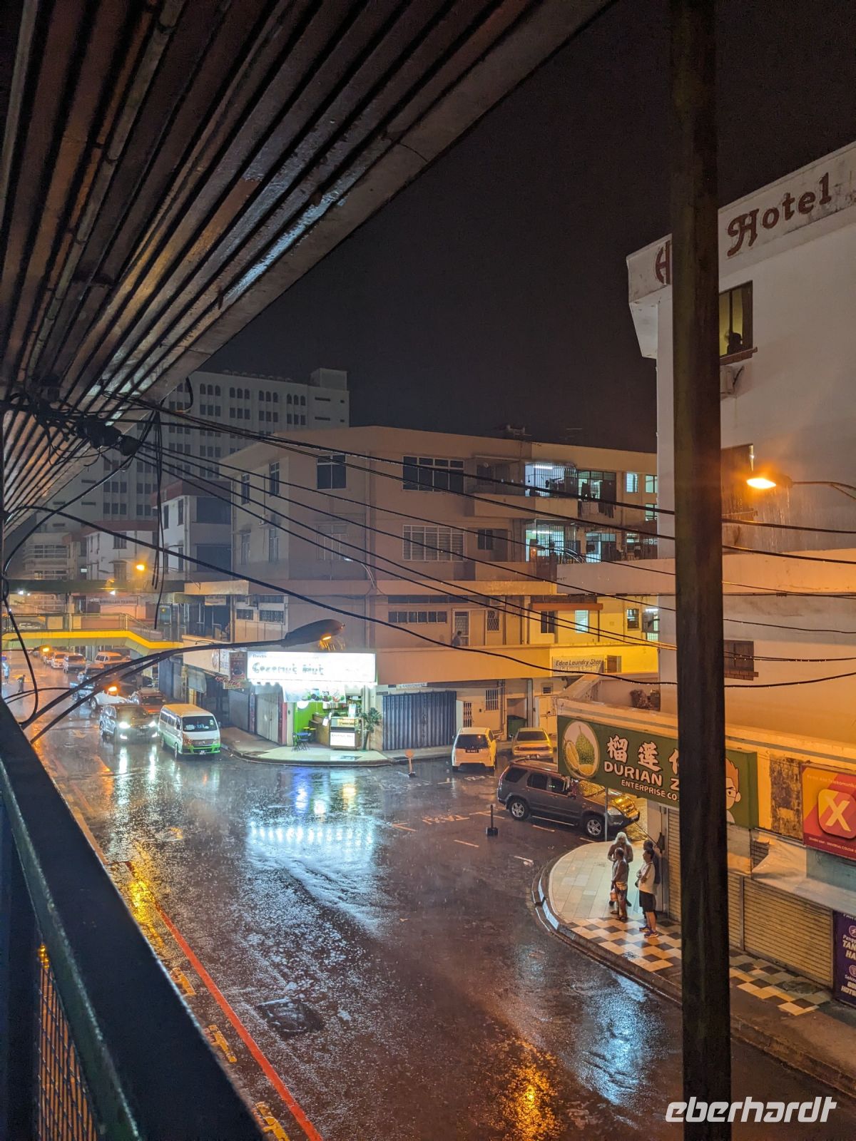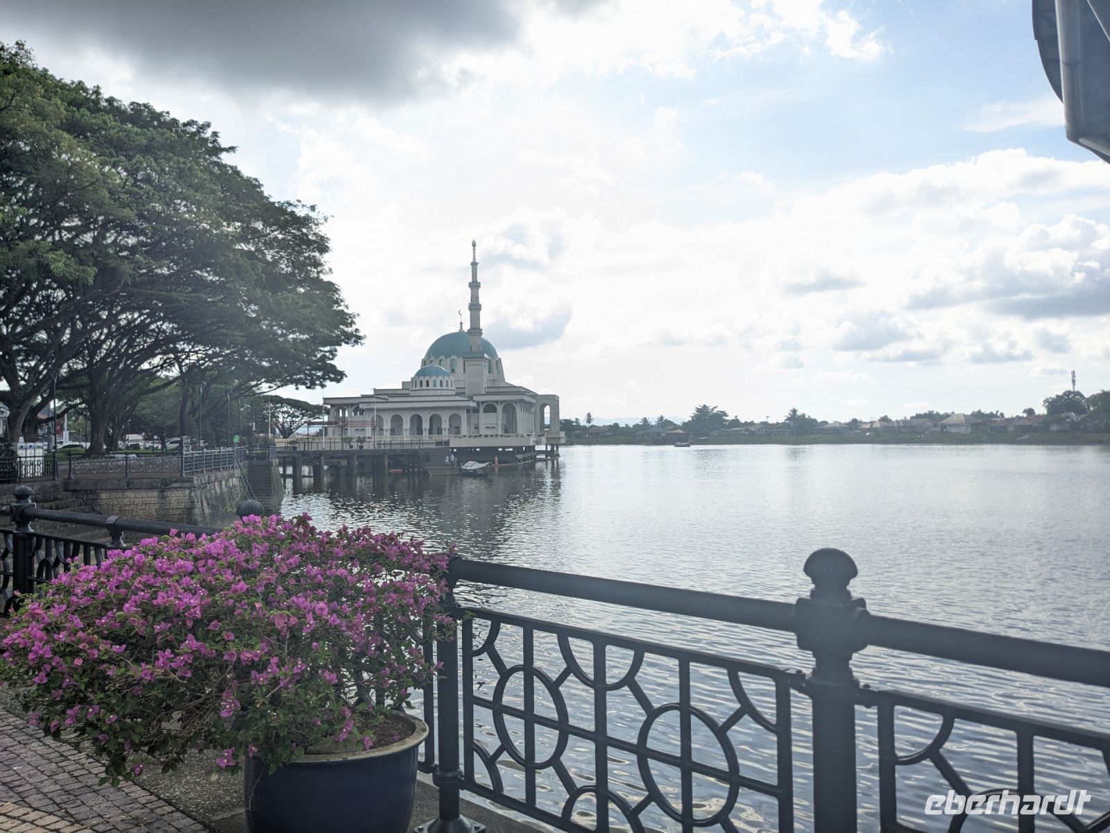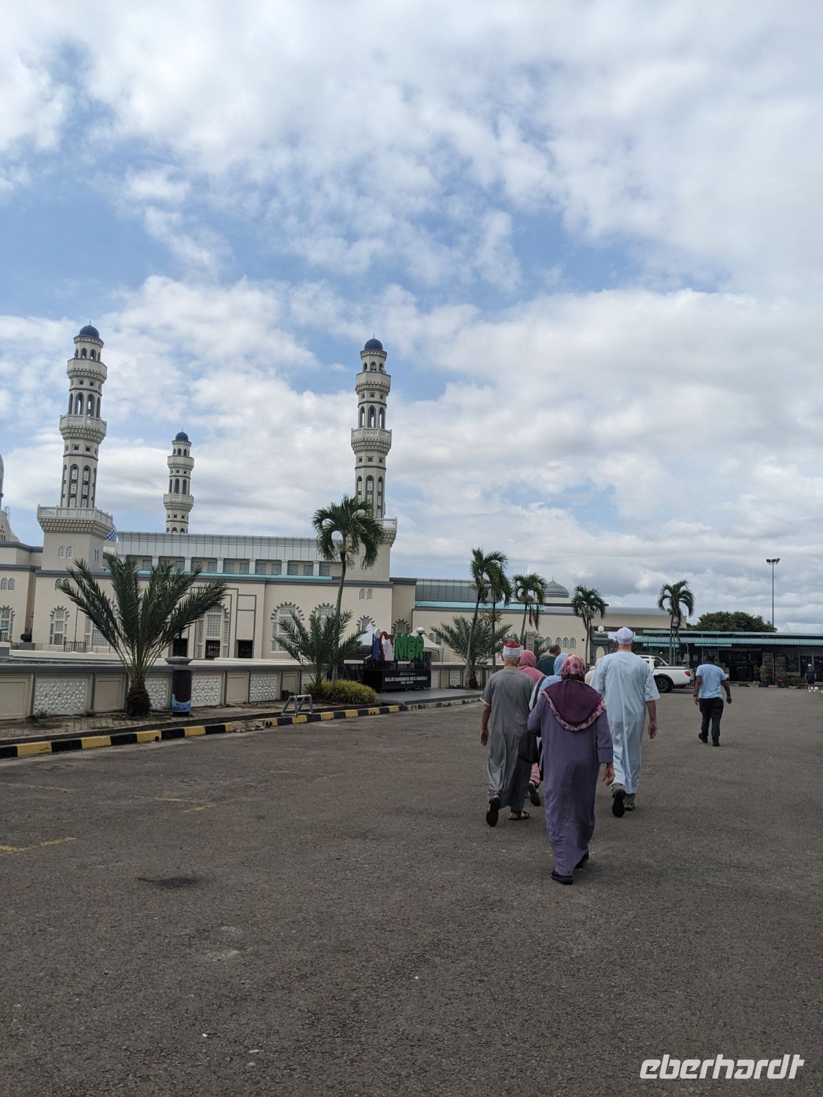 Zurück in Kuching gab es erstmal ein leckeres Mittagessen und dann hatten wir den Rest des Nachmittags Freizeit. Wir beschlossen diese zusammen als Gruppe zu verbringen und brachen zu einem Spaziergang auf. Zunächst ging es entlang der Promenade bis zur Schwimmenden Moschee und anschließend zur Stadtmoschee über die indische Marktstraße zurück. Hier setzte wieder heftiger Starkregen ein und wir waren gestrandet vor einer überdachten Ladenfront. Auch nach langer Wartezeit schien der Regen einfach nicht nachzulassen und so kaufte ich uns kurzerhand Schirme und dann hieß es einfach Augen zu und durch. Mehr nass als trocken kamen wir wieder am Hotel an, doch bis zum Abendessen hatten wir uns alle wieder hergerichtet und zusammen mit Tino und Selvam brachen wir zum Abendessen auf. Es ging auf einen hoch angelegten Foodcourt, bei dem bereits zwei Tische für uns vorbereitet wurden. Nach einem leckeren und vor allem reichhaltigen Essen kamen wir schließlich zurück ins Hotel.