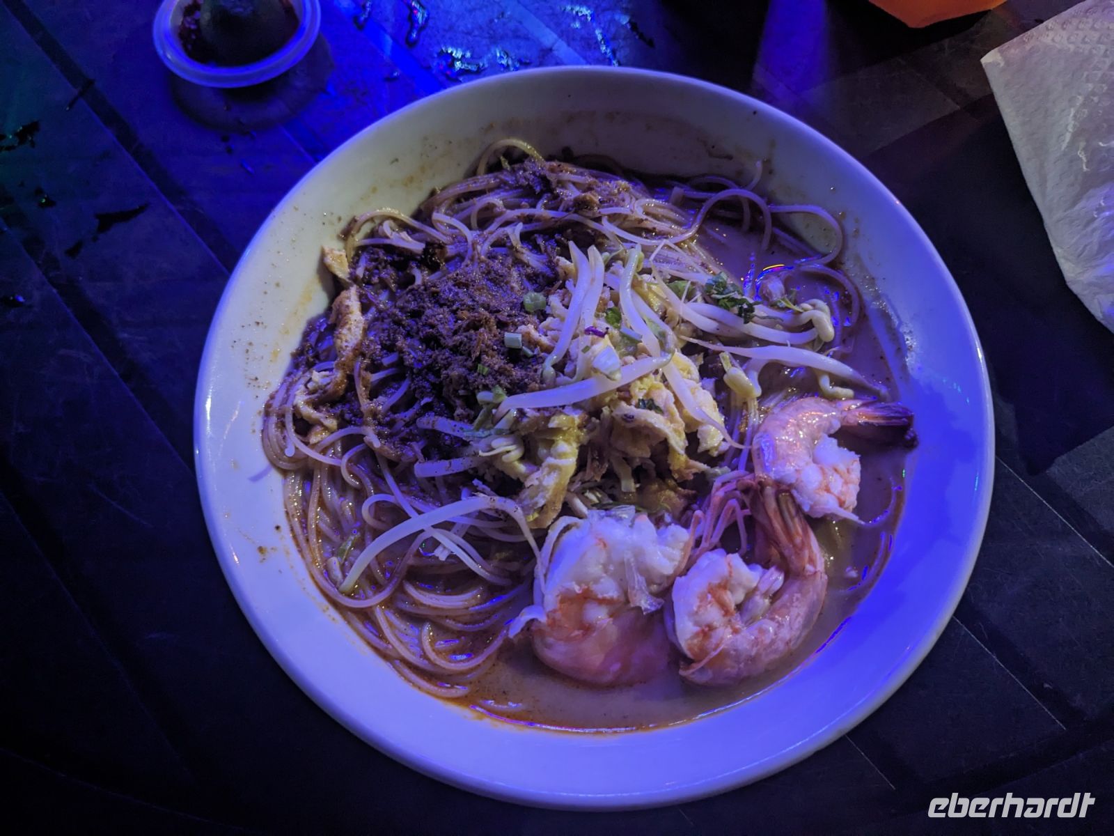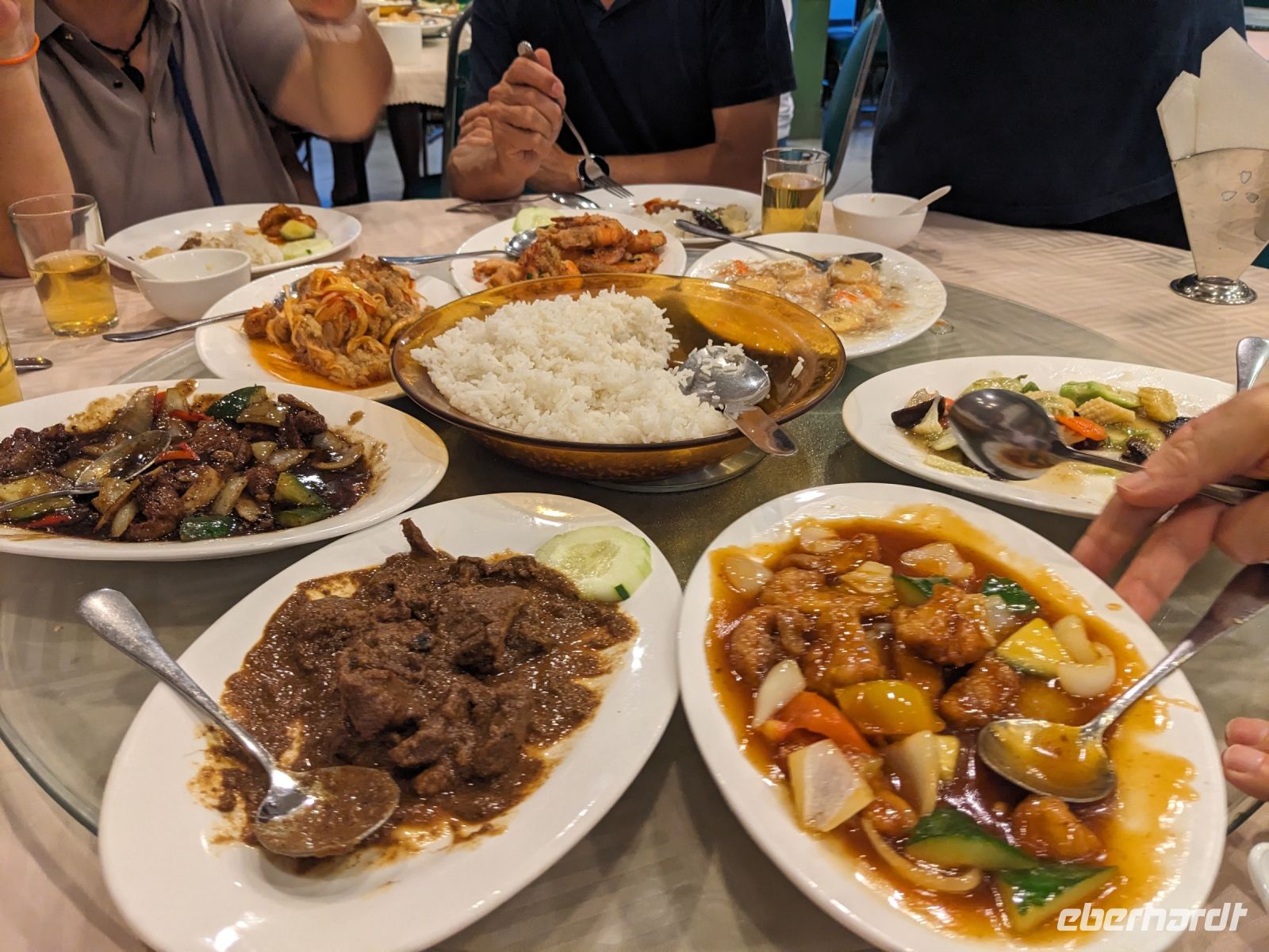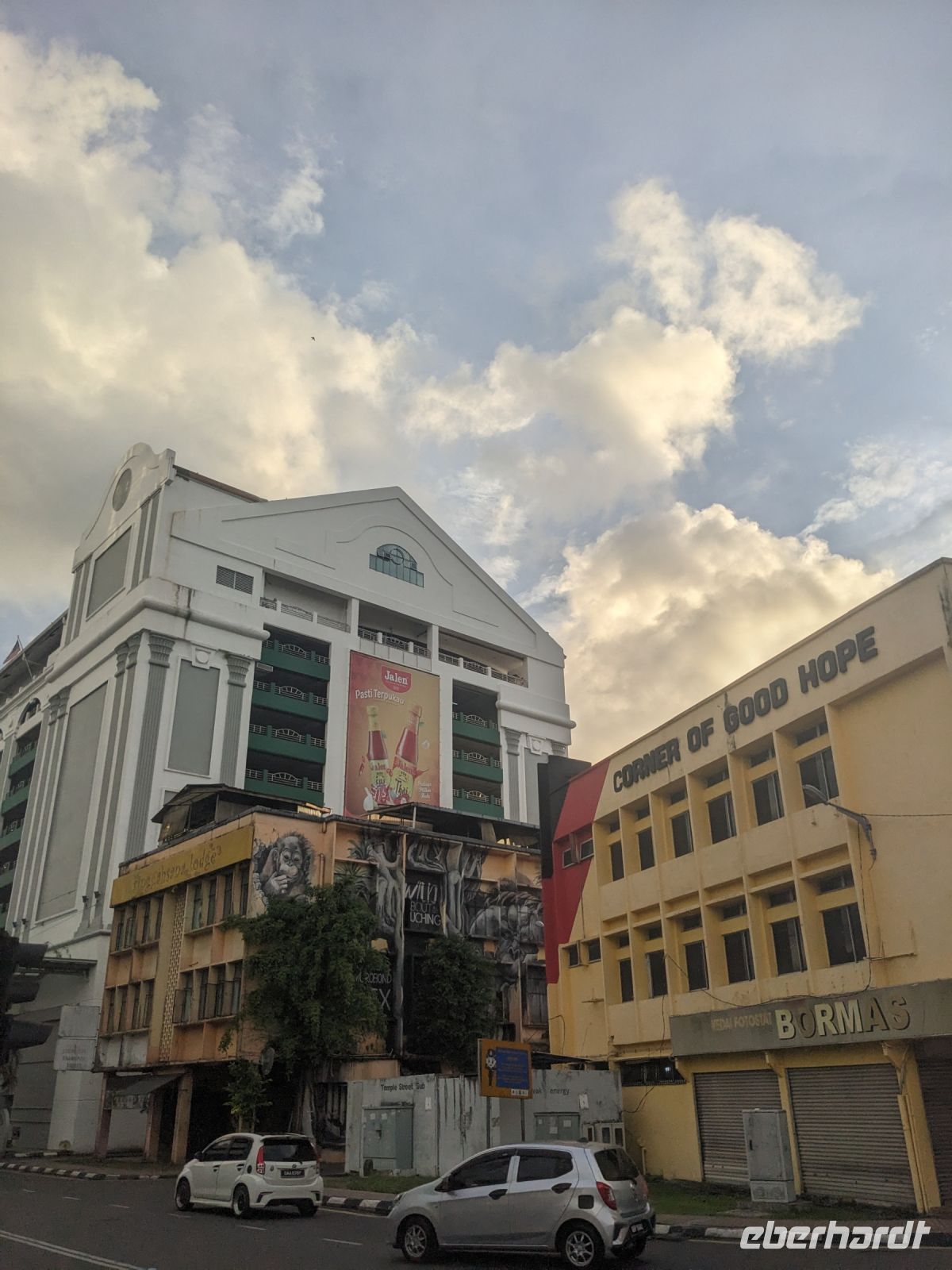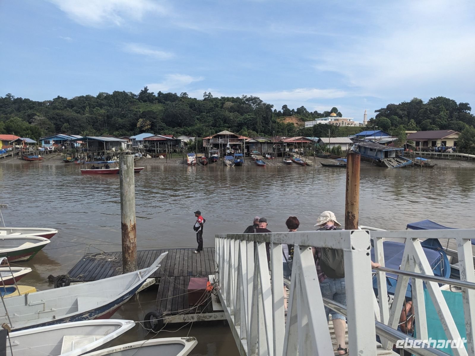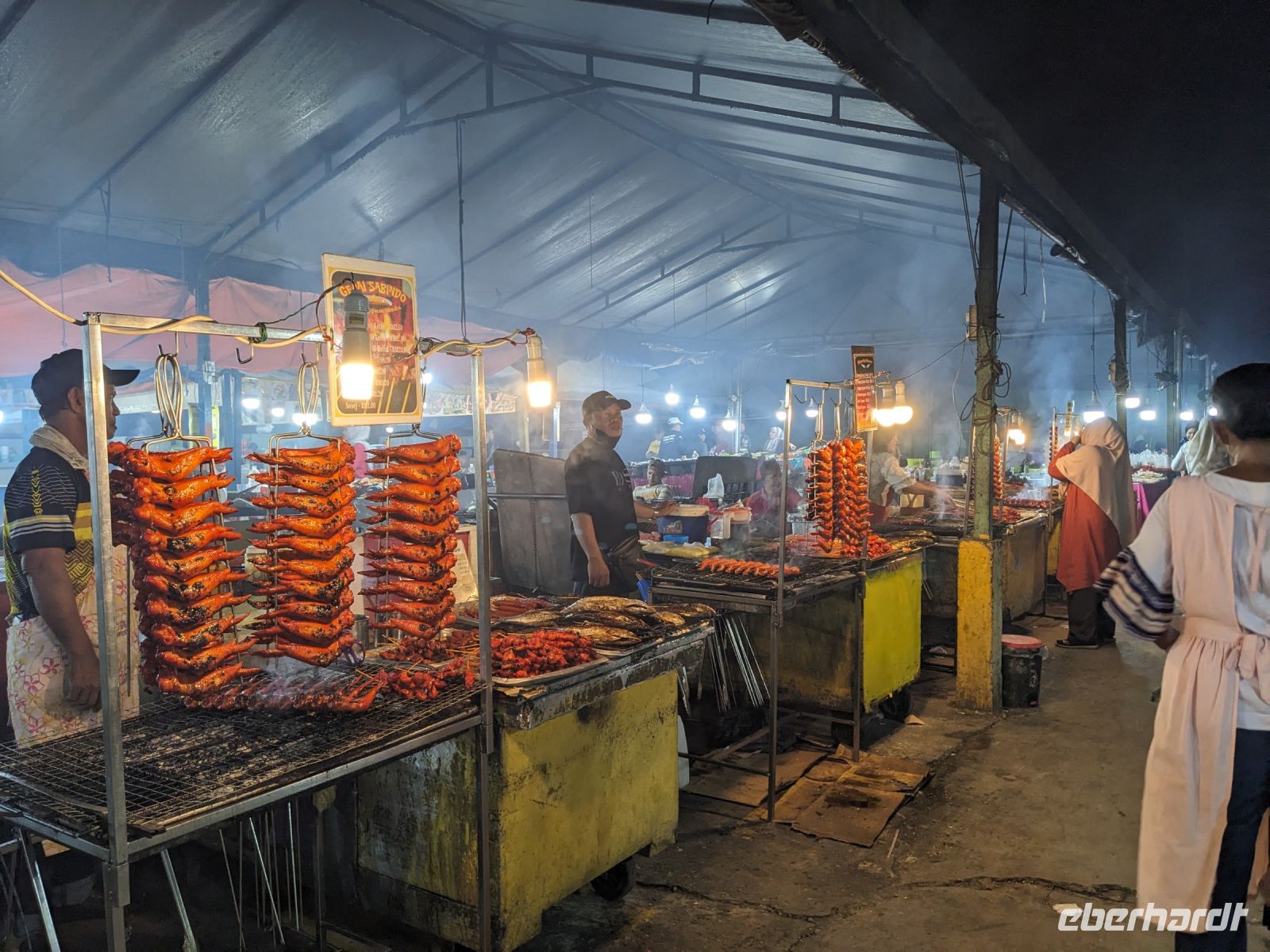 Zurück in Kuching gab es erstmal ein leckeres Mittagessen und dann hatten wir den Rest des Nachmittags Freizeit. Wir beschlossen diese zusammen als Gruppe zu verbringen und brachen zu einem Spaziergang auf. Zunächst ging es entlang der Promenade bis zur Schwimmenden Moschee und anschließend zur Stadtmoschee über die indische Marktstraße zurück. Hier setzte wieder heftiger Starkregen ein und wir waren gestrandet vor einer überdachten Ladenfront. Auch nach langer Wartezeit schien der Regen einfach nicht nachzulassen und so kaufte ich uns kurzerhand Schirme und dann hieß es einfach Augen zu und durch. Mehr nass als trocken kamen wir wieder am Hotel an, doch bis zum Abendessen hatten wir uns alle wieder hergerichtet und zusammen mit Tino und Selvam brachen wir zum Abendessen auf. Es ging auf einen hoch angelegten Foodcourt, bei dem bereits zwei Tische für uns vorbereitet wurden. Nach einem leckeren und vor allem reichhaltigen Essen kamen wir schließlich zurück ins Hotel.