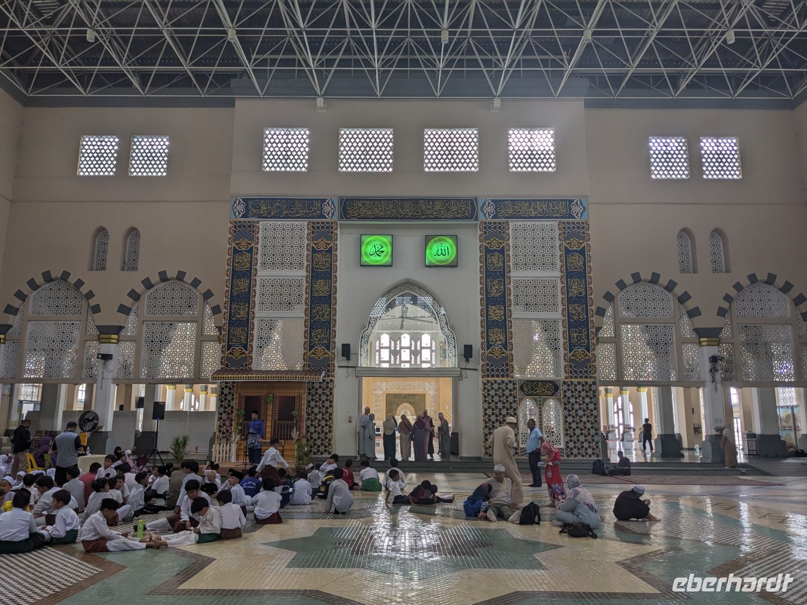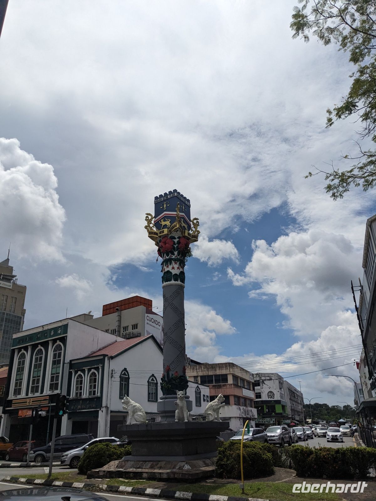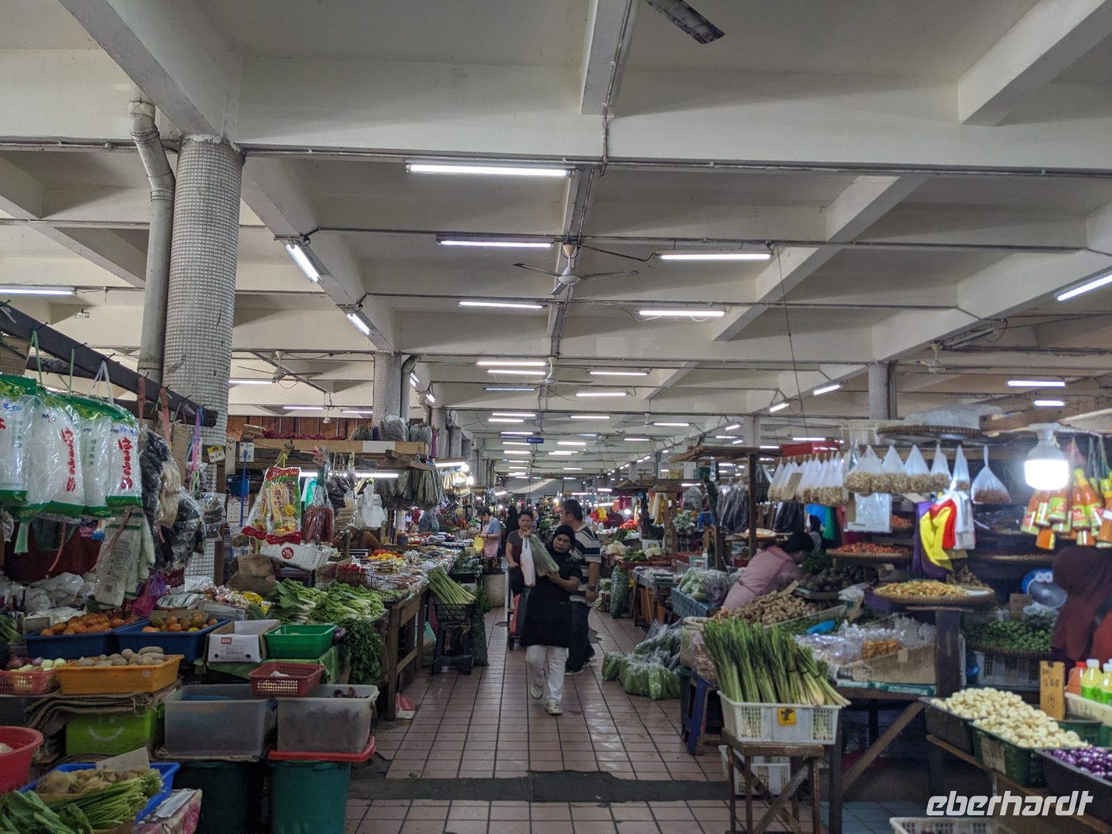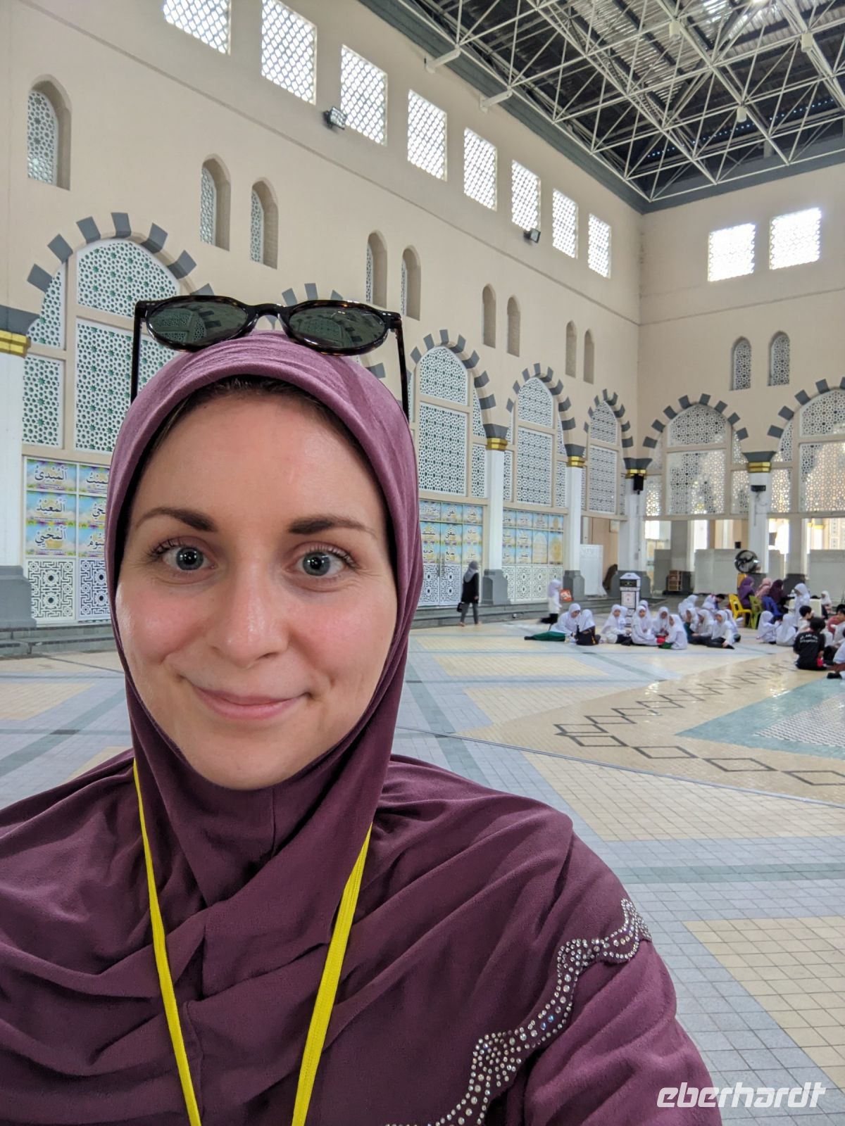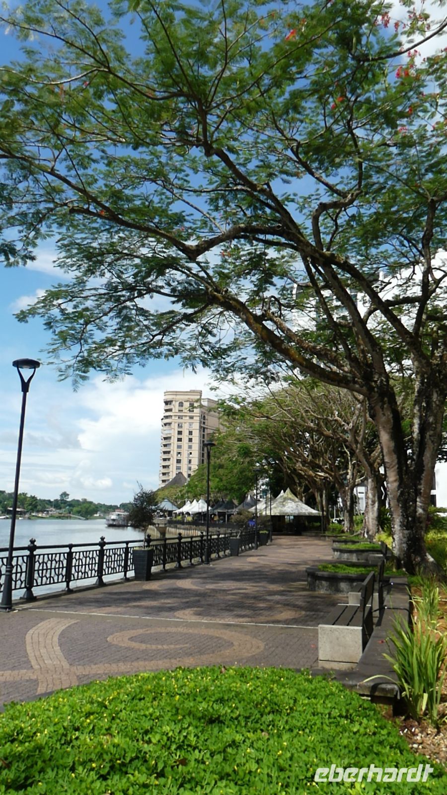Zurück in Kuching gab es erstmal ein leckeres Mittagessen und dann hatten wir den Rest des Nachmittags Freizeit. Wir beschlossen diese zusammen als Gruppe zu verbringen und brachen zu einem Spaziergang auf. Zunächst ging es entlang der Promenade bis zur Schwimmenden Moschee und anschließend zur Stadtmoschee über die indische Marktstraße zurück. Hier setzte wieder heftiger Starkregen ein und wir waren gestrandet vor einer überdachten Ladenfront. Auch nach langer Wartezeit schien der Regen einfach nicht nachzulassen und so kaufte ich uns kurzerhand Schirme und dann hieß es einfach Augen zu und durch. Mehr nass als trocken kamen wir wieder am Hotel an, doch bis zum Abendessen hatten wir uns alle wieder hergerichtet und zusammen mit Tino und Selvam brachen wir zum Abendessen auf. Es ging auf einen hoch angelegten Foodcourt, bei dem bereits zwei Tische für uns vorbereitet wurden. Nach einem leckeren und vor allem reichhaltigen Essen kamen wir schließlich zurück ins Hotel.