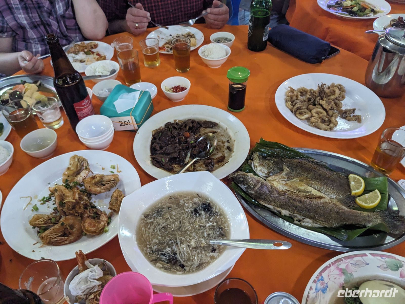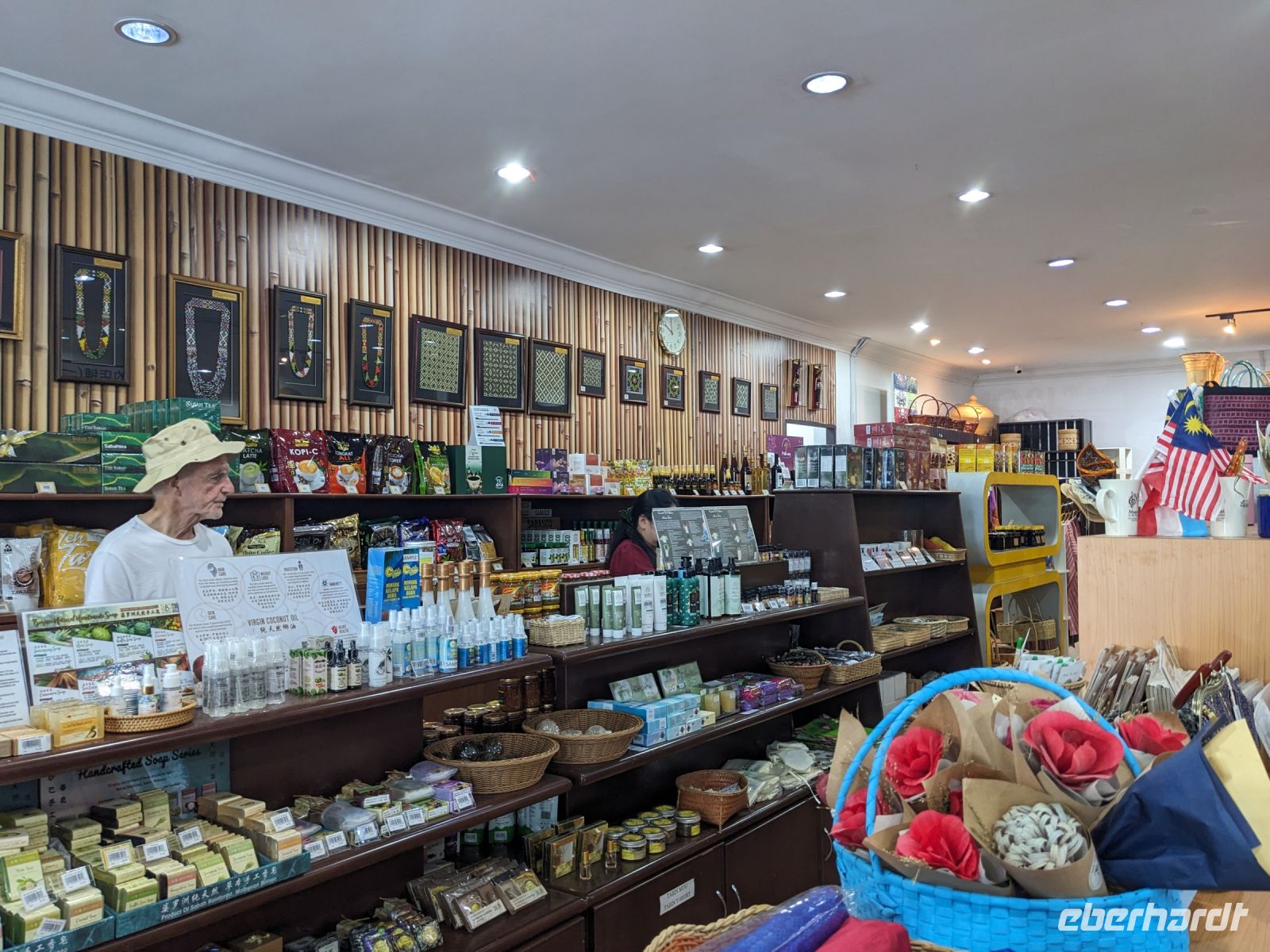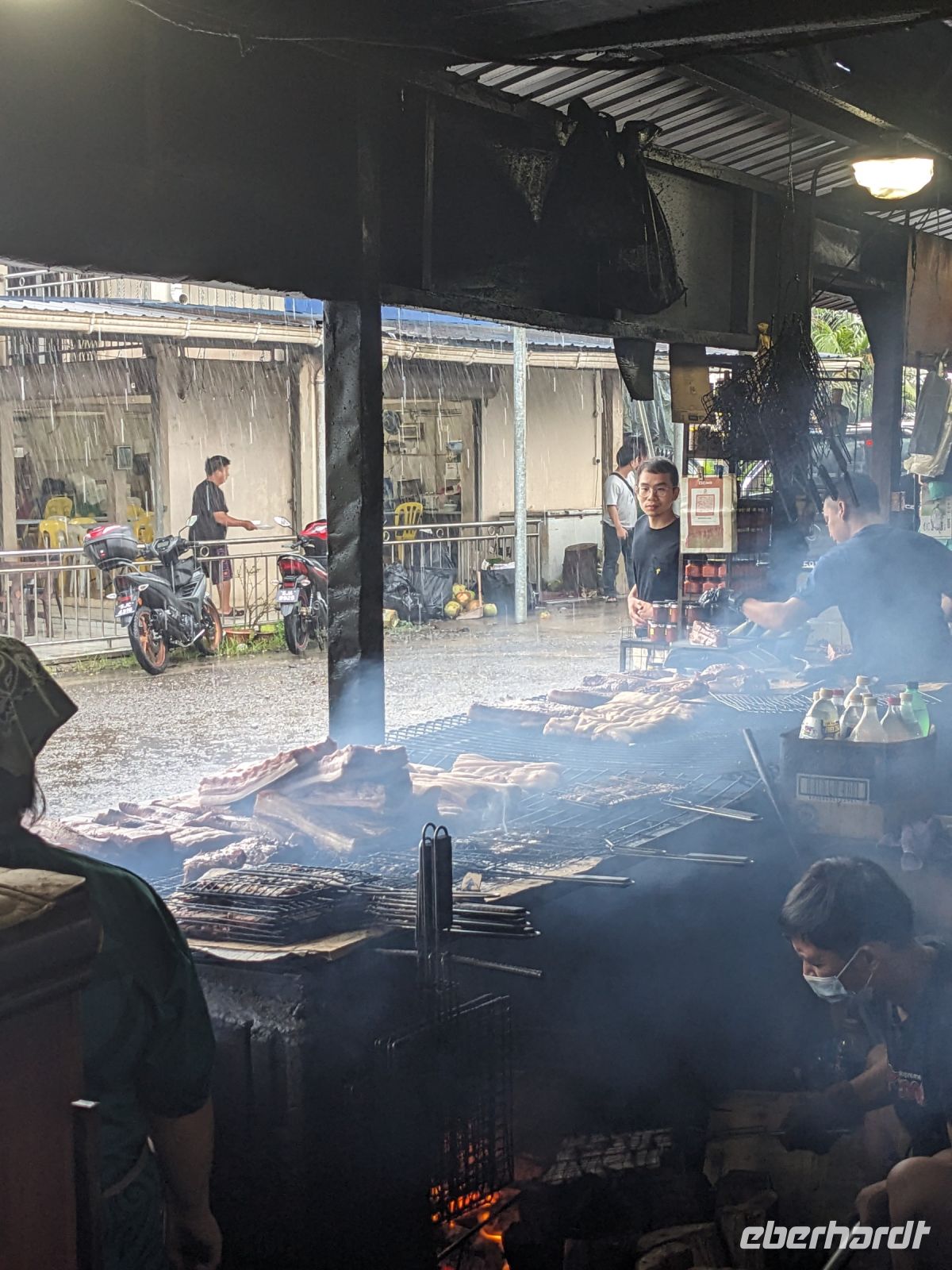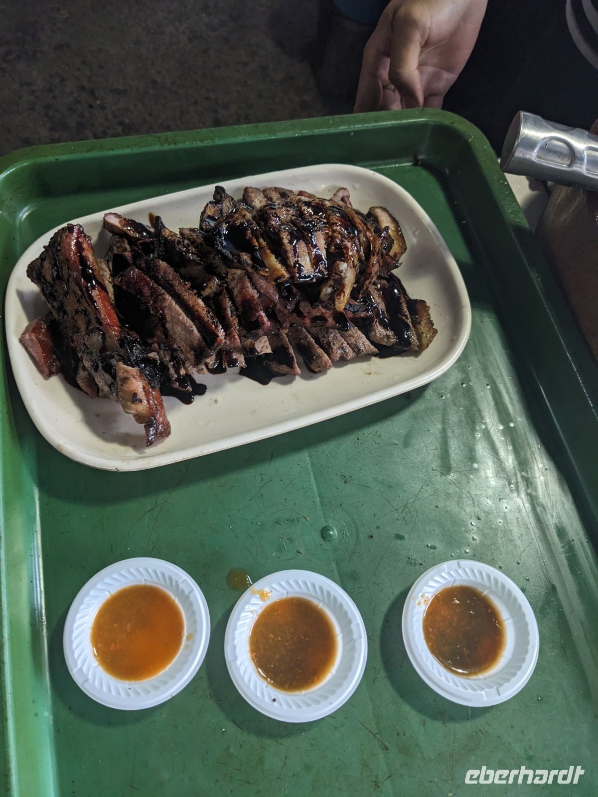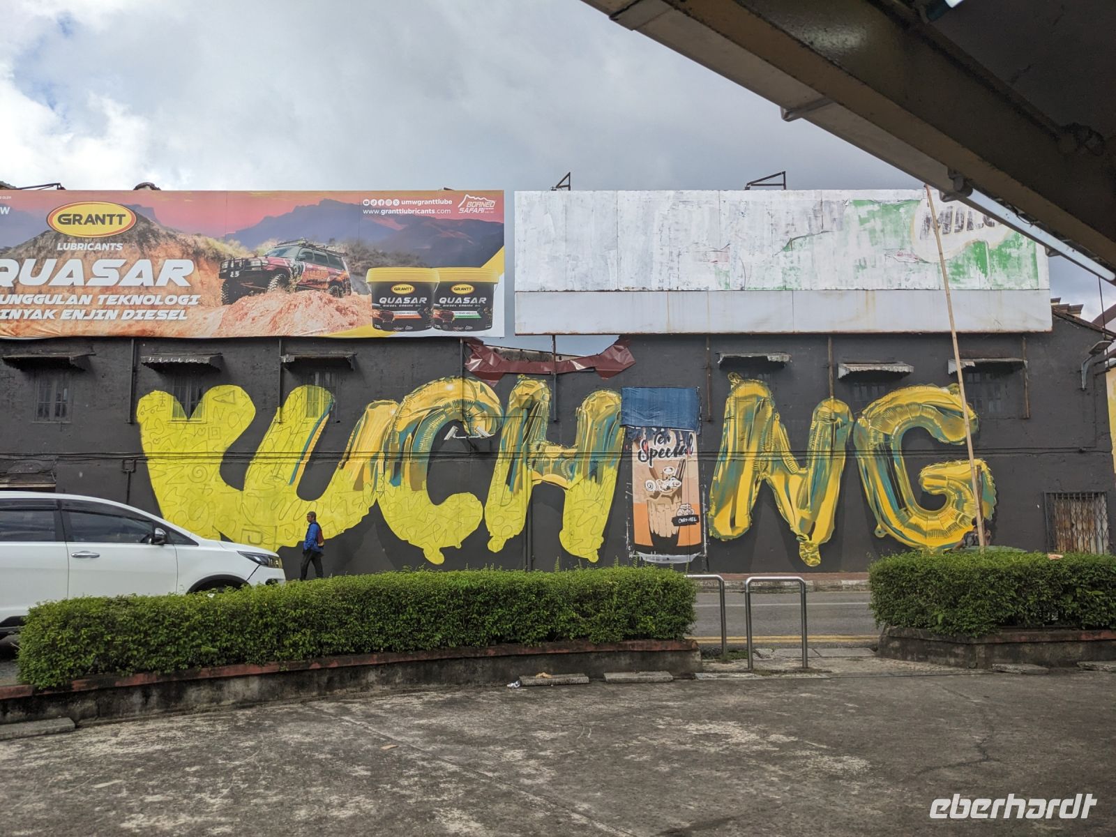 Zurück in Kuching gab es erstmal ein leckeres Mittagessen und dann hatten wir den Rest des Nachmittags Freizeit. Wir beschlossen diese zusammen als Gruppe zu verbringen und brachen zu einem Spaziergang auf. Zunächst ging es entlang der Promenade bis zur Schwimmenden Moschee und anschließend zur Stadtmoschee über die indische Marktstraße zurück. Hier setzte wieder heftiger Starkregen ein und wir waren gestrandet vor einer überdachten Ladenfront. Auch nach langer Wartezeit schien der Regen einfach nicht nachzulassen und so kaufte ich uns kurzerhand Schirme und dann hieß es einfach Augen zu und durch. Mehr nass als trocken kamen wir wieder am Hotel an, doch bis zum Abendessen hatten wir uns alle wieder hergerichtet und zusammen mit Tino und Selvam brachen wir zum Abendessen auf. Es ging auf einen hoch angelegten Foodcourt, bei dem bereits zwei Tische für uns vorbereitet wurden. Nach einem leckeren und vor allem reichhaltigen Essen kamen wir schließlich zurück ins Hotel.