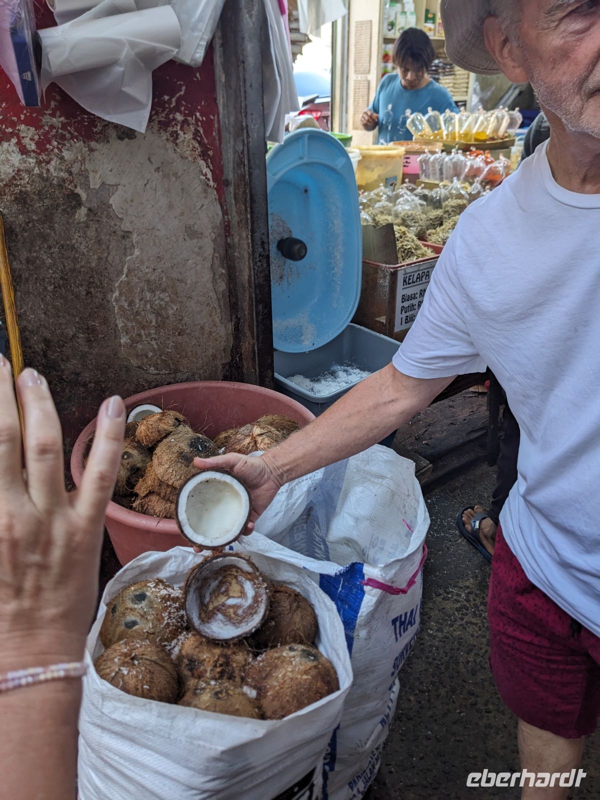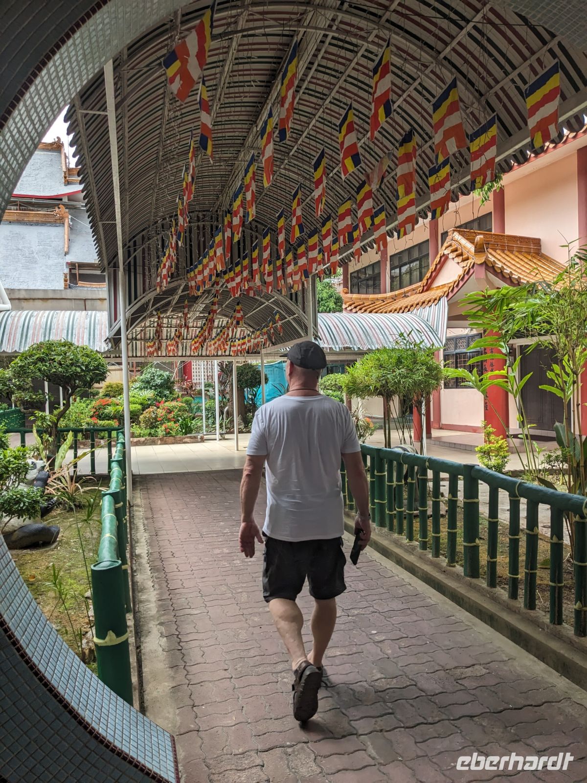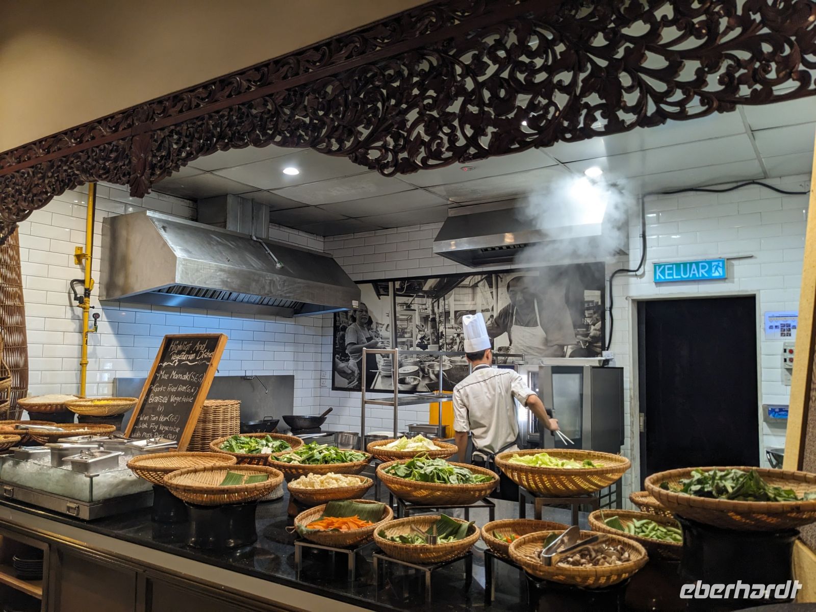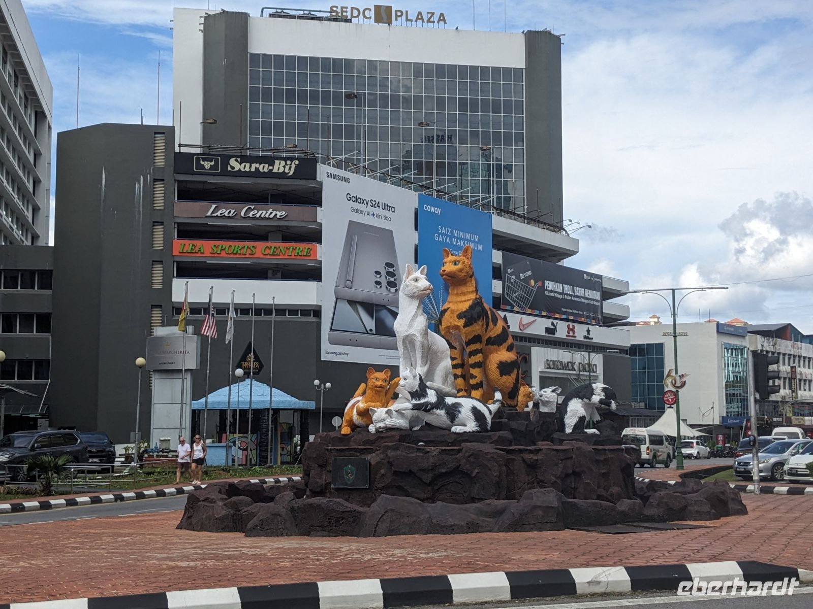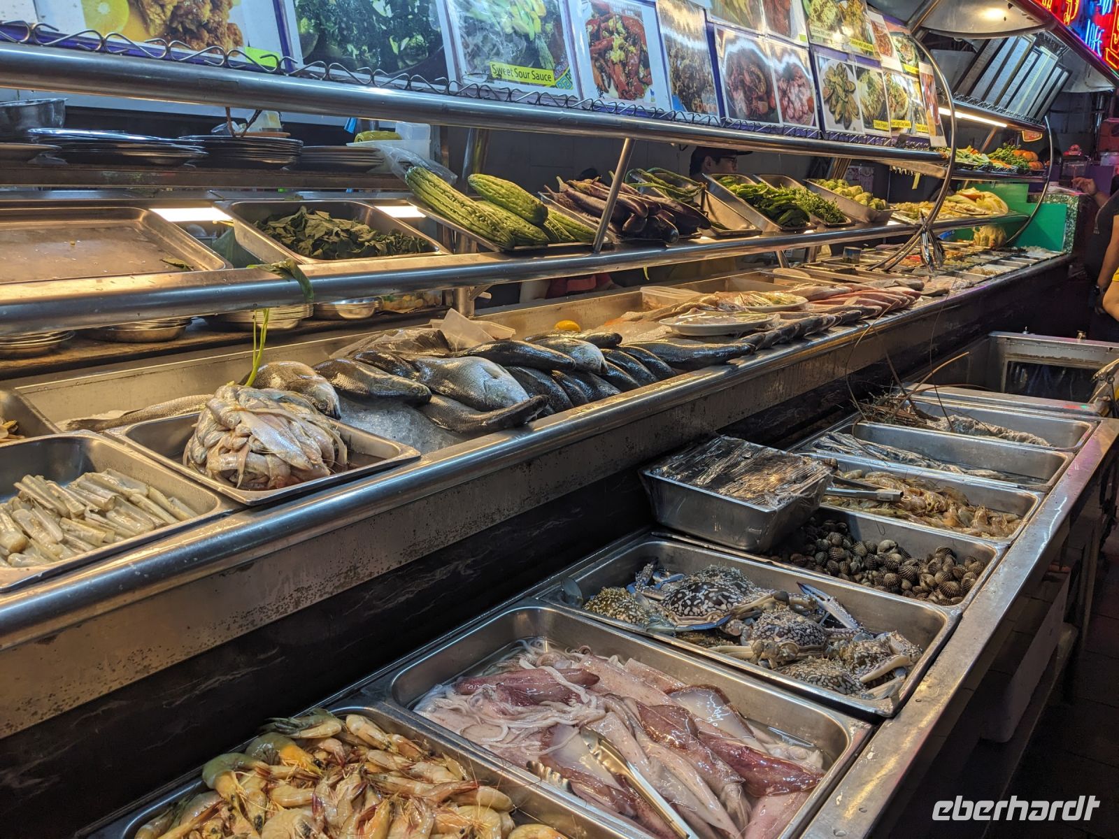 Zurück in Kuching gab es erstmal ein leckeres Mittagessen und dann hatten wir den Rest des Nachmittags Freizeit. Wir beschlossen diese zusammen als Gruppe zu verbringen und brachen zu einem Spaziergang auf. Zunächst ging es entlang der Promenade bis zur Schwimmenden Moschee und anschließend zur Stadtmoschee über die indische Marktstraße zurück. Hier setzte wieder heftiger Starkregen ein und wir waren gestrandet vor einer überdachten Ladenfront. Auch nach langer Wartezeit schien der Regen einfach nicht nachzulassen und so kaufte ich uns kurzerhand Schirme und dann hieß es einfach Augen zu und durch. Mehr nass als trocken kamen wir wieder am Hotel an, doch bis zum Abendessen hatten wir uns alle wieder hergerichtet und zusammen mit Tino und Selvam brachen wir zum Abendessen auf. Es ging auf einen hoch angelegten Foodcourt, bei dem bereits zwei Tische für uns vorbereitet wurden. Nach einem leckeren und vor allem reichhaltigen Essen kamen wir schließlich zurück ins Hotel.