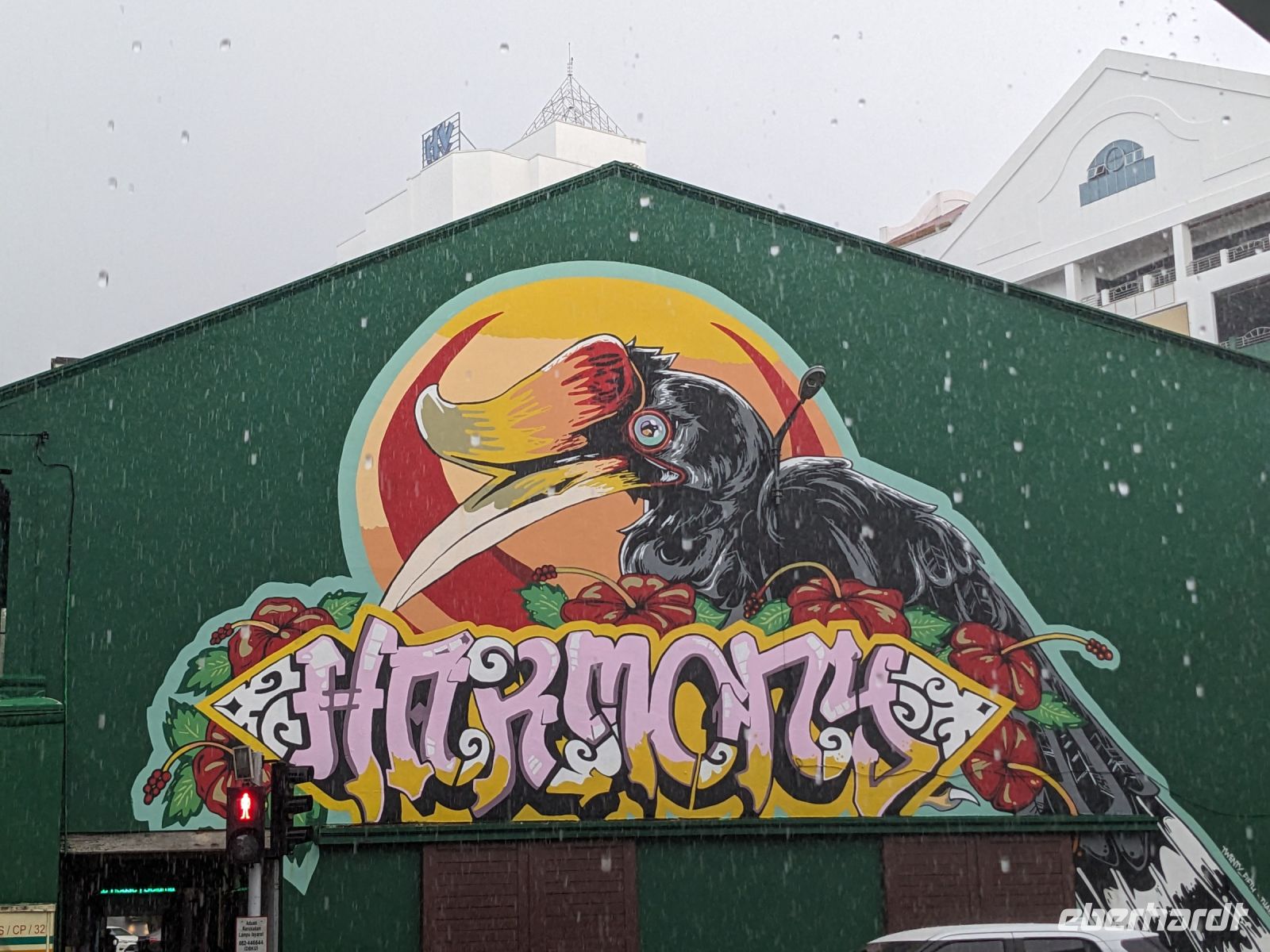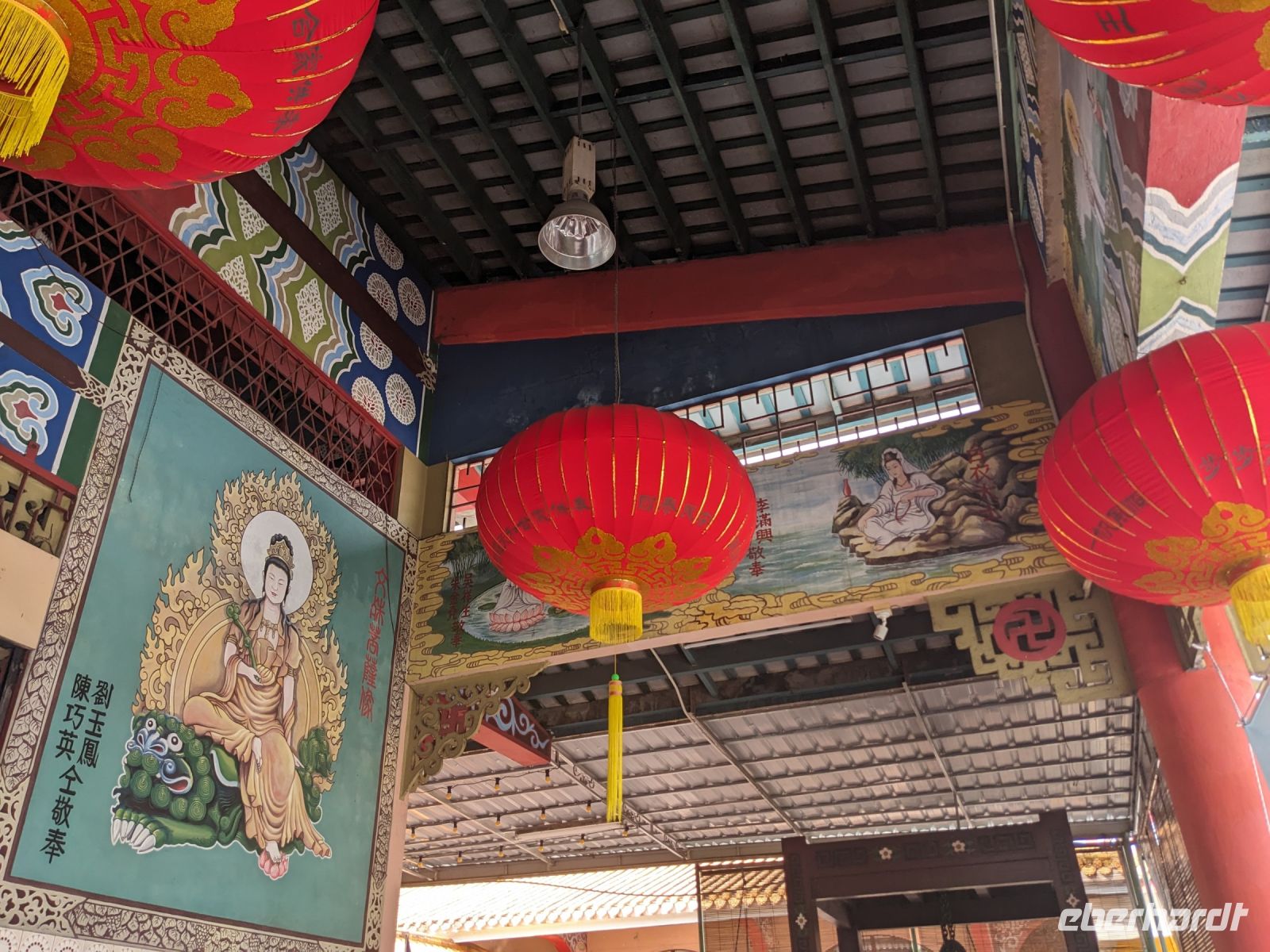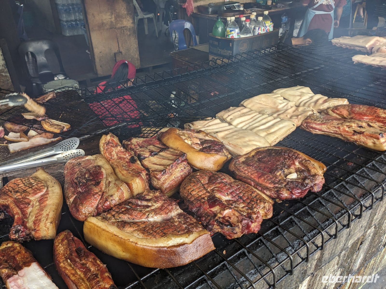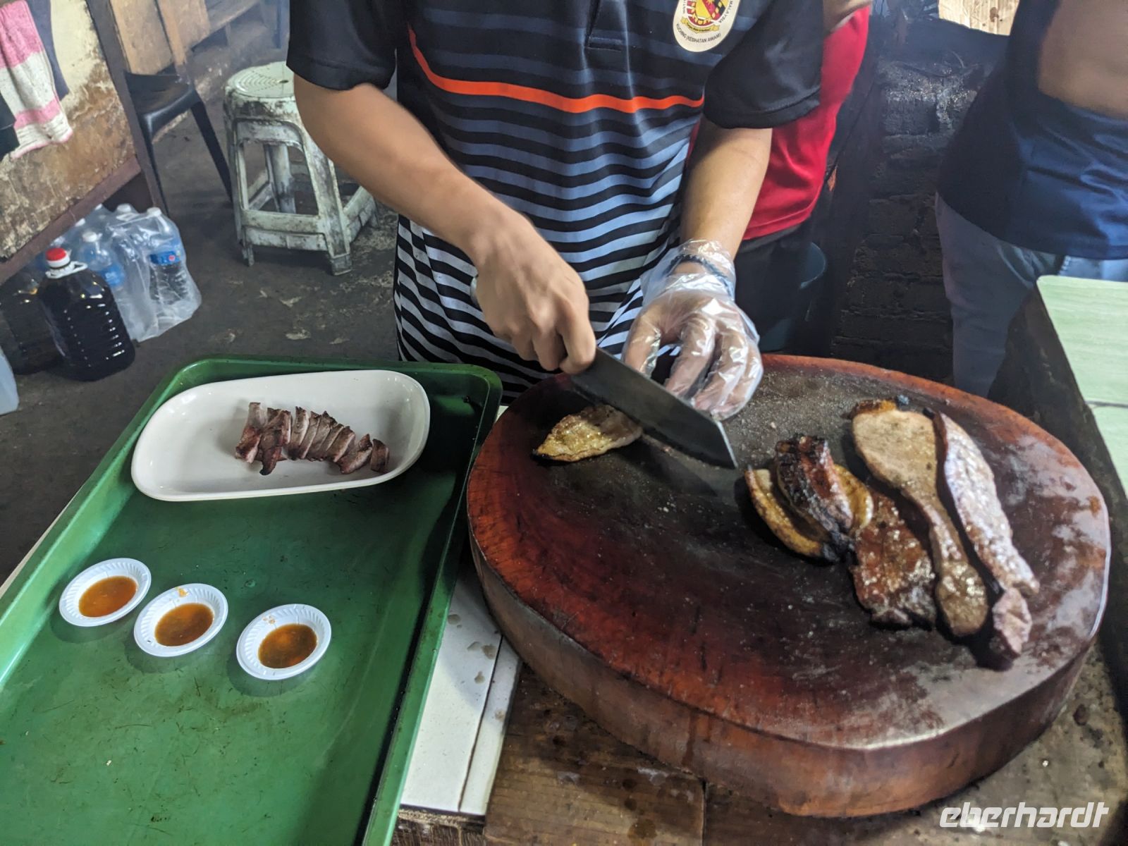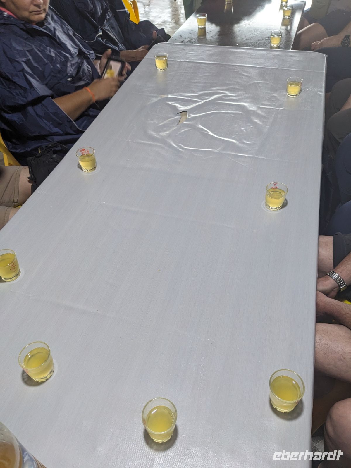 Zurück in Kuching gab es erstmal ein leckeres Mittagessen und dann hatten wir den Rest des Nachmittags Freizeit. Wir beschlossen diese zusammen als Gruppe zu verbringen und brachen zu einem Spaziergang auf. Zunächst ging es entlang der Promenade bis zur Schwimmenden Moschee und anschließend zur Stadtmoschee über die indische Marktstraße zurück. Hier setzte wieder heftiger Starkregen ein und wir waren gestrandet vor einer überdachten Ladenfront. Auch nach langer Wartezeit schien der Regen einfach nicht nachzulassen und so kaufte ich uns kurzerhand Schirme und dann hieß es einfach Augen zu und durch. Mehr nass als trocken kamen wir wieder am Hotel an, doch bis zum Abendessen hatten wir uns alle wieder hergerichtet und zusammen mit Tino und Selvam brachen wir zum Abendessen auf. Es ging auf einen hoch angelegten Foodcourt, bei dem bereits zwei Tische für uns vorbereitet wurden. Nach einem leckeren und vor allem reichhaltigen Essen kamen wir schließlich zurück ins Hotel.