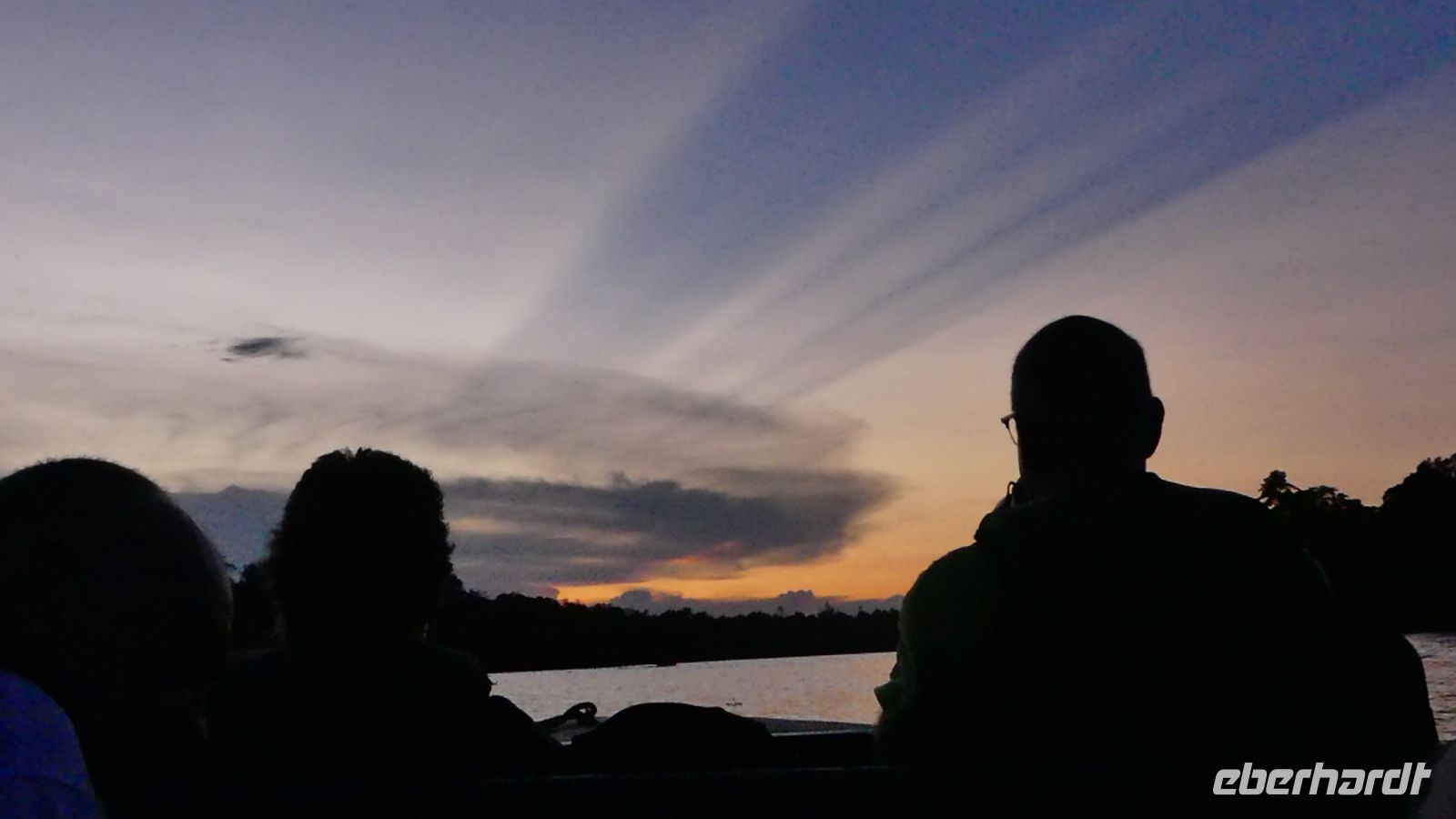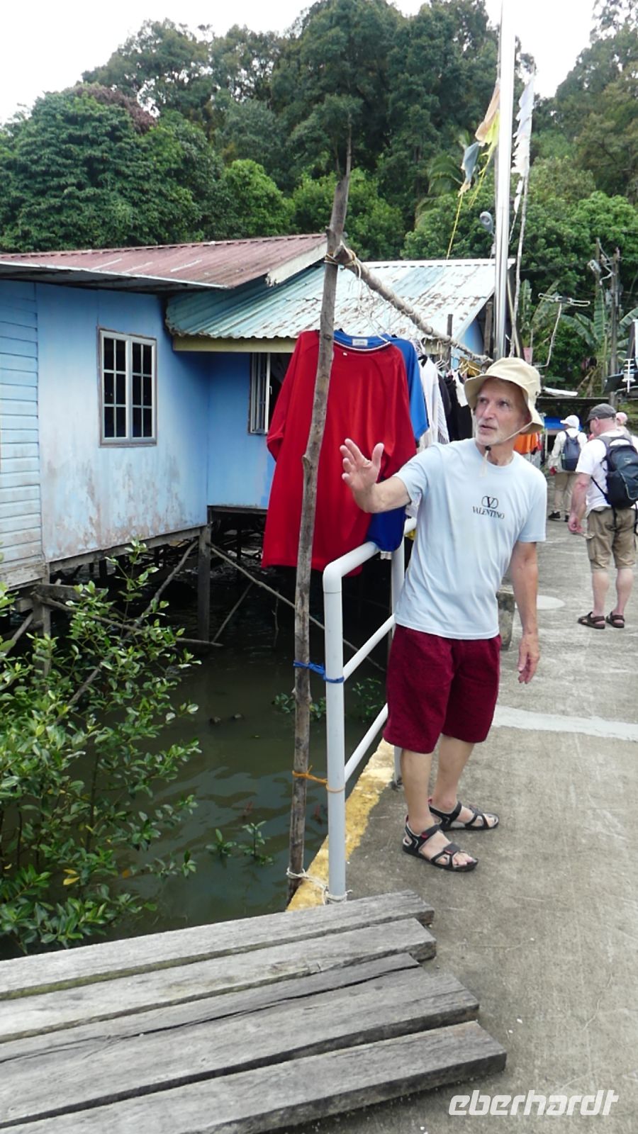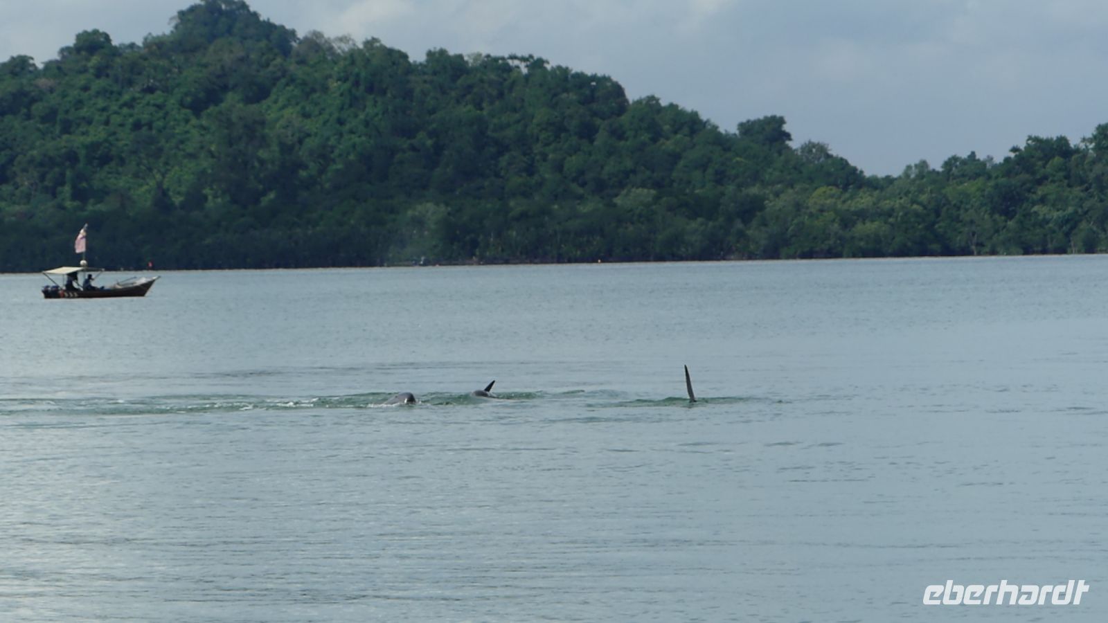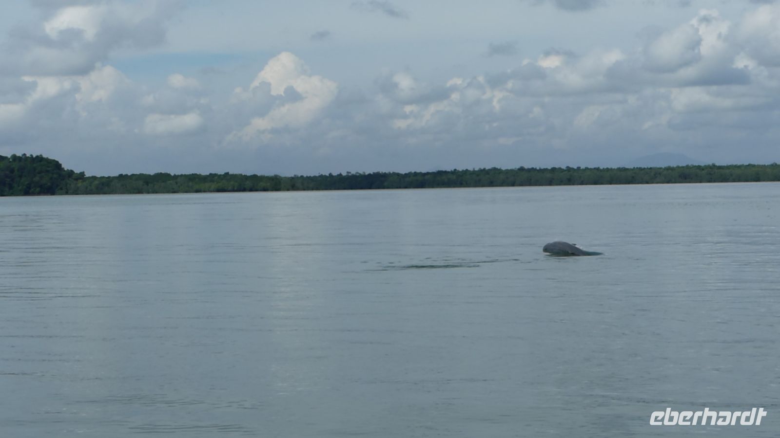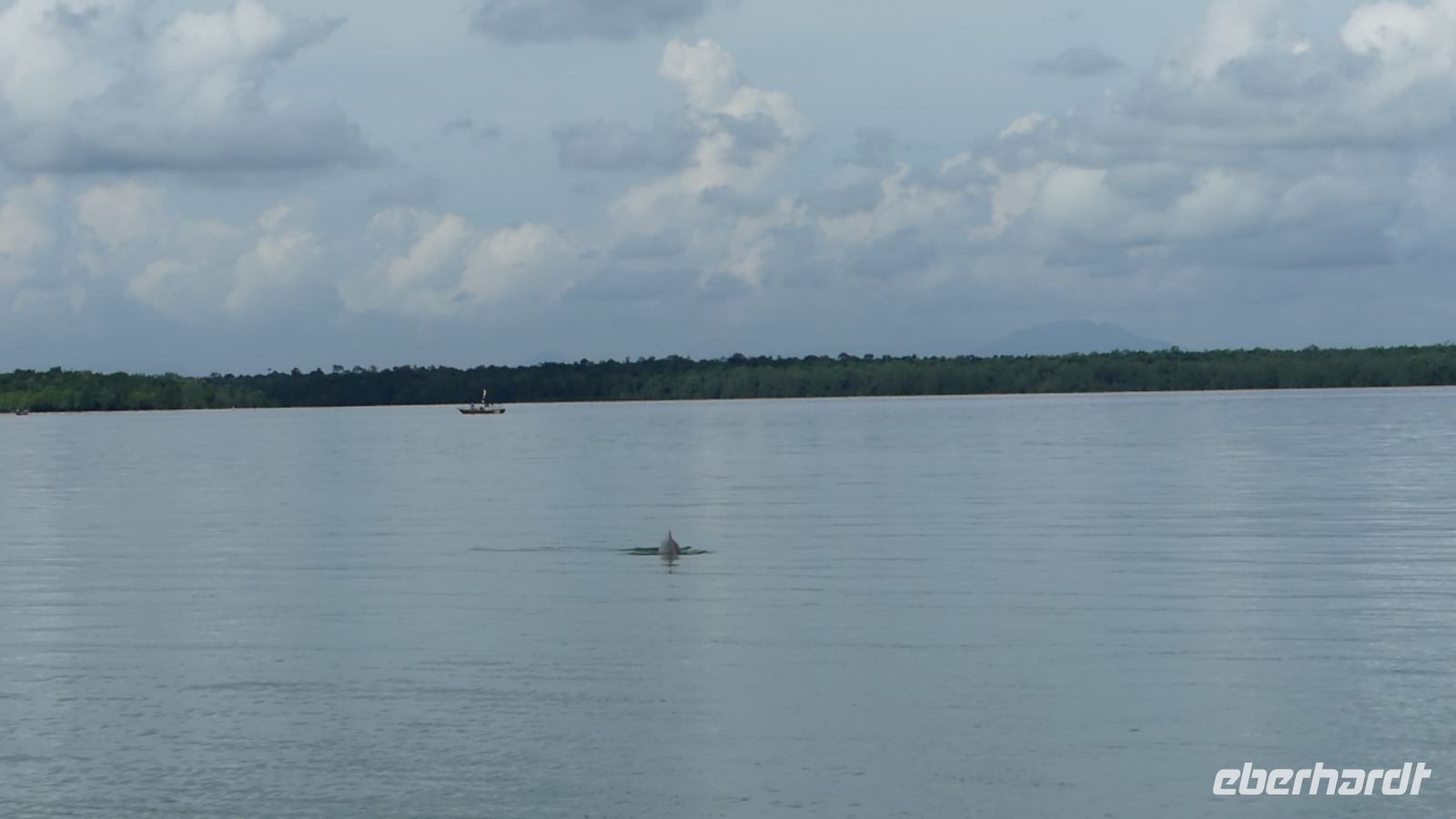 An unserem ersten vollen Reisetag erwartete uns eine Bootsfahrt auf den Spuren der Irrawaddy-Delfine. Zunächst erlebten wir jedoch den noch leicht verhangenen Mangrovenwald sowie den Mount Santubong. Umgeben von Nebelschwaden ergab sich eine beinahe mystische Atmosphäre. Doch auch die ersten Delfine waren schnell gesichtet und zahlreiche weitere kamen hinzu. Sie zeigten sich uns von ihrer besten Seite und trauten sich sogar einmal sehr nah ans Boot heran. Hunderte Bilder später brachte uns das Boot in das Dorf Salak. Hier unternahmen wir einen Spaziergang, bei dem wir das Leben im Dorf aus nächster Nähe erspüren konnten. Schüchterne Kinder lächelten uns an, die Lebensgrundlage der Fischerei war überaus präsent, frisch gewaschene Wäsche zierte die Hauswände, stachellose Bienen bestäubten die zahlreichen Pflanzen – eine einerseits friedliche Idylle, doch andererseits auch erdend. Denn im Vergleich zu unserem Wohnstandard in Deutschland bzw. auch dem örtlichen Hotel, war hier die Armut der Menschen deutlich spürbar. Auf dem Rückweg zum Bus erspähten wir noch ein Krokodil, welches aber auch nach dem zunehmenden Regen untertauchte. Während wir dem Ganzen anfangs noch entspannt auf unserem überdachten Boot entgegenblickten, rückten wir jedoch nach kurzer Zeit eng zusammen in die Mitte, um uns vor diesem tropischen Regenguss zu schützen. Genauso schnell wie er kam, war er auch wieder vorbei.