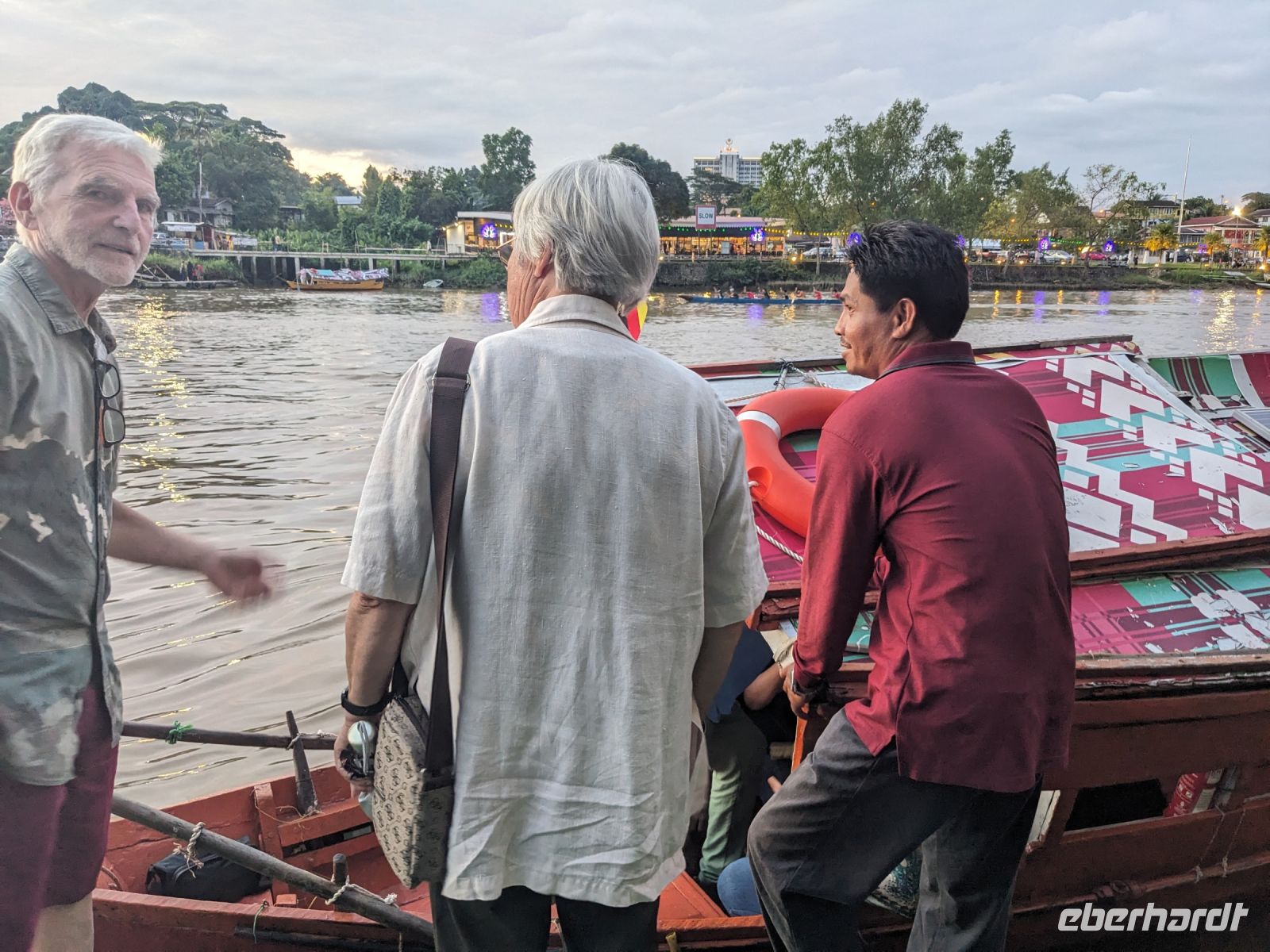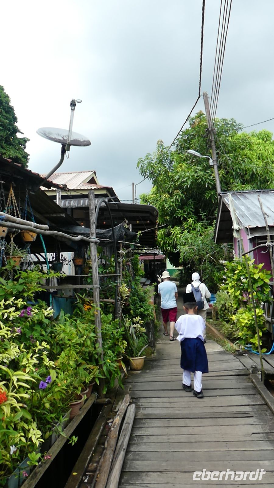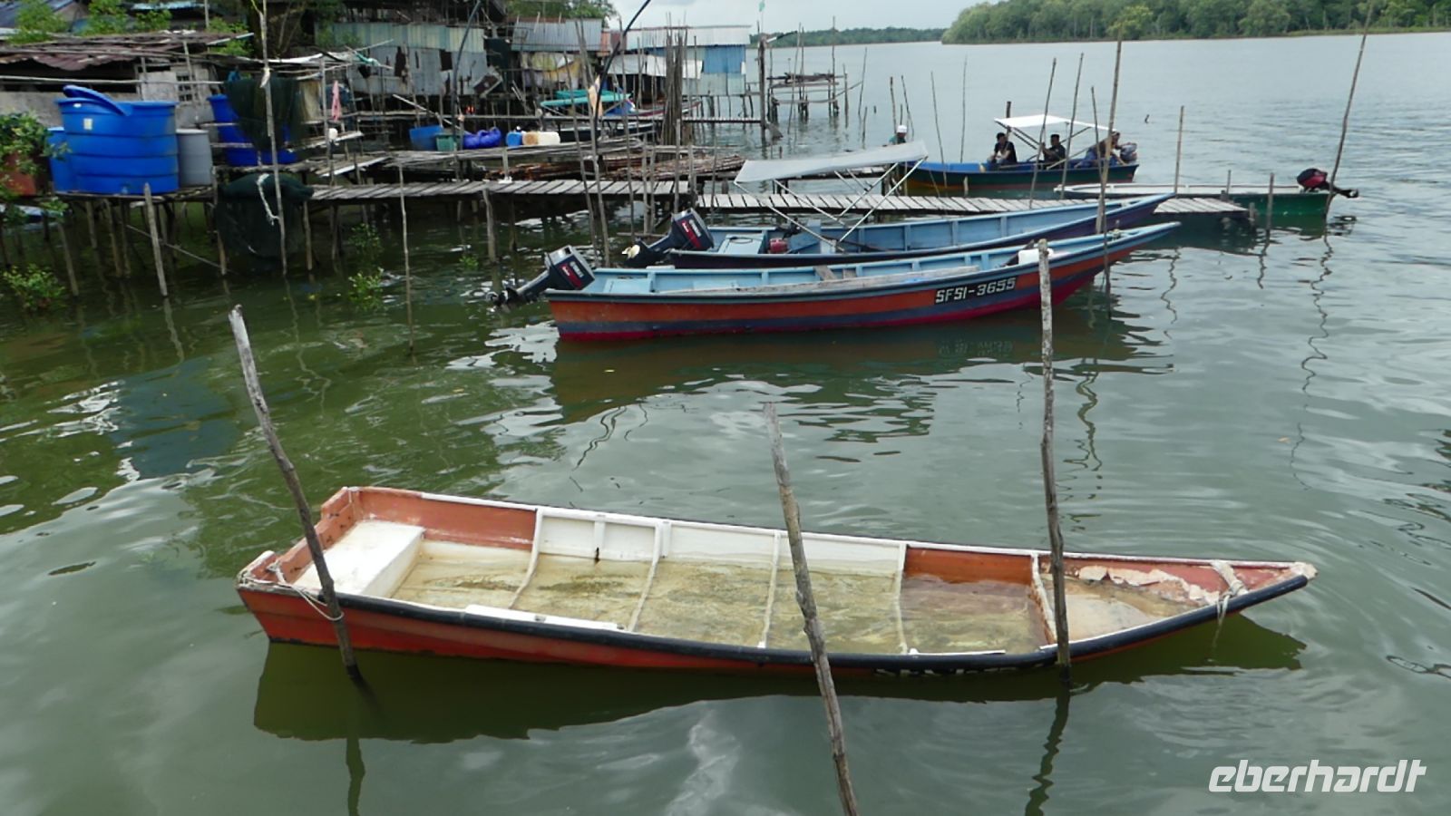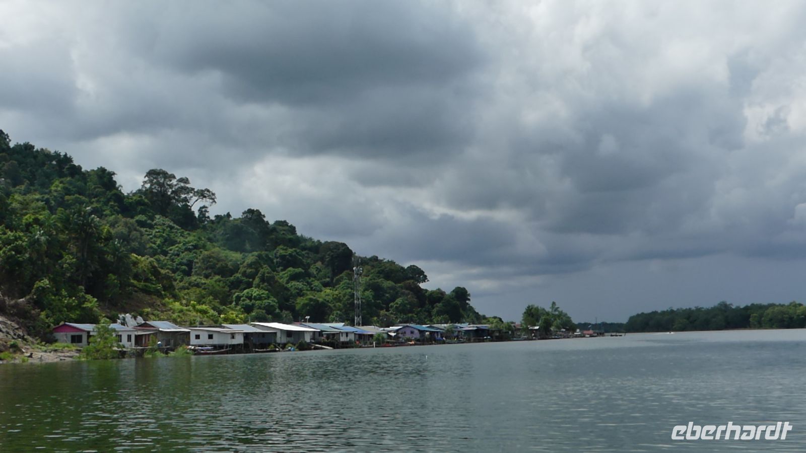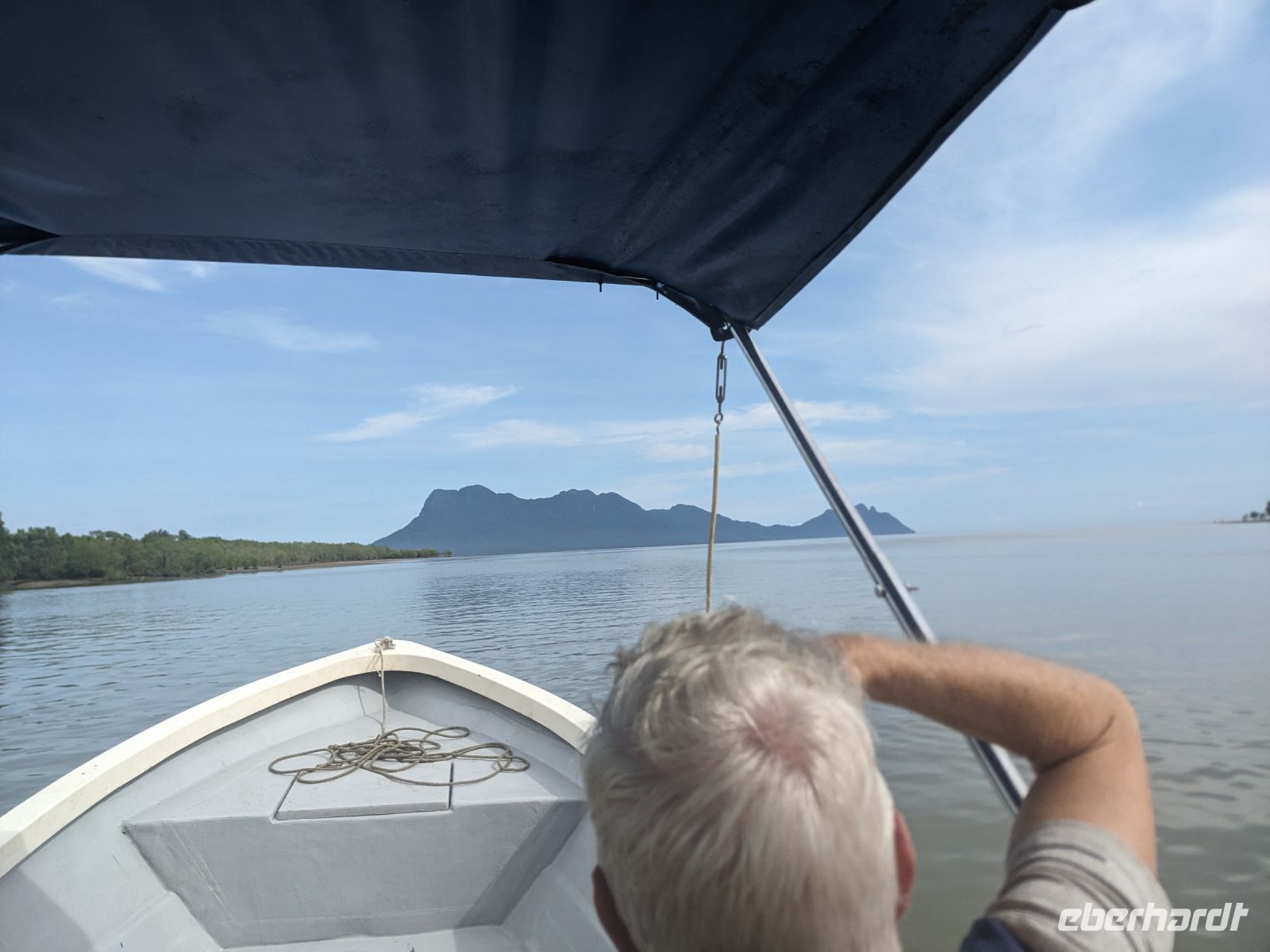 An unserem ersten vollen Reisetag erwartete uns eine Bootsfahrt auf den Spuren der Irrawaddy-Delfine. Zunächst erlebten wir jedoch den noch leicht verhangenen Mangrovenwald sowie den Mount Santubong. Umgeben von Nebelschwaden ergab sich eine beinahe mystische Atmosphäre. Doch auch die ersten Delfine waren schnell gesichtet und zahlreiche weitere kamen hinzu. Sie zeigten sich uns von ihrer besten Seite und trauten sich sogar einmal sehr nah ans Boot heran. Hunderte Bilder später brachte uns das Boot in das Dorf Salak. Hier unternahmen wir einen Spaziergang, bei dem wir das Leben im Dorf aus nächster Nähe erspüren konnten. Schüchterne Kinder lächelten uns an, die Lebensgrundlage der Fischerei war überaus präsent, frisch gewaschene Wäsche zierte die Hauswände, stachellose Bienen bestäubten die zahlreichen Pflanzen – eine einerseits friedliche Idylle, doch andererseits auch erdend. Denn im Vergleich zu unserem Wohnstandard in Deutschland bzw. auch dem örtlichen Hotel, war hier die Armut der Menschen deutlich spürbar. Auf dem Rückweg zum Bus erspähten wir noch ein Krokodil, welches aber auch nach dem zunehmenden Regen untertauchte. Während wir dem Ganzen anfangs noch entspannt auf unserem überdachten Boot entgegenblickten, rückten wir jedoch nach kurzer Zeit eng zusammen in die Mitte, um uns vor diesem tropischen Regenguss zu schützen. Genauso schnell wie er kam, war er auch wieder vorbei.