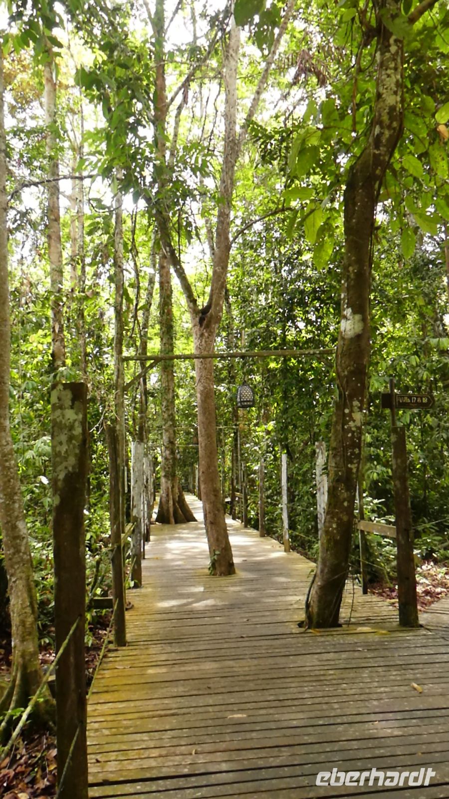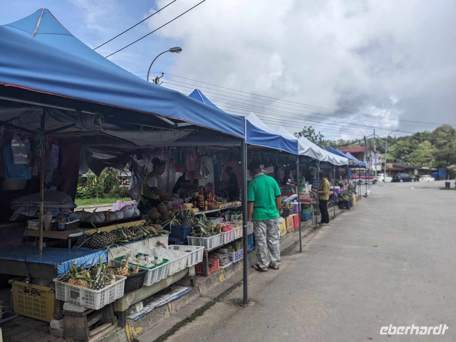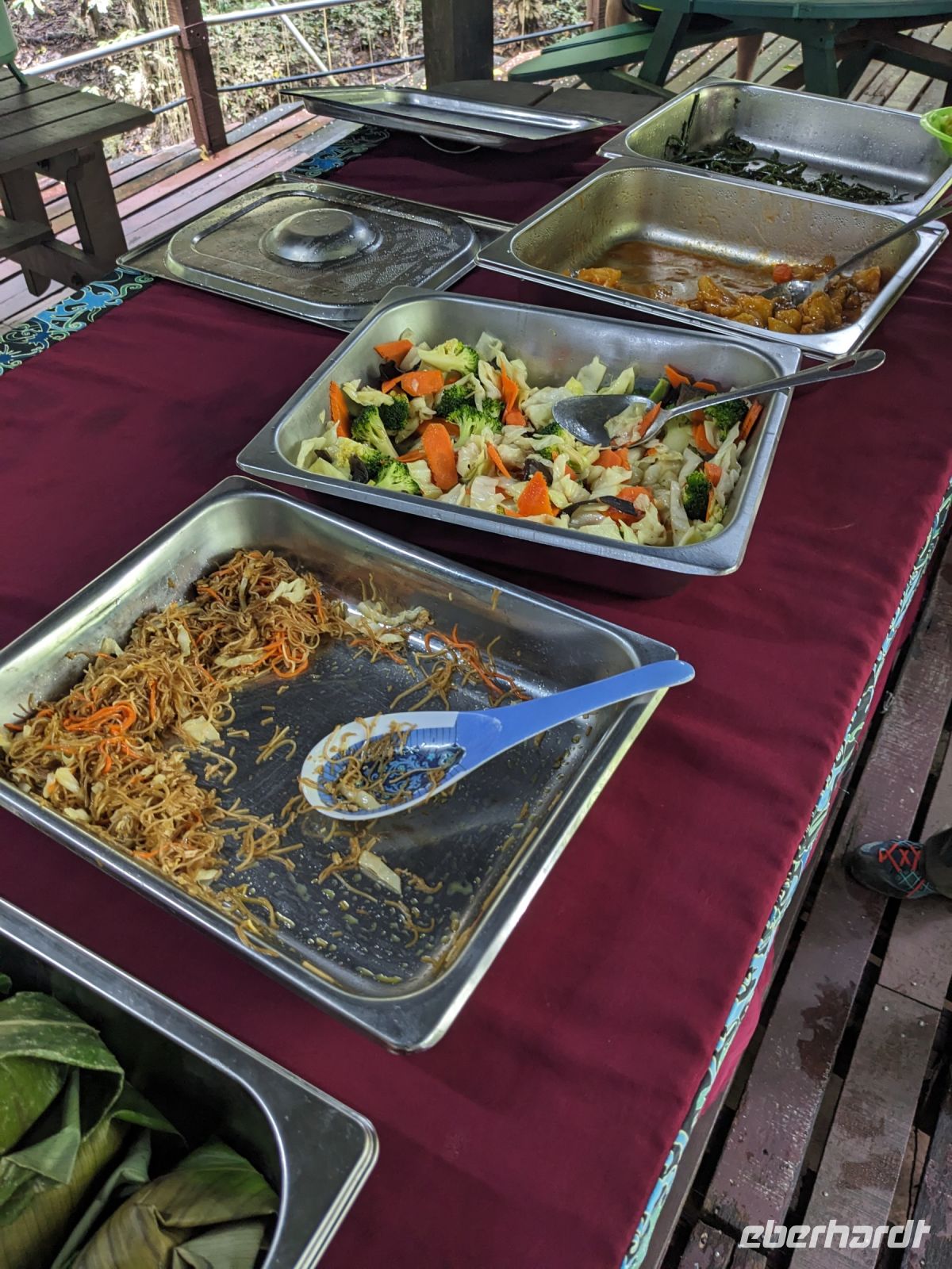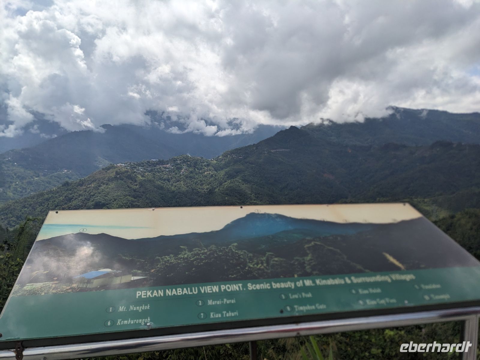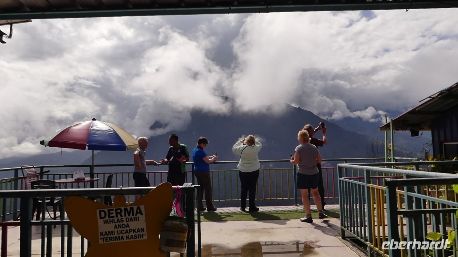 Nach einer gut zweistündigen Fahrt machten wir Stopp an unserem ersten Aussichtspunkt – eine Terrasse mit perfekten Blick auf den Mount Kinabalu – wären da nur nicht die Wolken gewesen… Aber was kann man machen? Wir genossen trotzdem den sonst sehr schönen Ausblick und probierten einige von Tino gekaufte Früchte. Weiter ging es zu einem anderen Aussichtspunkt – doch auch hier kein Glück. Es gab aber einige schöne Marktstände, wo man etwas stöbern konnte. Der Bus brachte uns dann in das Zentrum des Nationalparks, von wo aus wir eine kleine Wanderung durch den subtropischen Regenwald starteten. Nach großer Ankündigung erwartete uns dort aus „längste Moos“ der Welt sowie ein sehr schön angelegter Botanischer Garten. Im Anschluss gab es ein leckeres Mittagessen im schönen Headquarter des Parks. Auf dem Rückweg nach Kota Kinabalu probierten wir noch Reiswein und Wildschwein umgeben von vielen Einheimischen. Den Rest des späten Nachmittags und Abends hatten wir Freizeit. Während wir lecker an der Waterfront essen gingen, hörte ich von einem anderen Teil der Gruppe, dass hier eine Mangoverkostung auf dem Nachtmarkt erfolgte. Und so gestaltete sich jeder den Abend nach eigenen Vorstellungen.