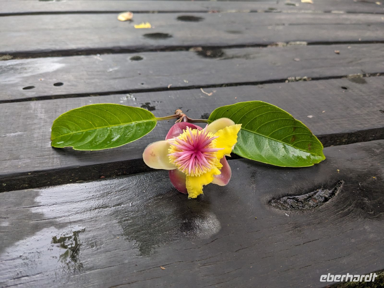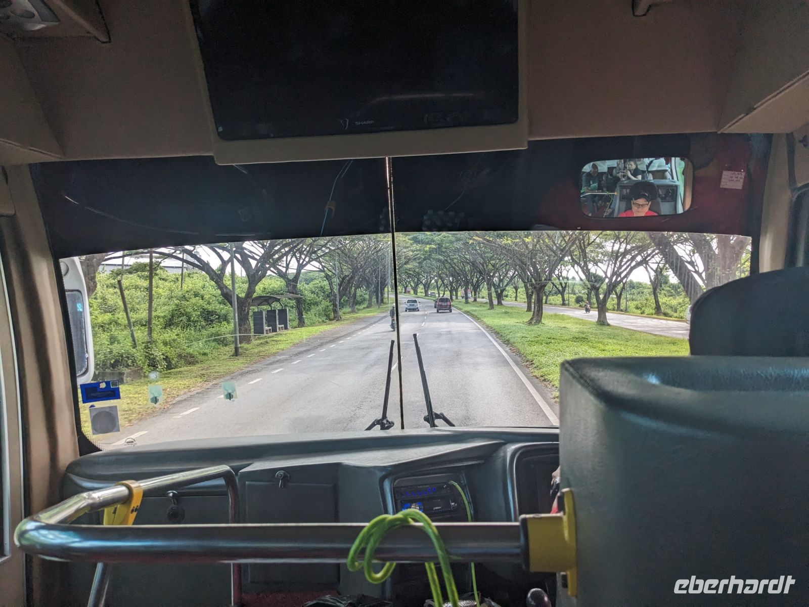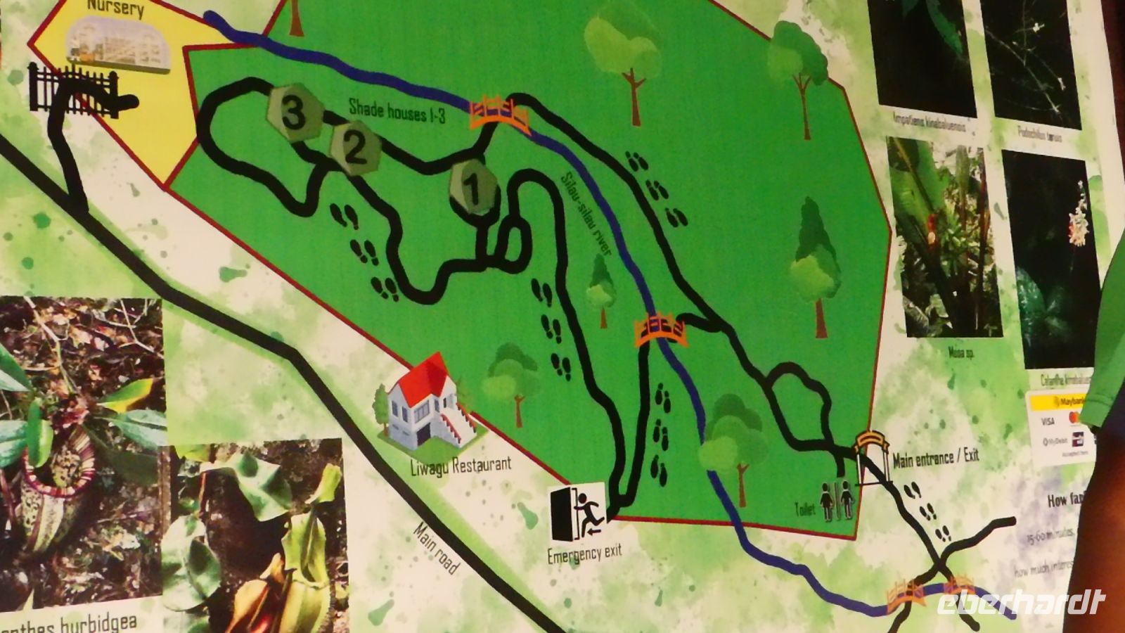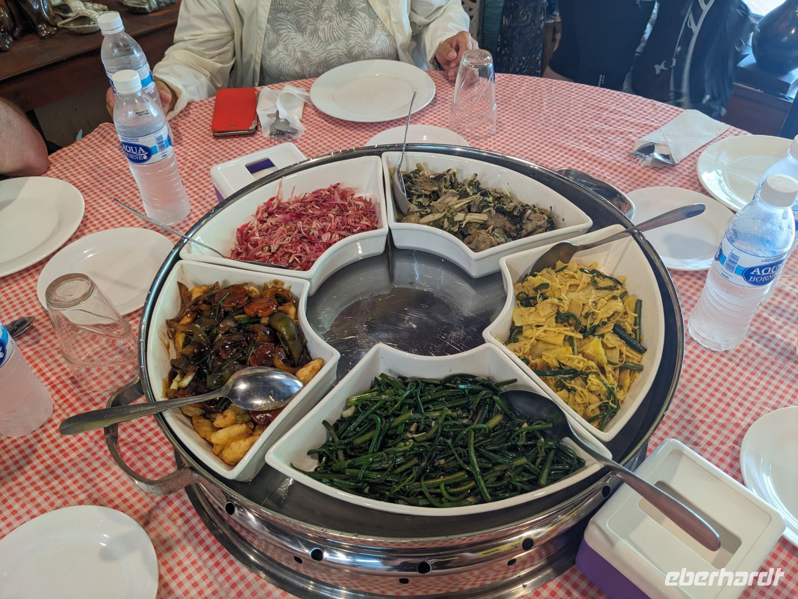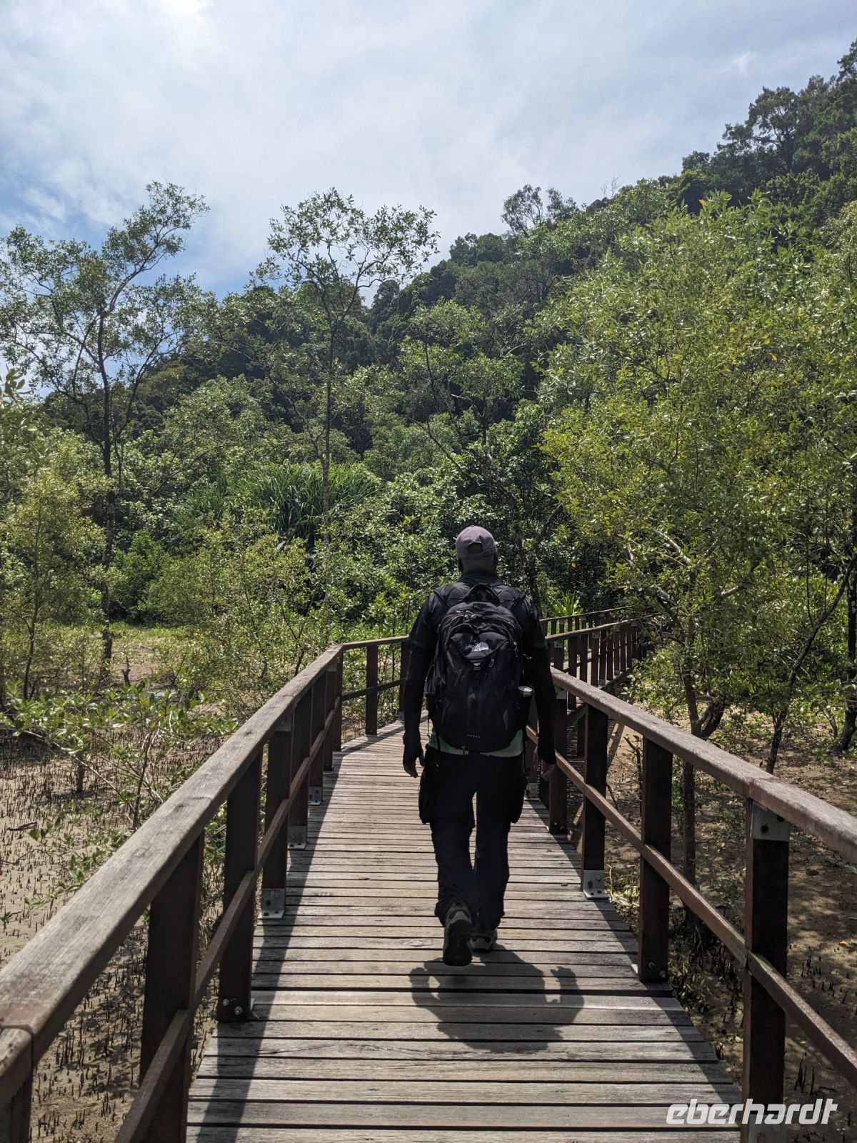 Nach einer gut zweistündigen Fahrt machten wir Stopp an unserem ersten Aussichtspunkt – eine Terrasse mit perfekten Blick auf den Mount Kinabalu – wären da nur nicht die Wolken gewesen… Aber was kann man machen? Wir genossen trotzdem den sonst sehr schönen Ausblick und probierten einige von Tino gekaufte Früchte. Weiter ging es zu einem anderen Aussichtspunkt – doch auch hier kein Glück. Es gab aber einige schöne Marktstände, wo man etwas stöbern konnte. Der Bus brachte uns dann in das Zentrum des Nationalparks, von wo aus wir eine kleine Wanderung durch den subtropischen Regenwald starteten. Nach großer Ankündigung erwartete uns dort aus „längste Moos“ der Welt sowie ein sehr schön angelegter Botanischer Garten. Im Anschluss gab es ein leckeres Mittagessen im schönen Headquarter des Parks. Auf dem Rückweg nach Kota Kinabalu probierten wir noch Reiswein und Wildschwein umgeben von vielen Einheimischen. Den Rest des späten Nachmittags und Abends hatten wir Freizeit. Während wir lecker an der Waterfront essen gingen, hörte ich von einem anderen Teil der Gruppe, dass hier eine Mangoverkostung auf dem Nachtmarkt erfolgte. Und so gestaltete sich jeder den Abend nach eigenen Vorstellungen.