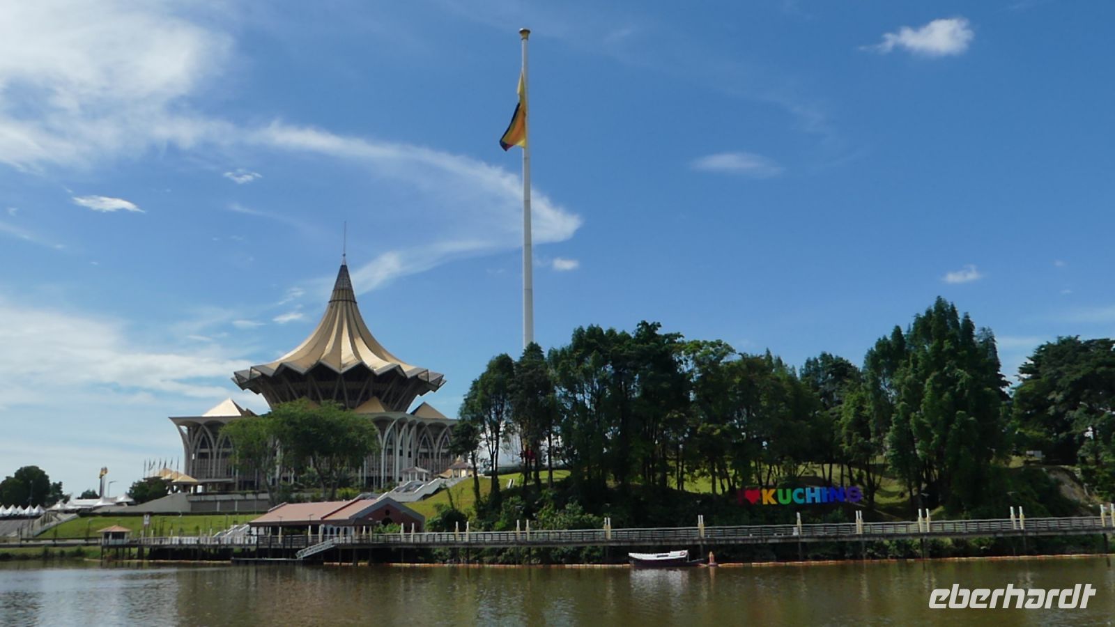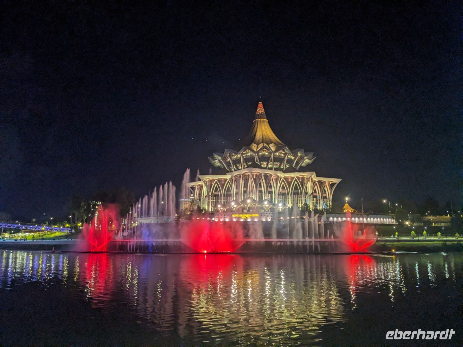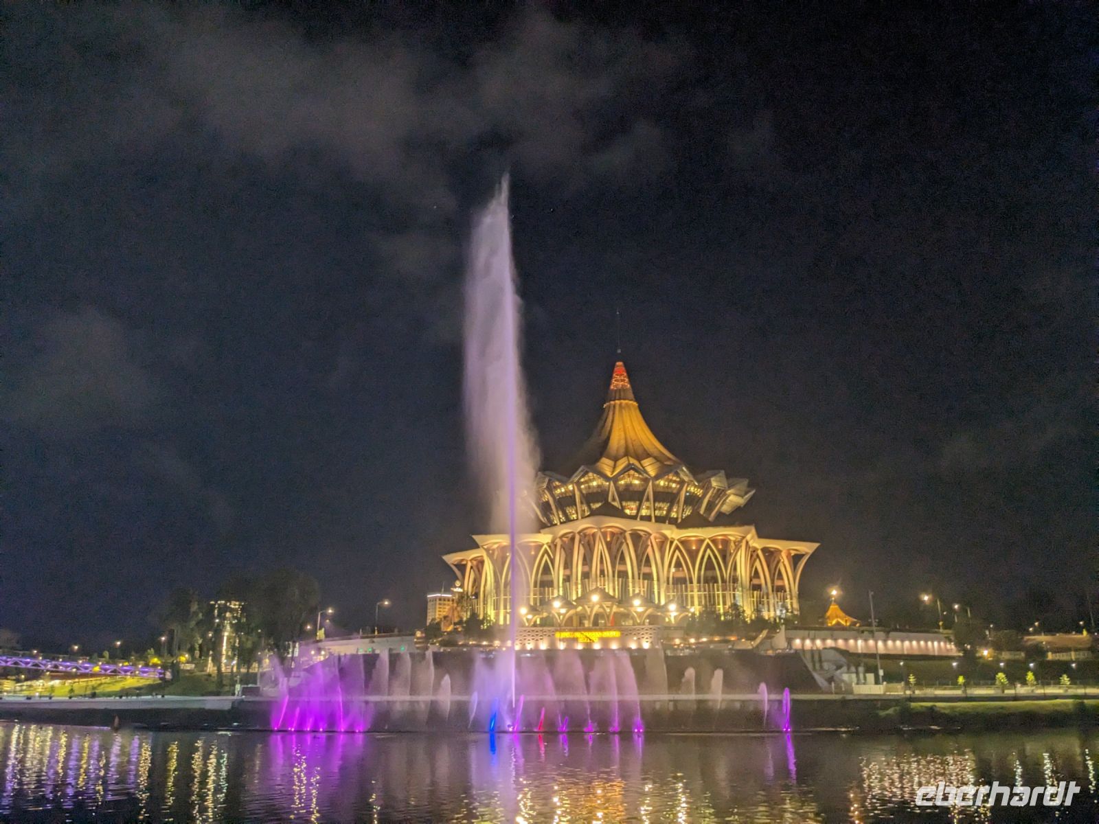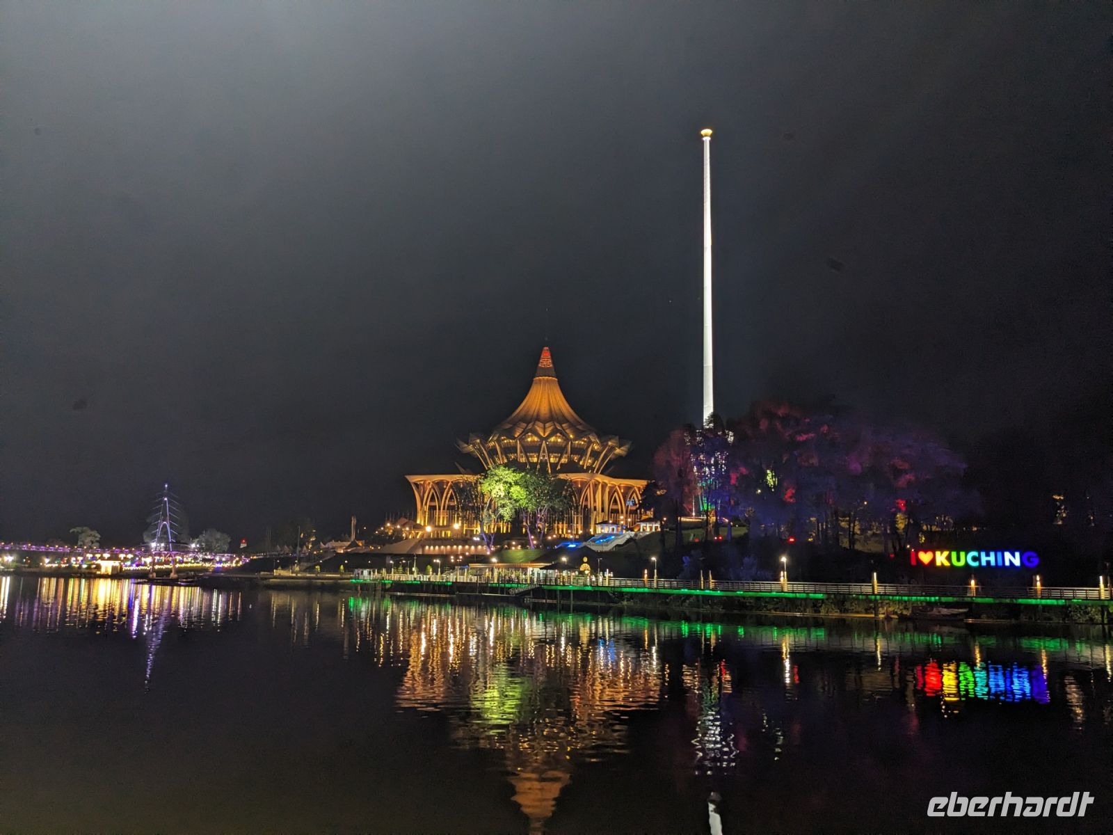 Ein wahrhaft schöner Tag erwartete uns heute. Nach einer paradiesischen Bootsfahrt kamen wir am Anleger des Nationalparks an. Während eines ersten Spaziergangs entdeckten wir schon einige tierische Bewohner – z.B. die Silbernen Haubenlanguren, eine Herde wilder Schweine sowie eine giftgrüne Schlange. Anschließend gab es ein Lunchpaket für uns, welches wir in der weitläufigen Zentrumshalle einnehmen konnten. Dann folgte unser zweiter Spaziergang oder sollte ich eher sagen Wanderung? Denn es ging über Stock und Stein, doch alles lohnte sich, denn auf dem Rückweg entdeckten wir unseren ersten Nasi – unseren ersten Nasenaffen. Er zeigt sich uns in seiner vollen Pracht und gab uns unglaublich viele schöne Möglichkeiten zum Fotografieren. Schließlich trauten sich auch die Langschwanz-Makaken heraus und damit haben wir alle drei vertretenen Affenarten innerhalb des Nationalparks gesehen. Nach diesem grandiosen Abschluss kehrten wir zurück nach Kuching. Dort verabredeten wir uns wieder zum Abendessen und überquerten dafür den Fluss in einem kleinen Boot, um zum Restaurant auf die andere Seite zu kommen. Direkt am Ufer genossen wir traditionelle Gerichte und als Dessert einen für die Region typischen Kuchen, welchen wir uns teilten. Mit dem Boot fuhren wir wieder zurück auf die andere Seite und flanierten noch entlang der Wasserpromenade, um die abendliche Wassershow vor dem Parlamentsgebäude zu bestaunen. Unterlegt mit Musik sowie Feuerelementen und schön ausgeleuchtet, hatten sie sich hier echt was einfallen lassen.