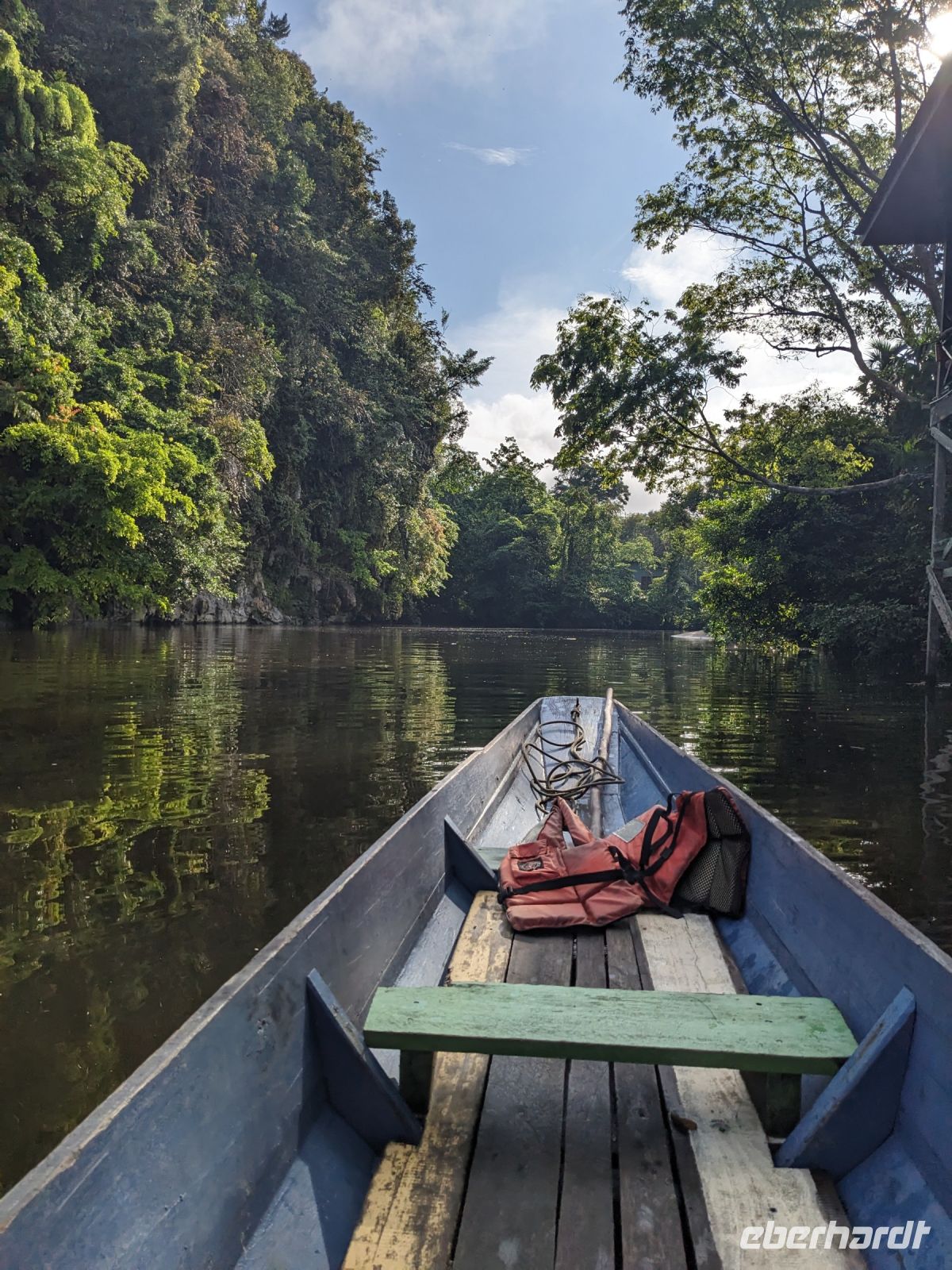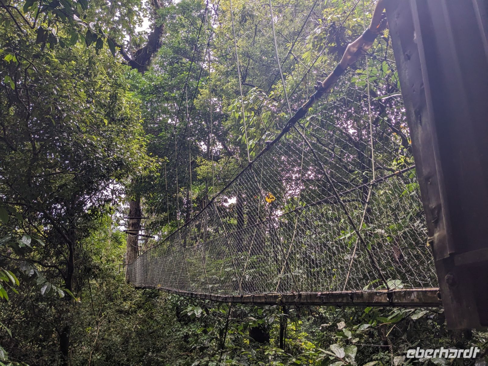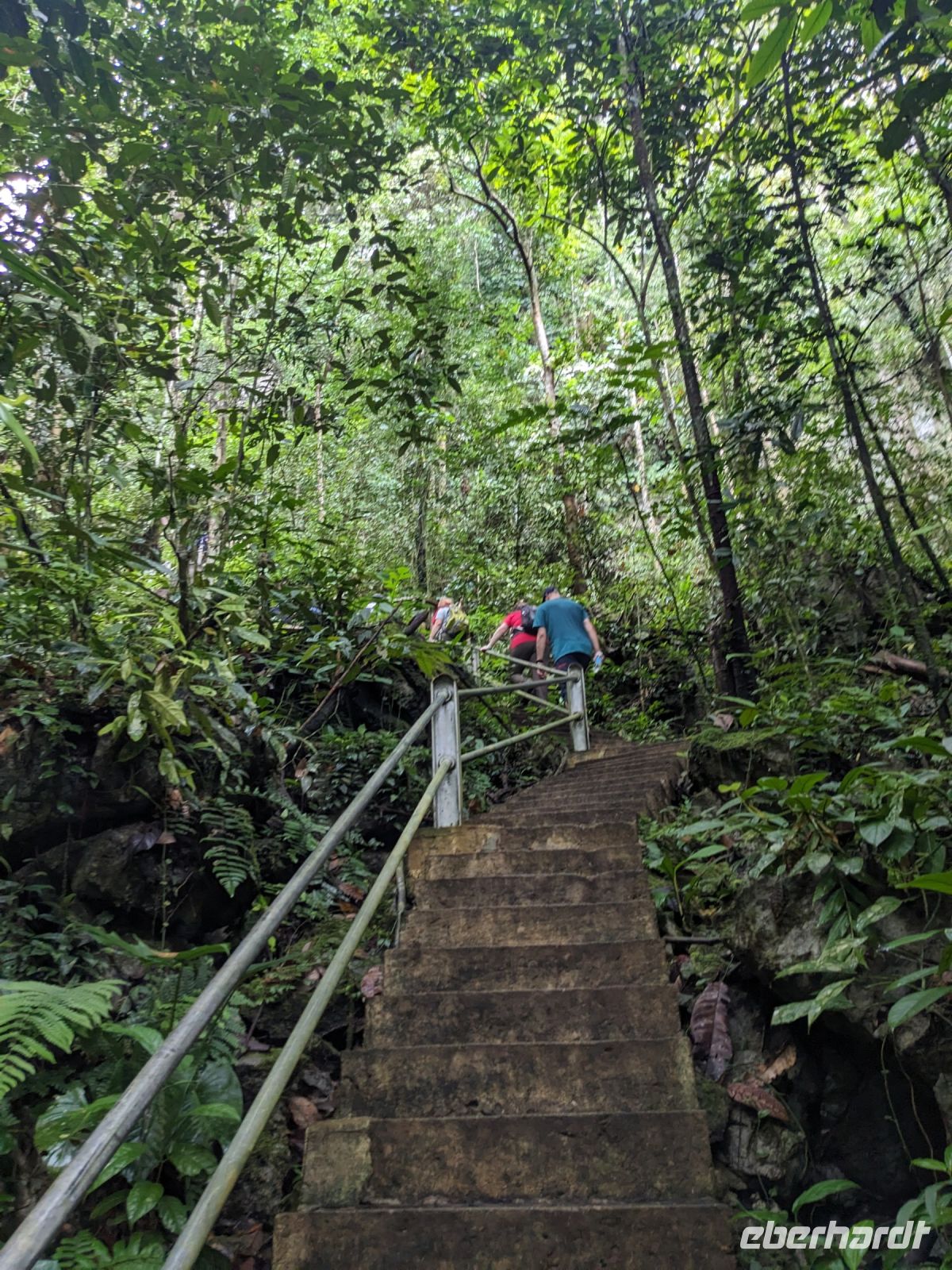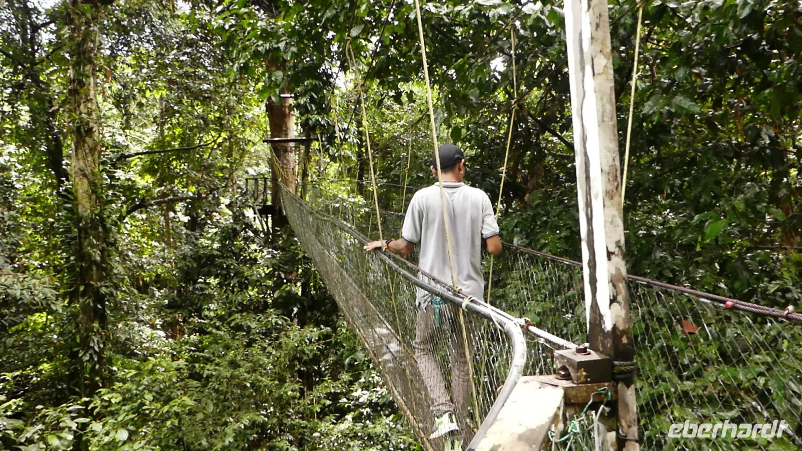 Mit dem Boot startete unser heutiger Rundreisetag. Wir machten kurz Halt in einem ehemaligen Nomadendorf, wo wir lokale Souvenirs erwerben sowie einmal üben konnten, ob wir in der Lage wären, mit einem Giftpfeil eine Zielscheibe zu treffen. Nächster Stopp war dann der Wind Cave, welcher an der ein oder anderen Stelle innerhalb der Höhle mit einem erfrischenden Windzug überraschte. Mit dem Boot ging es weiter zum Clearwater Cave. Während einige aus der Gruppe unten blieben, um bereits ein Bad in dem erfrischenden Nass des natürlichen Pools zu nehmen, bestieg der Rest der Gruppe die 200 Stufen zum Höhleneingang. Von dort führte der Weg wieder hinab in die Höhle hinein. Hier floss ein stetiger Strom, welcher in Zusammenhang mit der Resonanz der Höhlenwände eine einzigartige Akustik erzeugte. Wieder zurück bei den anderen gab es ein kleines Mittagessen und auch die restliche Gruppe konnte sich noch erfrischen. Gleich im Anschluss bestand die Möglichkeit, für alle, die wollten, den Hängebrücken-Spaziergang mitzumachen. Nachdem wir erstmal den Starkregen im Headquarter aussaßen, ging es hoch hinaus in die Baumwipfel des Regenwaldes. Dies war eine tolle Erfahrung. Ein weiteres Erfolgserlebnis erwartete uns heute: der verlorene Koffer kehrte zurück zu seinen rechtmäßigen Besitzern!