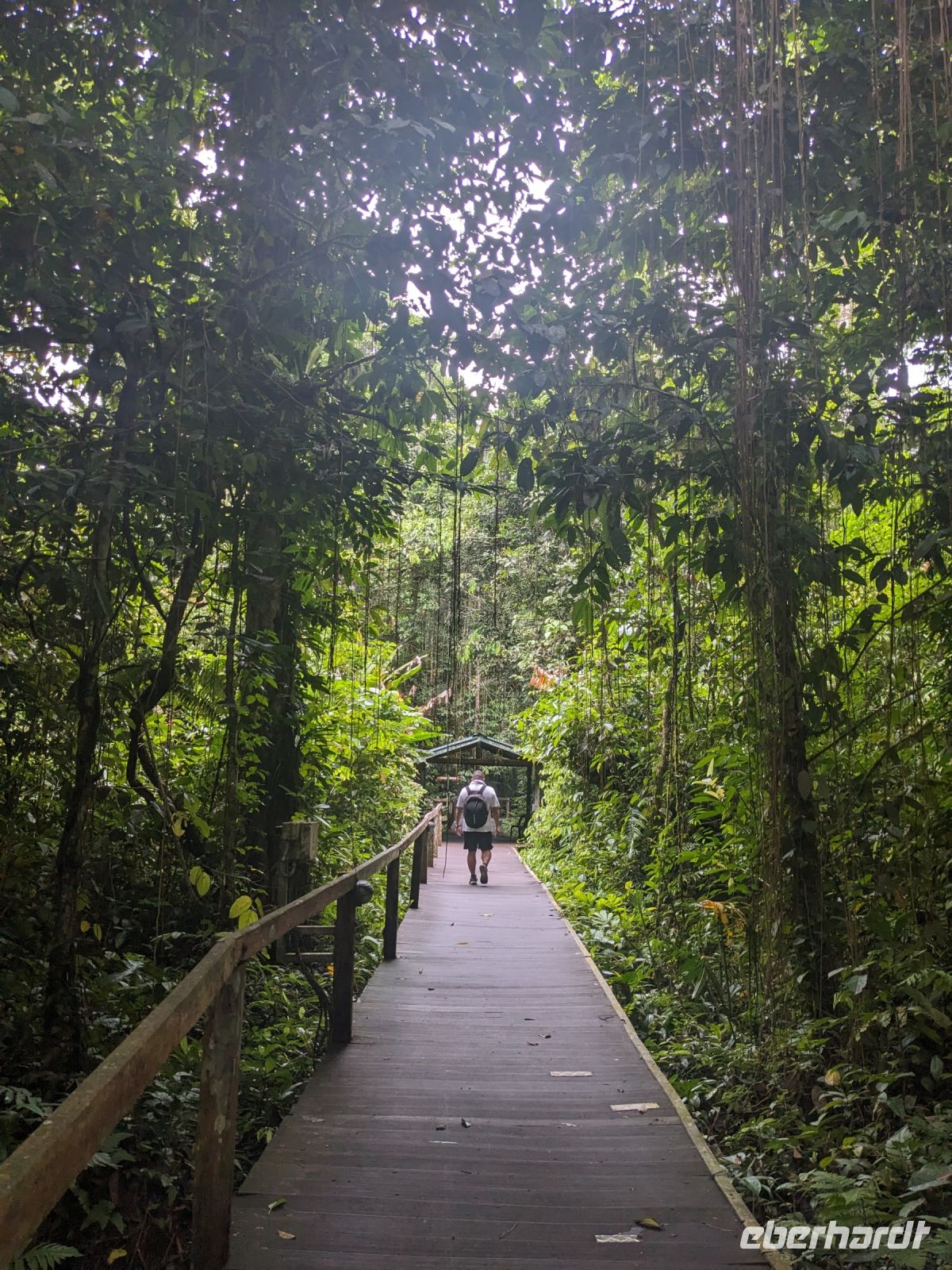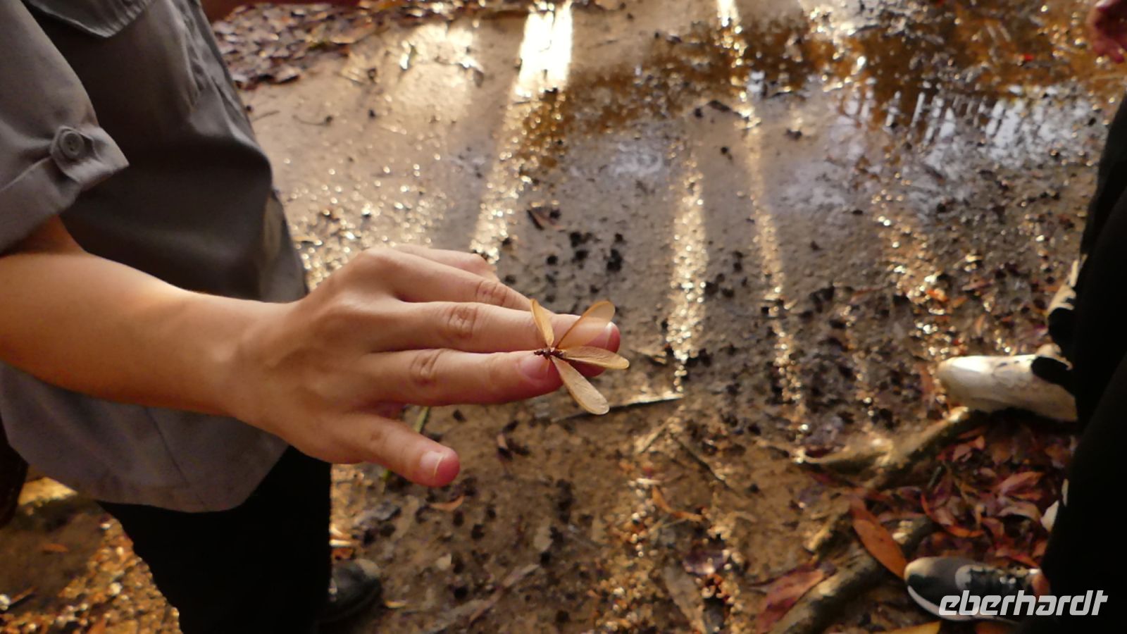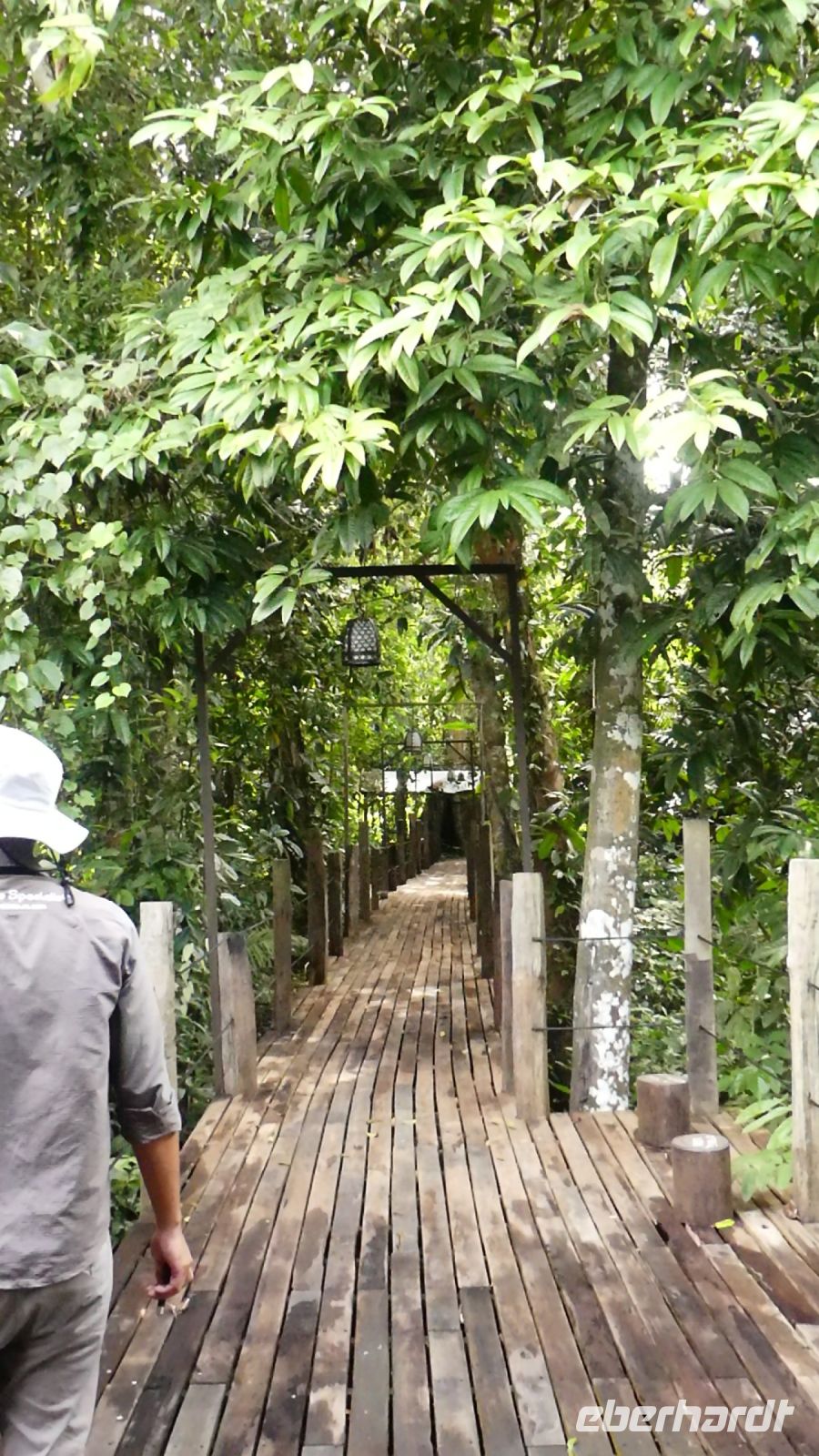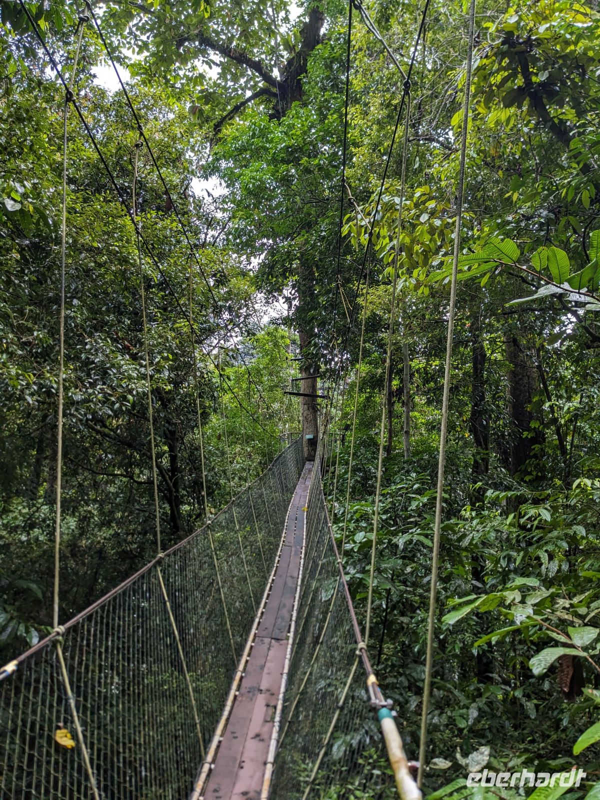 Mit dem Boot startete unser heutiger Rundreisetag. Wir machten kurz Halt in einem ehemaligen Nomadendorf, wo wir lokale Souvenirs erwerben sowie einmal üben konnten, ob wir in der Lage wären, mit einem Giftpfeil eine Zielscheibe zu treffen. Nächster Stopp war dann der Wind Cave, welcher an der ein oder anderen Stelle innerhalb der Höhle mit einem erfrischenden Windzug überraschte. Mit dem Boot ging es weiter zum Clearwater Cave. Während einige aus der Gruppe unten blieben, um bereits ein Bad in dem erfrischenden Nass des natürlichen Pools zu nehmen, bestieg der Rest der Gruppe die 200 Stufen zum Höhleneingang. Von dort führte der Weg wieder hinab in die Höhle hinein. Hier floss ein stetiger Strom, welcher in Zusammenhang mit der Resonanz der Höhlenwände eine einzigartige Akustik erzeugte. Wieder zurück bei den anderen gab es ein kleines Mittagessen und auch die restliche Gruppe konnte sich noch erfrischen. Gleich im Anschluss bestand die Möglichkeit, für alle, die wollten, den Hängebrücken-Spaziergang mitzumachen. Nachdem wir erstmal den Starkregen im Headquarter aussaßen, ging es hoch hinaus in die Baumwipfel des Regenwaldes. Dies war eine tolle Erfahrung. Ein weiteres Erfolgserlebnis erwartete uns heute: der verlorene Koffer kehrte zurück zu seinen rechtmäßigen Besitzern!