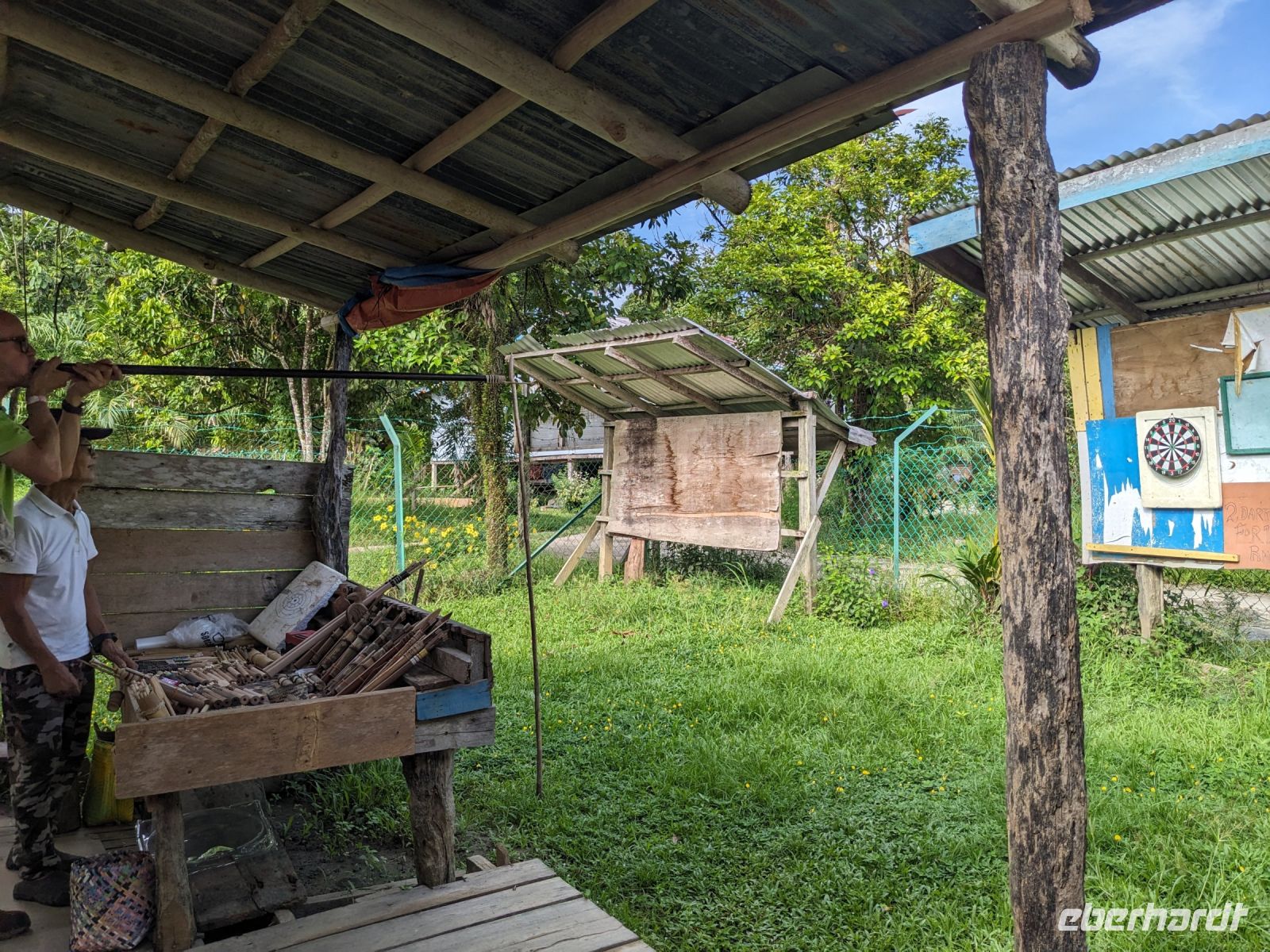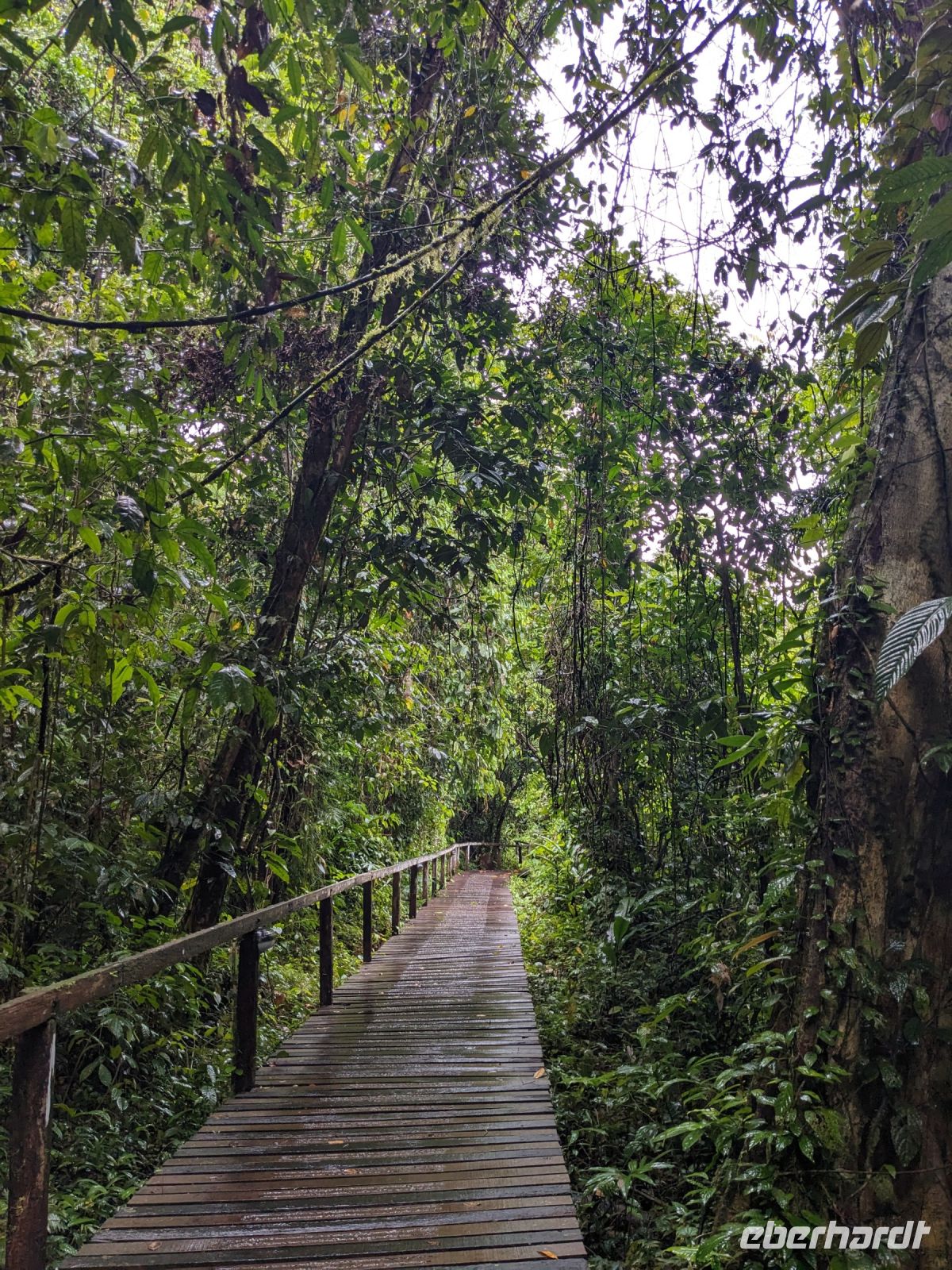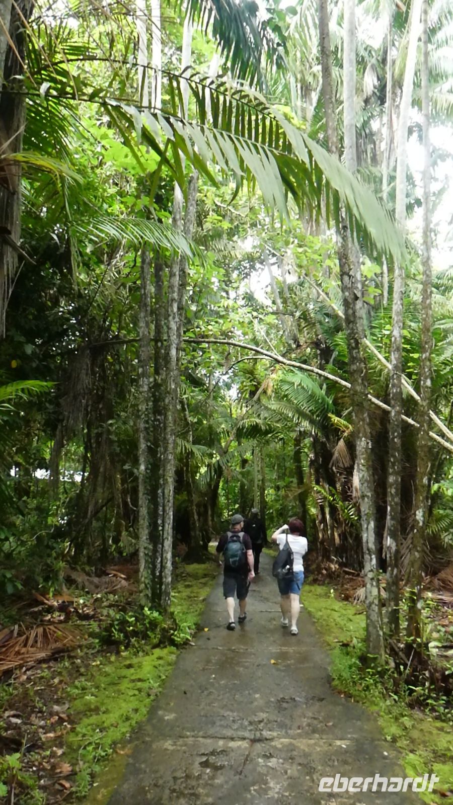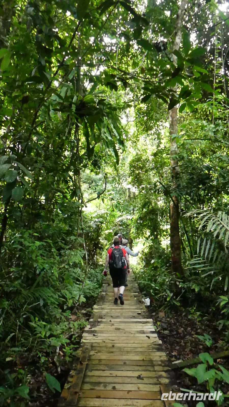 Mit dem Boot startete unser heutiger Rundreisetag. Wir machten kurz Halt in einem ehemaligen Nomadendorf, wo wir lokale Souvenirs erwerben sowie einmal üben konnten, ob wir in der Lage wären, mit einem Giftpfeil eine Zielscheibe zu treffen. Nächster Stopp war dann der Wind Cave, welcher an der ein oder anderen Stelle innerhalb der Höhle mit einem erfrischenden Windzug überraschte. Mit dem Boot ging es weiter zum Clearwater Cave. Während einige aus der Gruppe unten blieben, um bereits ein Bad in dem erfrischenden Nass des natürlichen Pools zu nehmen, bestieg der Rest der Gruppe die 200 Stufen zum Höhleneingang. Von dort führte der Weg wieder hinab in die Höhle hinein. Hier floss ein stetiger Strom, welcher in Zusammenhang mit der Resonanz der Höhlenwände eine einzigartige Akustik erzeugte. Wieder zurück bei den anderen gab es ein kleines Mittagessen und auch die restliche Gruppe konnte sich noch erfrischen. Gleich im Anschluss bestand die Möglichkeit, für alle, die wollten, den Hängebrücken-Spaziergang mitzumachen. Nachdem wir erstmal den Starkregen im Headquarter aussaßen, ging es hoch hinaus in die Baumwipfel des Regenwaldes. Dies war eine tolle Erfahrung. Ein weiteres Erfolgserlebnis erwartete uns heute: der verlorene Koffer kehrte zurück zu seinen rechtmäßigen Besitzern!