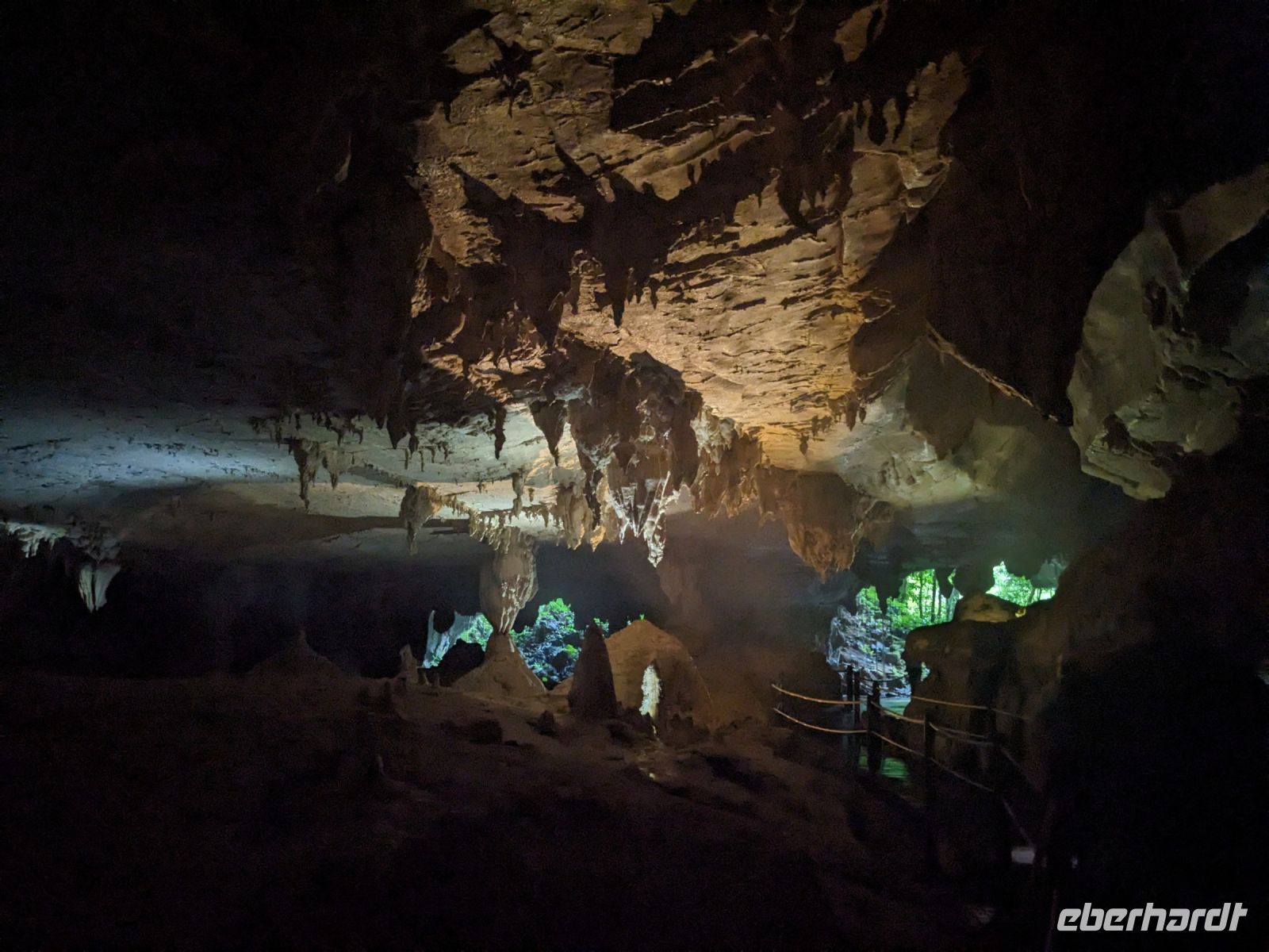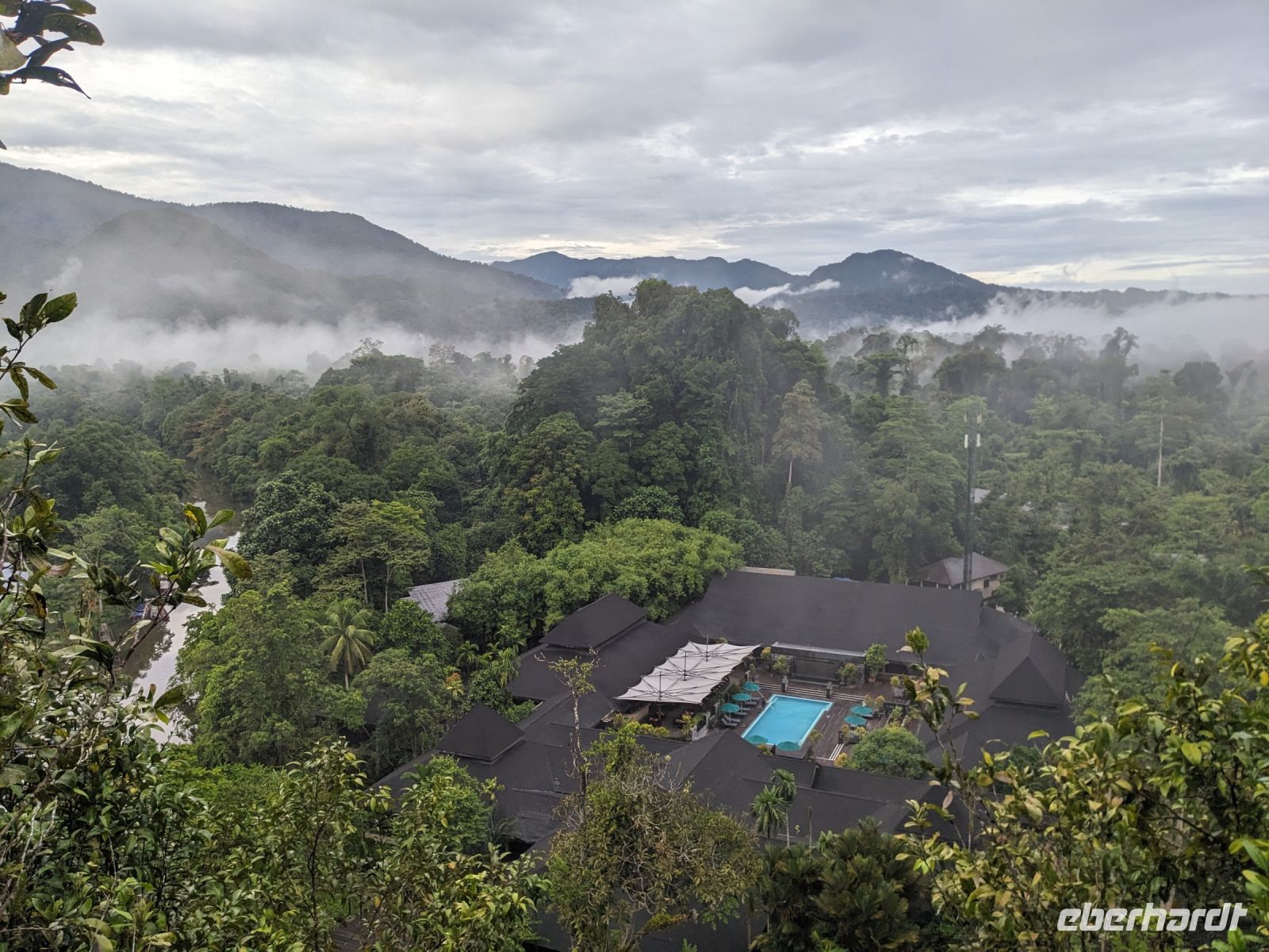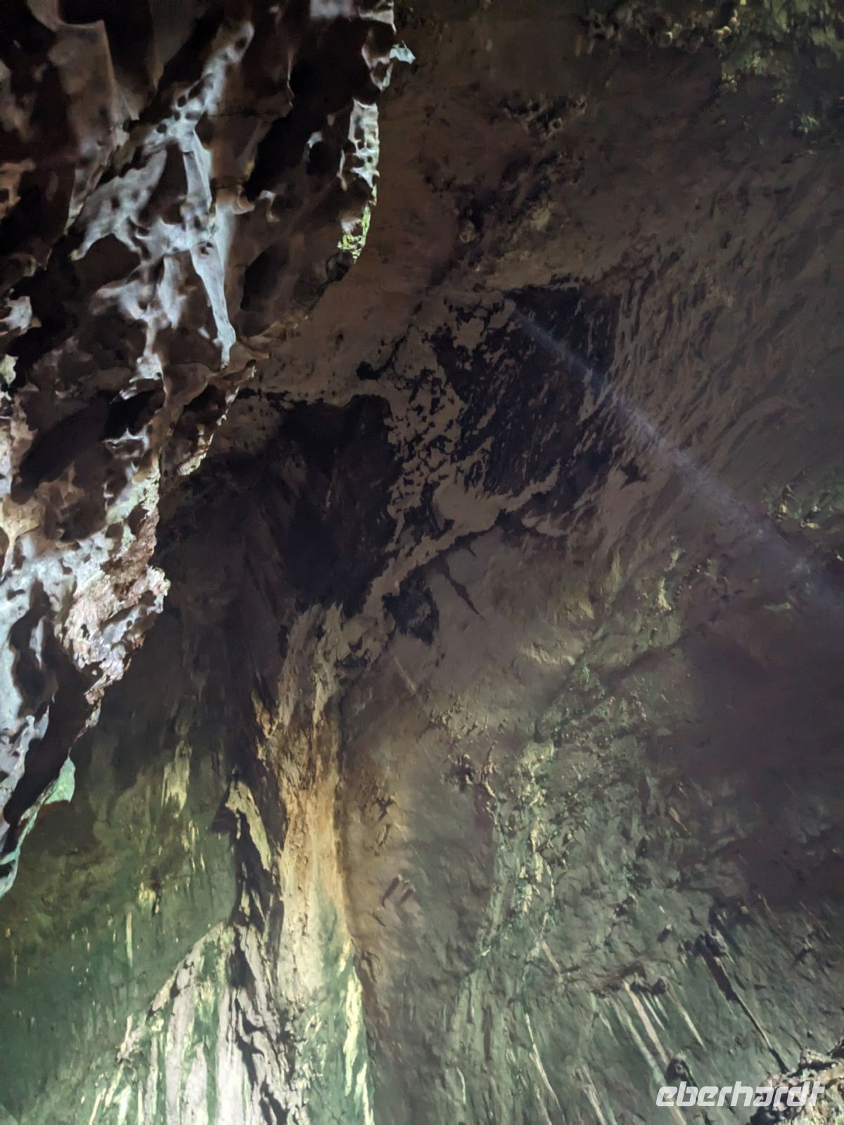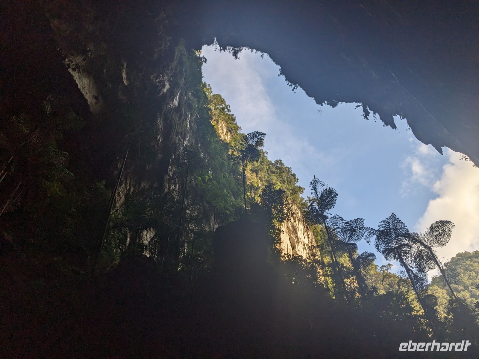 Nach unserer Ankunft an dem sehr kleinen Flughafen in Mulu brachte man uns sogleich ins Hotel. Während wir darauf warteten, dass unsere Zimmer bezugsfertig wurden, erlebten wir bereits dieses einzigartige offene Konzept der Lodge umgeben von purer Natur. Schließlich ging es zum Mittagessen, worauf wir im Anschluss unsere Erkundungstour im Mulu Nationalpark starteten. Entlang des flachen Boardwalks erlebten wir den Regenwald von Borneo mit all seiner Intensität. Es zeigten sich einige tierische Bewohner, vor allem Insekten und final kamen wir dann auf eine Lichtung, an der wir kurz Pause machten und später zum Fledermäuse beobachten zurückkehren sollten. Doch solange es noch hell war, bestaunten wir zunächst erstmal Langs Cave und Deer Cave. Langs Cave beeindruckte vor allem mit seinen zahlreichen außergewöhnlichen Formationen. Deer Cave gab bereits einen Eindruck davon, was uns gleich erwartete. Die riesigen dunklen Flecken an der Höhlendecke waren die Millionen fast aufbruchsbereiten Fledermäusen. Zudem zeigte sich das Profil von Abraham Lincoln mit Blick auf den großen Höhleneingang. Gerade noch rechtzeitig schafften wir es zurück zur Lichtung und bestaunten das unglaubliche natürliche Spektakel der Fledermausschwärme, welche in der Abenddämmerung gen Himmel zogen, um auf Nahrungssuche zu gehen. In kleinerer Gruppe unternahmen wir noch eine Nachtwanderung, während der Großteil der Gruppe in die Lodge zum Abendessen zurückkehrte.