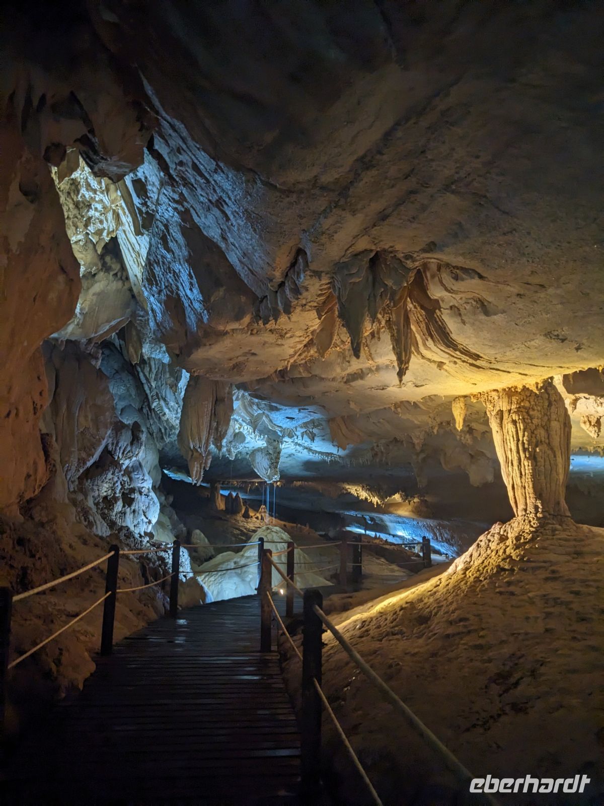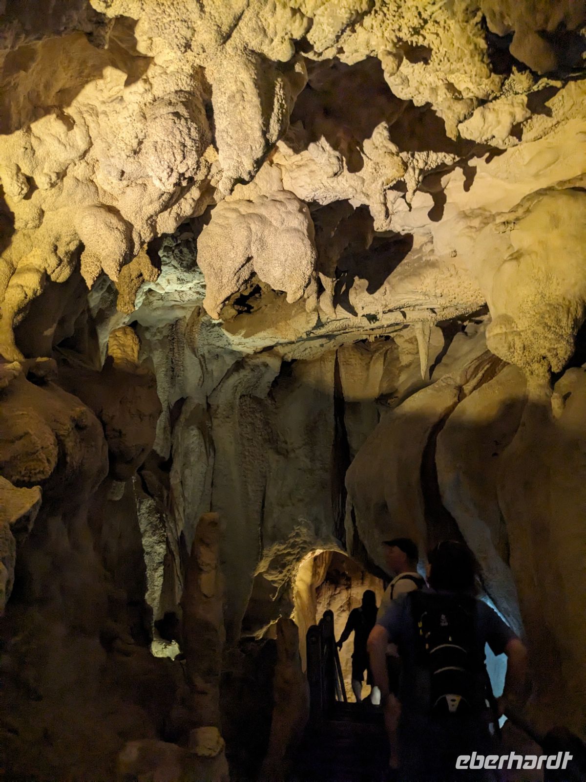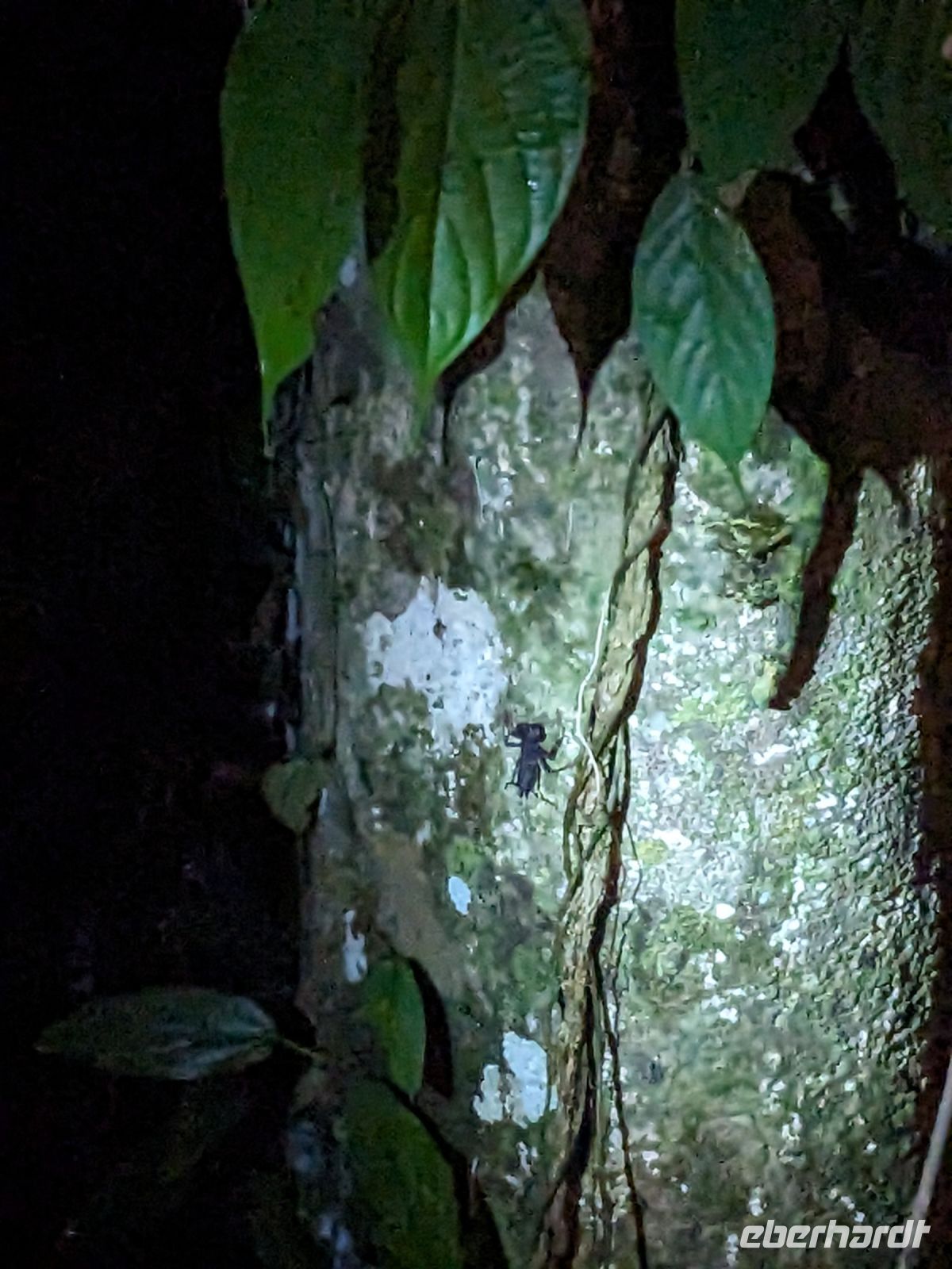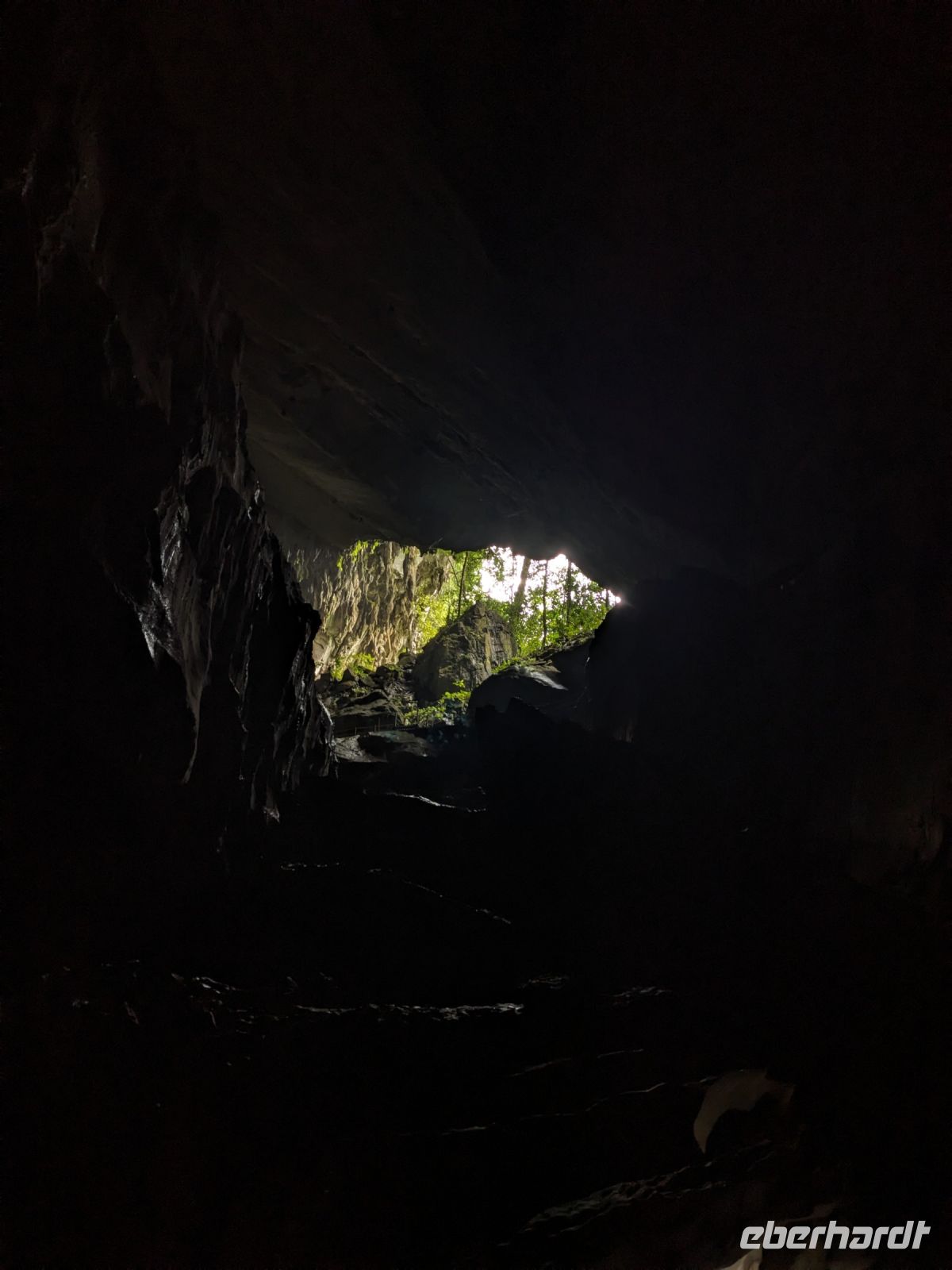Nach unserer Ankunft an dem sehr kleinen Flughafen in Mulu brachte man uns sogleich ins Hotel. Während wir darauf warteten, dass unsere Zimmer bezugsfertig wurden, erlebten wir bereits dieses einzigartige offene Konzept der Lodge umgeben von purer Natur. Schließlich ging es zum Mittagessen, worauf wir im Anschluss unsere Erkundungstour im Mulu Nationalpark starteten. Entlang des flachen Boardwalks erlebten wir den Regenwald von Borneo mit all seiner Intensität. Es zeigten sich einige tierische Bewohner, vor allem Insekten und final kamen wir dann auf eine Lichtung, an der wir kurz Pause machten und später zum Fledermäuse beobachten zurückkehren sollten. Doch solange es noch hell war, bestaunten wir zunächst erstmal Langs Cave und Deer Cave. Langs Cave beeindruckte vor allem mit seinen zahlreichen außergewöhnlichen Formationen. Deer Cave gab bereits einen Eindruck davon, was uns gleich erwartete. Die riesigen dunklen Flecken an der Höhlendecke waren die Millionen fast aufbruchsbereiten Fledermäusen. Zudem zeigte sich das Profil von Abraham Lincoln mit Blick auf den großen Höhleneingang. Gerade noch rechtzeitig schafften wir es zurück zur Lichtung und bestaunten das unglaubliche natürliche Spektakel der Fledermausschwärme, welche in der Abenddämmerung gen Himmel zogen, um auf Nahrungssuche zu gehen. In kleinerer Gruppe unternahmen wir noch eine Nachtwanderung, während der Großteil der Gruppe in die Lodge zum Abendessen zurückkehrte.