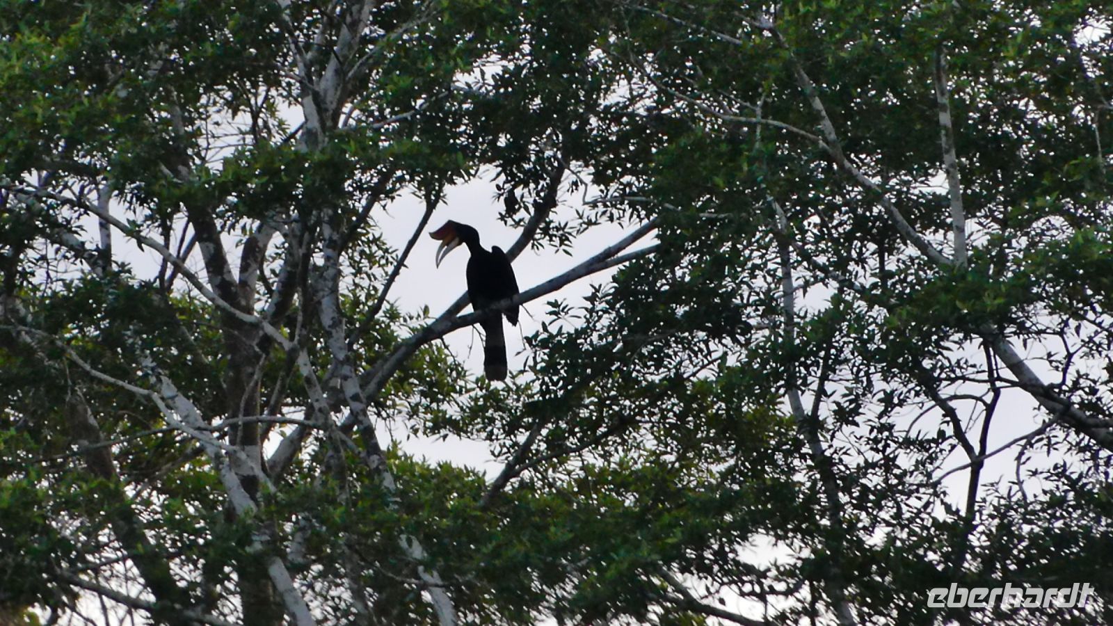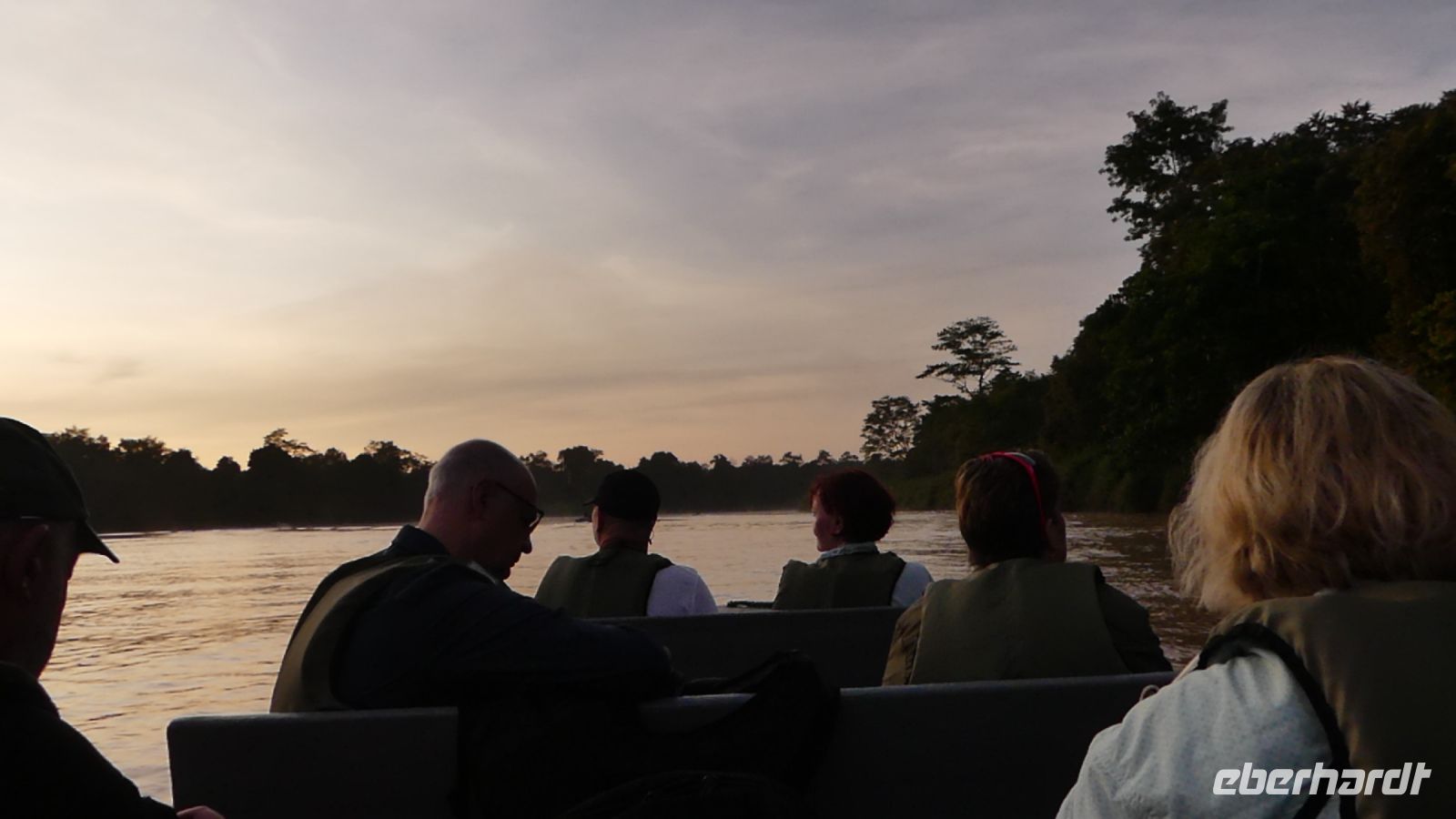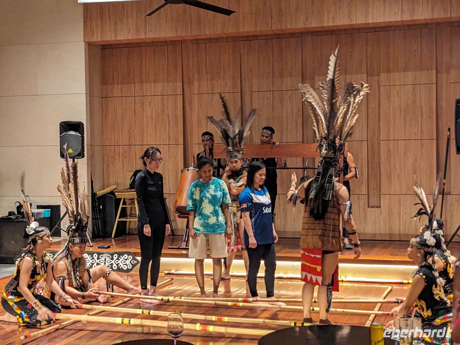 Nach dem Besuch des Orang Utan Zentrums Sepilok, wo wir sowohl Jungtiere als auch ausgewachsene Tiere bestaunen konnten, erlebten wir dort auch die für die Region typischen Sonnenbären. Letztere werden je nach Altersgruppe getrennt voneinander gehalten und wir bekamen die Möglichkeit, sie von der Besucherplattform über den Gehegen zu beobachten. Bei den Orang Utans hatten wir gerade das Glück, dass es wenig Früchte im Wald gibt, sodass die Tiere vermehrt zu den Fütterungszeiten kommen. Auch hier würdigte uns wieder ein großes Alpha-Männchen mit seiner Präsenz, doch genau wie in dem Centre in Sarawak, war er eher kamerascheu und zeigte uns vielfach seine Kehrseite. Es ist schwierig, die Stimmung der Tiere einzuschätzen, da sie sich keinerlei Emotionen ansehen lassen und so ist auf Abstand zu gehen, in jeder Situation, der beste Ratschlag. Mit dem Bus fuhren wir dann zu unserer Rainforest Lodge direkt am Kinabatangan-Fluss. Gerade noch rechtzeitig vor einem Regenguss schafften wir es zu unserer Unterkunft. Pünktlich für die spätnachmittägliche Rundfahrt hörte es dann wieder auf und wir erlebten zahlreiche Nasenaffen, Makaken sowie gut versteckte Orang Utans in freier Wildbahn. Auch der für die Region typische Nashornvogel zeigte sich uns. Bei toller Stimmung während der Abenddämmerung erlebten wir eine eindrucksvolle Bootsfahrt. Wieder zurück in der Lodge gab es in traditionellen Gewändern gekleidet ein leckeres Buffet.