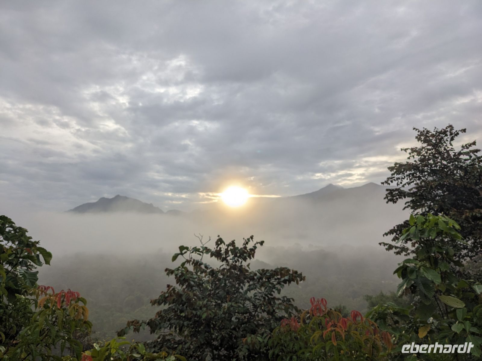 Bis zur Mittagszeit durften wir noch auf unseren Zimmern bleiben. Nach einem noch recht trockenen Morgen weinte Borneo am späten Vormittag bittere Tränen, dass es für uns heute zurück in Richtung Deutschland ging. Es hörte dann aber rechtzeitig wieder auf zu regnen, als wir zum Rhino Centre aufgebrochen sind. Dort erwarteten uns die netten Betreiber sowie ein toller letzter Blick auf den Mount Kinabalu. Auch eine Affendame kam nochmal vorbei, um sich zu verabschieden. Das Ambiente des Cafés direkt am Fluss mit toller Aussicht bildete einen schönen Abschluss unserer gemeinsamen Zeit. Schließlich wurden wir abgeholt und zum Flughafen gebracht. Mit Zwischenlandung in Singapur traten wir die Rückreise nach Deutschland an.
