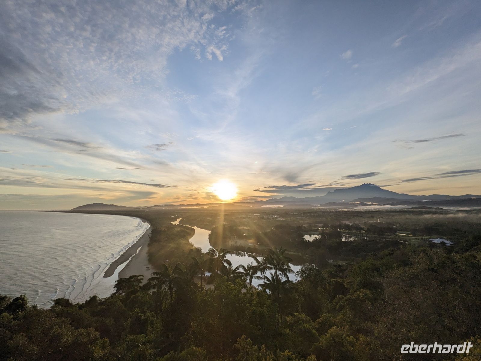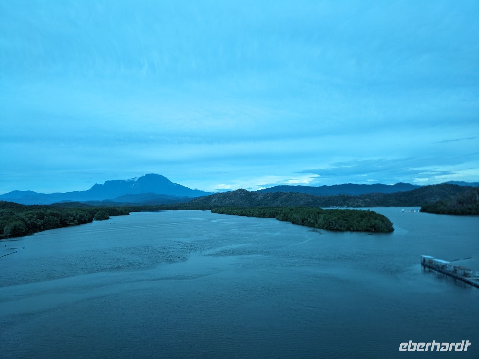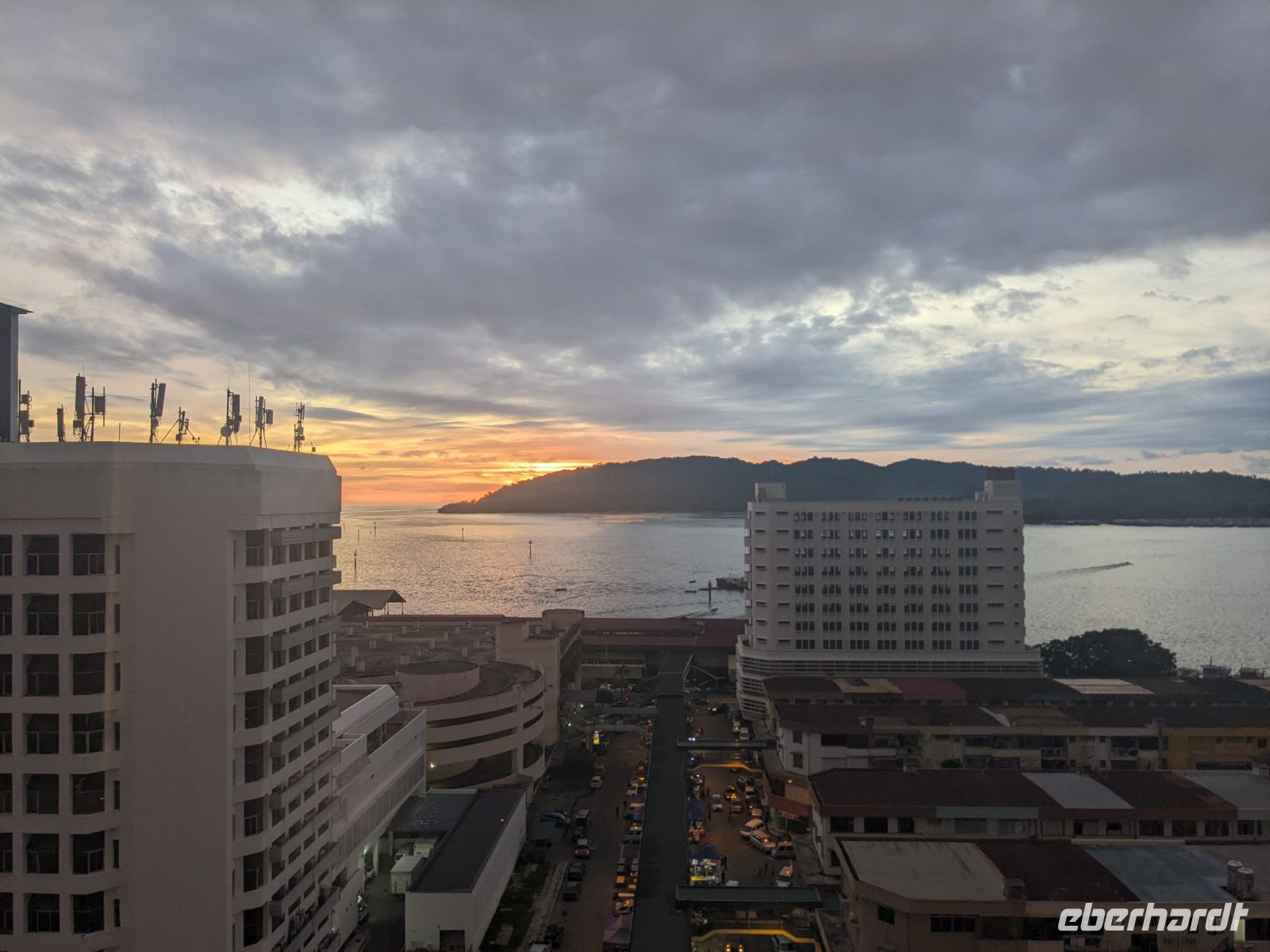 Unser Reiseleiter Larry bot uns an, zum Sonnenaufgang auf einen Aussichtshügel zu steigen, um die Sonne über den Mount Mulu aufgehen zu sehen. Ein paar Frühaufsteher nahmen die Herausforderung an und zur frühen Morgenstunde trafen wir uns. Aufgrund der Uhrzeit lag noch ein leichter Nebelschleier über den Bergen und verlieh dem Ganzen eine mystische Atmosphäre. Anschließend wurden wir zum Flughafen gebracht und brachen nach Kota Kinabalu auf, unserem ersten Stopp im Bundesstaat Sabah. Dort angekommen, wurden wir von unserem neuen Reiseleiter Seerjay in Empfang genommen. Mit ihm zusammen besuchten wir die sogenannte Schwimmende Moschee. Wer wollte konnte gegen eine kleine Gebühr auch reingehen und musste sich dementsprechend auch kleiden. Schließlich besuchten wir noch einen buddhistischen Tempel, in welchem gerade Vorbereitungen für einen Feiertag am Folgetag getroffen wurden. Nach dem Check-In im Hotel und etwas Zeit zum frisch machen, trafen wir uns erneut zum gemeinsamen Abendessen und danach trennten sich unsere Wege. Während einige direkt in eine Bar gingen, stöberten wir anderen noch etwas über den Nachtmarkt und kehrten zurück zum Hotel.