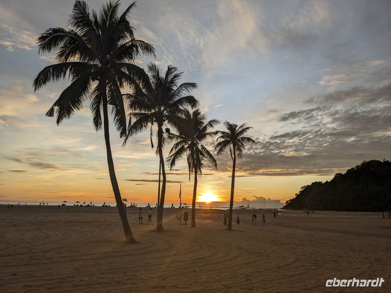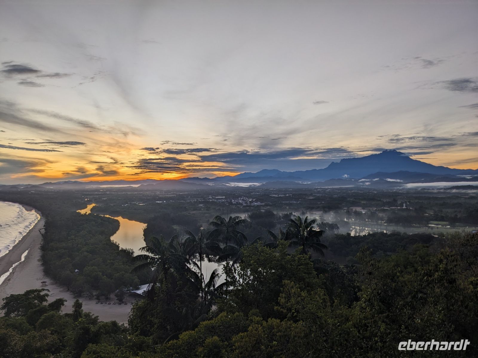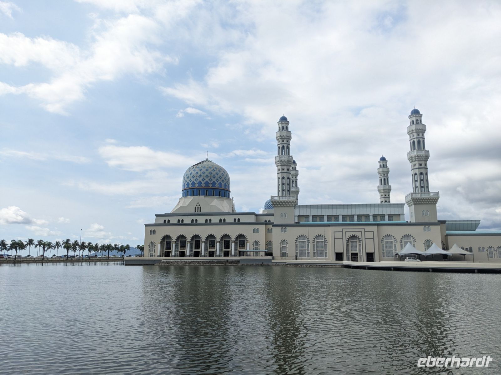 Unser Reiseleiter Larry bot uns an, zum Sonnenaufgang auf einen Aussichtshügel zu steigen, um die Sonne über den Mount Mulu aufgehen zu sehen. Ein paar Frühaufsteher nahmen die Herausforderung an und zur frühen Morgenstunde trafen wir uns. Aufgrund der Uhrzeit lag noch ein leichter Nebelschleier über den Bergen und verlieh dem Ganzen eine mystische Atmosphäre. Anschließend wurden wir zum Flughafen gebracht und brachen nach Kota Kinabalu auf, unserem ersten Stopp im Bundesstaat Sabah. Dort angekommen, wurden wir von unserem neuen Reiseleiter Seerjay in Empfang genommen. Mit ihm zusammen besuchten wir die sogenannte Schwimmende Moschee. Wer wollte konnte gegen eine kleine Gebühr auch reingehen und musste sich dementsprechend auch kleiden. Schließlich besuchten wir noch einen buddhistischen Tempel, in welchem gerade Vorbereitungen für einen Feiertag am Folgetag getroffen wurden. Nach dem Check-In im Hotel und etwas Zeit zum frisch machen, trafen wir uns erneut zum gemeinsamen Abendessen und danach trennten sich unsere Wege. Während einige direkt in eine Bar gingen, stöberten wir anderen noch etwas über den Nachtmarkt und kehrten zurück zum Hotel.