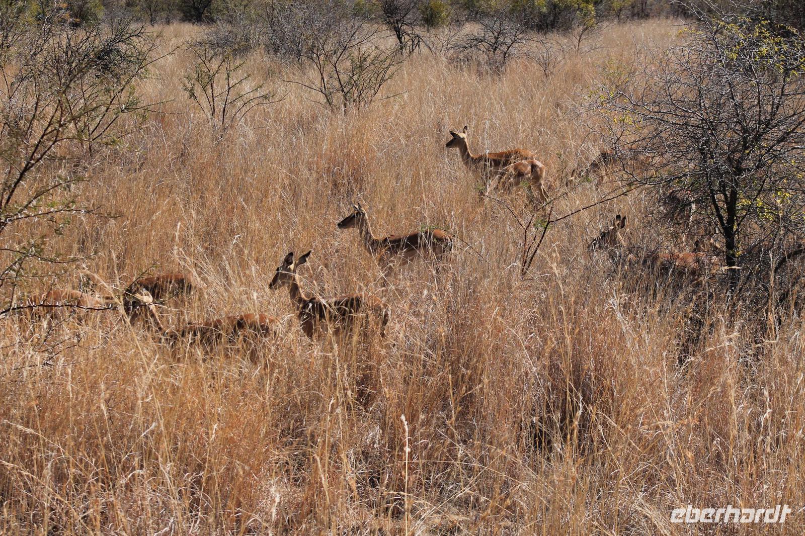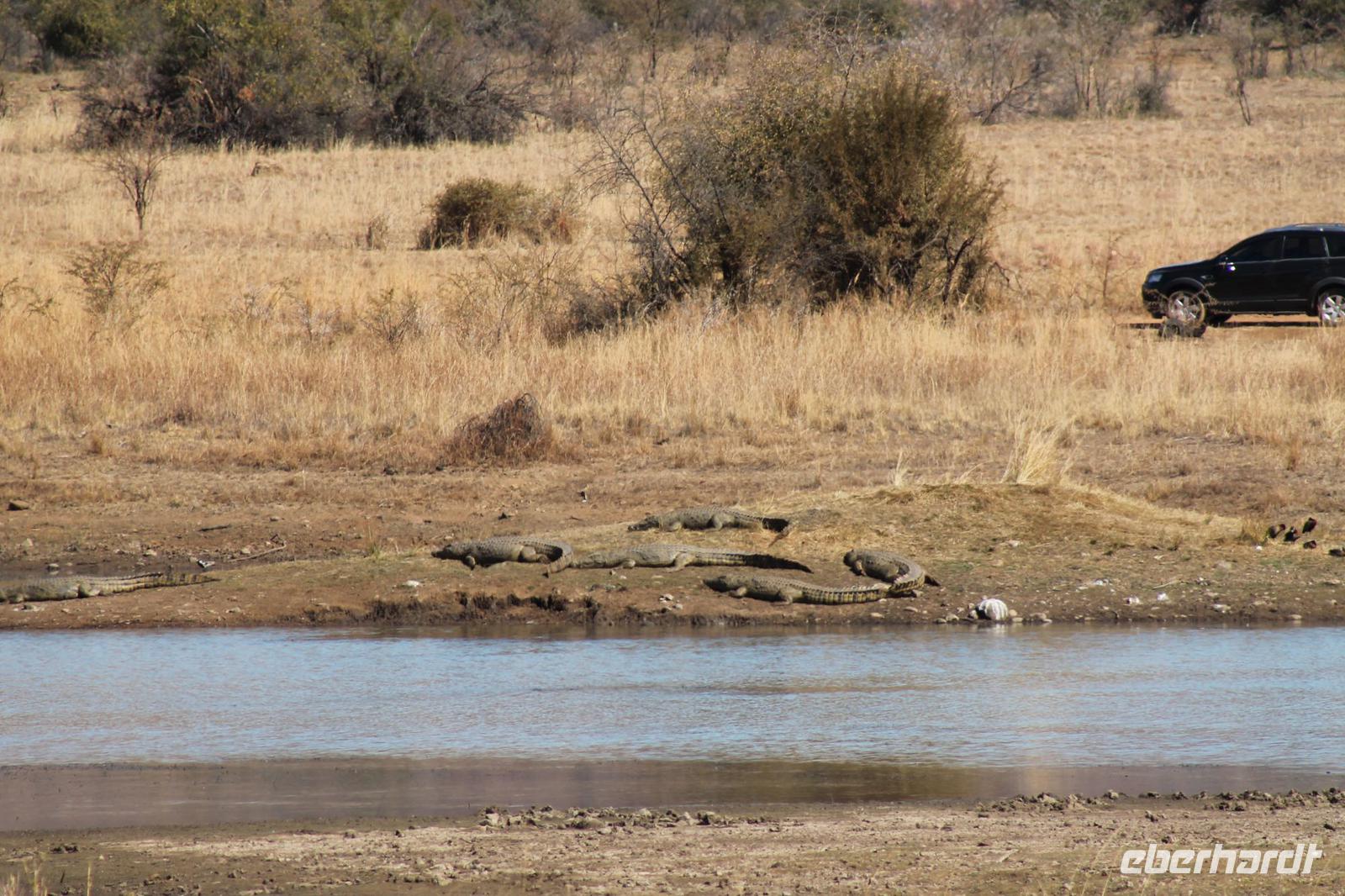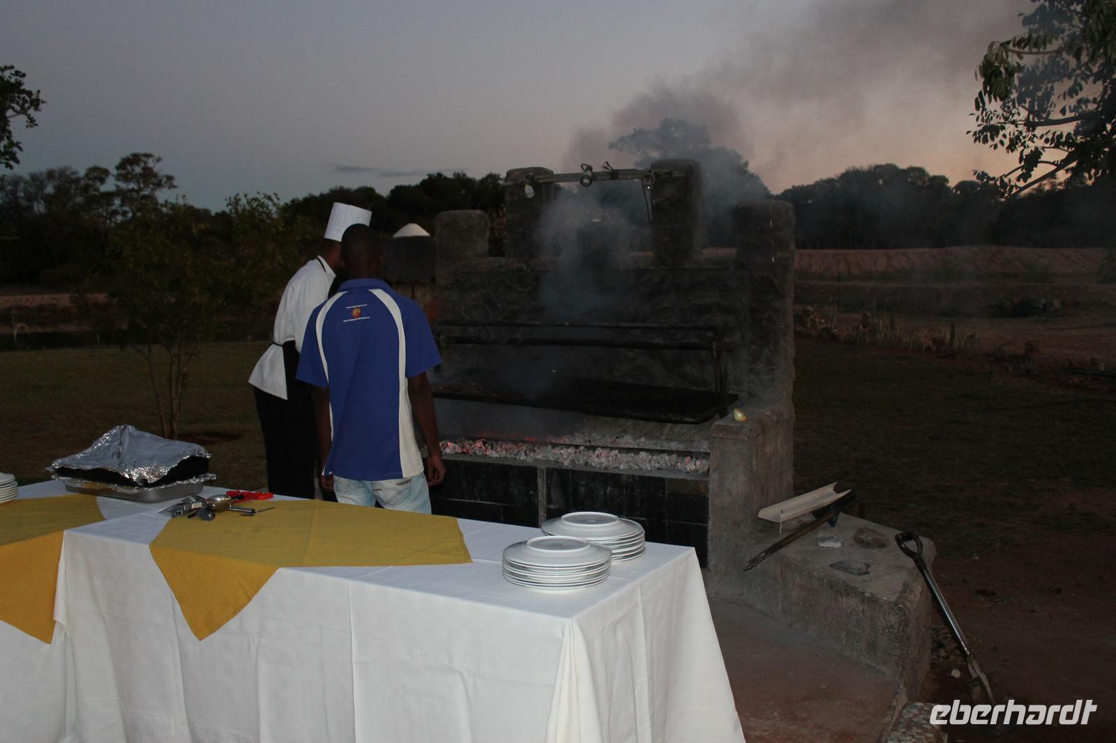 Am Morgen treffen wir uns um 07:00 Uhr in der Früh um zusammen mit Tom eine Pirsch zu Fuß zu unternehmen. Wir beginnen bei strahlendem Sonnenschein einen ausführlichen zweistündigen Spaziergang und sehen dabei unter anderem viele Vögel wie einen Geier und andere Vogelarten. Außerdem einige Impalas und ein Krokodil, welches sich im Limpopo Fluss kurz zeigte. In unserer Lodge zurück angekommen lassen wir uns unser Frühstück mit leckeren Eiern und anderen Köstlichkeiten schmecken. Am Vormittag gönnen wir uns danach eine kurze Pause, bevor uns unsere Jeeps zu einer Safari abholen. Auf unserer ausgiebigen Tour im Limpopo Wildreservat sehen wir unter anderem viele Gnus, Impalas und Kudus. Außerdem führt uns ein kurzer Weg zu Fuß zu zwei Breitmaulnashörnern, die hier zu Hause sind. Wir können die Mutti und Ihr Baby aus nächster Nähe beobachten und fotografieren. Welch ein Glück. Auf dem Rückweg bewundern wir außerdem noch einen Strauß. Den Nachmittag verbringen wir bei dem ein oder anderen Tequila Sunrise in unserer Lodge und lassen die Eindrücke noch einmal Revue passieren. Auch an unserer Lodge gibt es so Einiges zu sehen: z.B. eine Gabelrake und einen Weißkopfadler. Am Abendist ein Barbecue der aller feinsten Sorte für uns angerichtet. Unter freiem Sternenhimmel genießen wir unter anderem Impala Steak frisch vom Grill, Pab mit Tomatensoße, lecker gegrillte Würstchen sowie eine Pilzsuppe mit selbst gebackenem Brot. Natürlich werden wieder einige lustige Gespräche bei einem kühlen Windhoek Bier oder einem Glas Wein geführt. Natürlich immer mit der Angst im Nacken, dass vielleicht in jedem Moment ein Hippo auf uns zuströmen könnte. Dazu kam es aber nicht. So lassen wir den Abend gemütlich am Lagerfeuer ausklingen und horchen gespannt einer weiteren Geschichte von Nelson Mandela, die uns „Mausi" Tom fein vorträgt. Wieder mal ein gelungener Tag im südlichen Afrika.