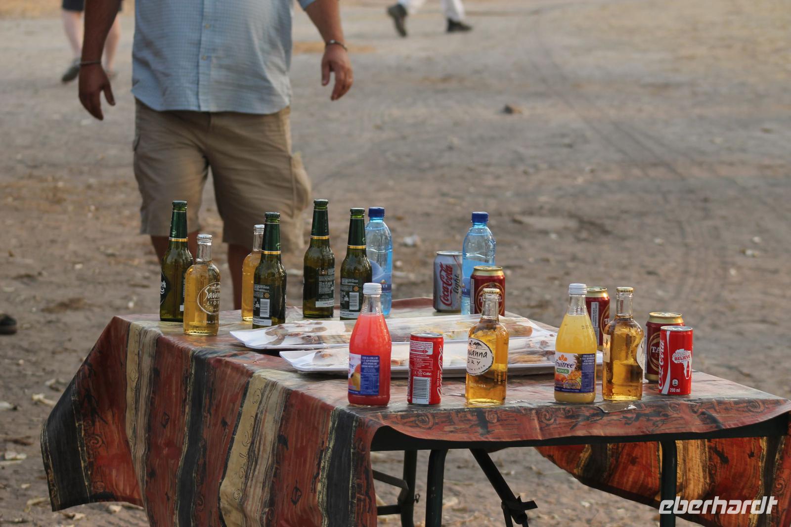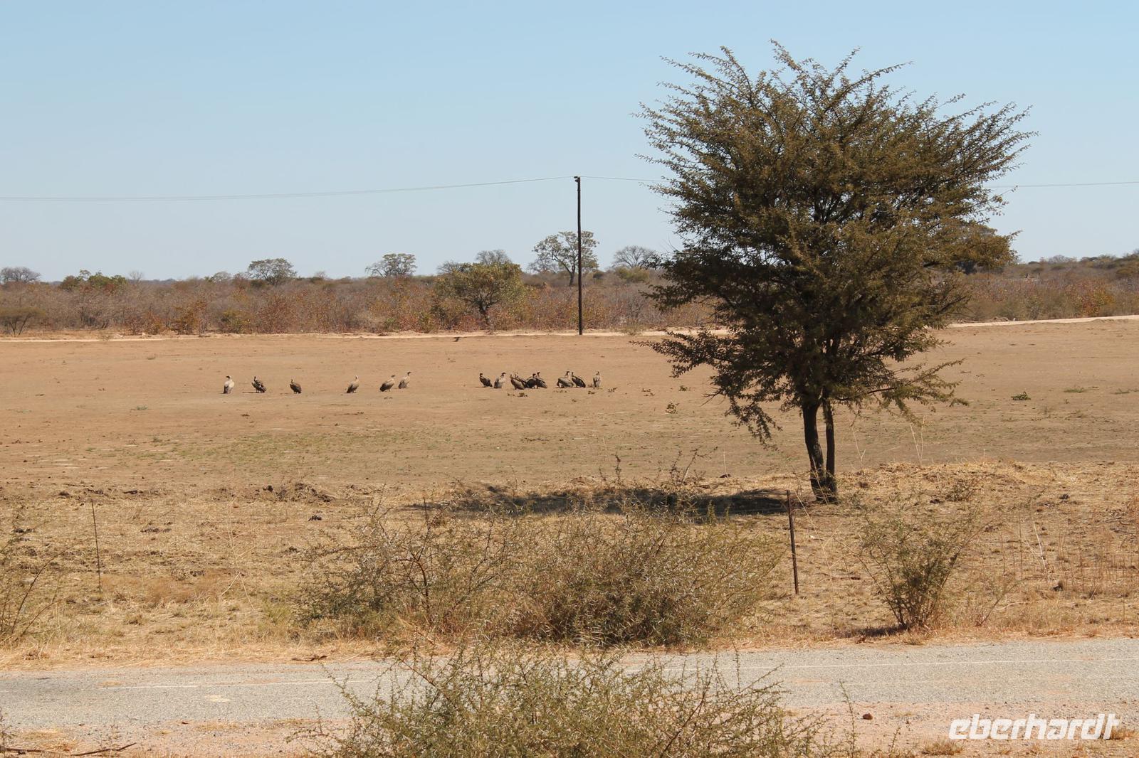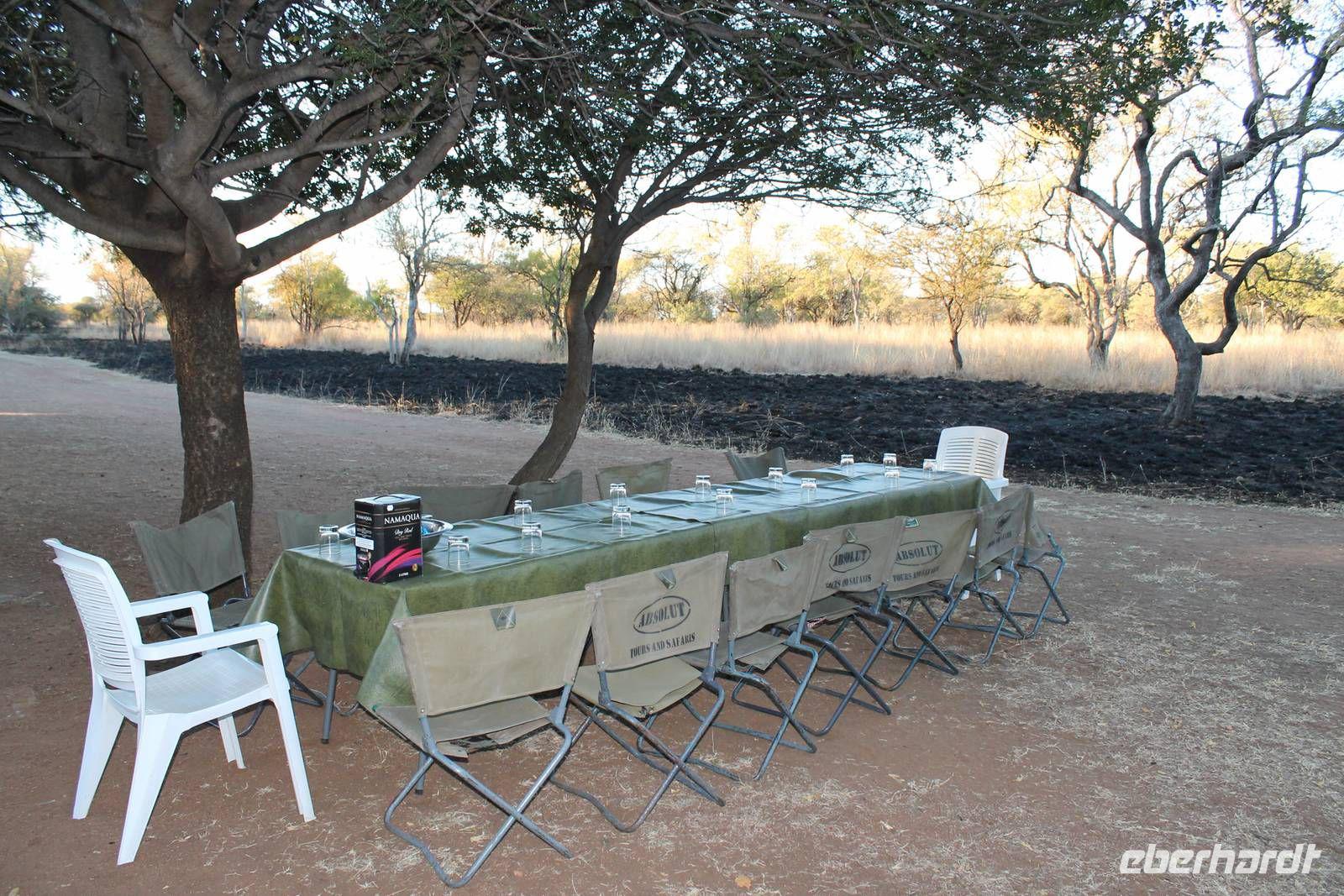 Unsere Reise führt uns weiter bis kurz vor der Grenze zu Botswana, wo wir am schönen Straßenrand ein Picknick aufbauen. Gott sei Dank hat unser Safari Truck immer eine Campingausrüstung dabei und so können wir innerhalb weniger Minuten leckeres Brot mit Aufstrich, Wurst und Käse und andere Köstlichkeiten von Tom genießen. Der Wein